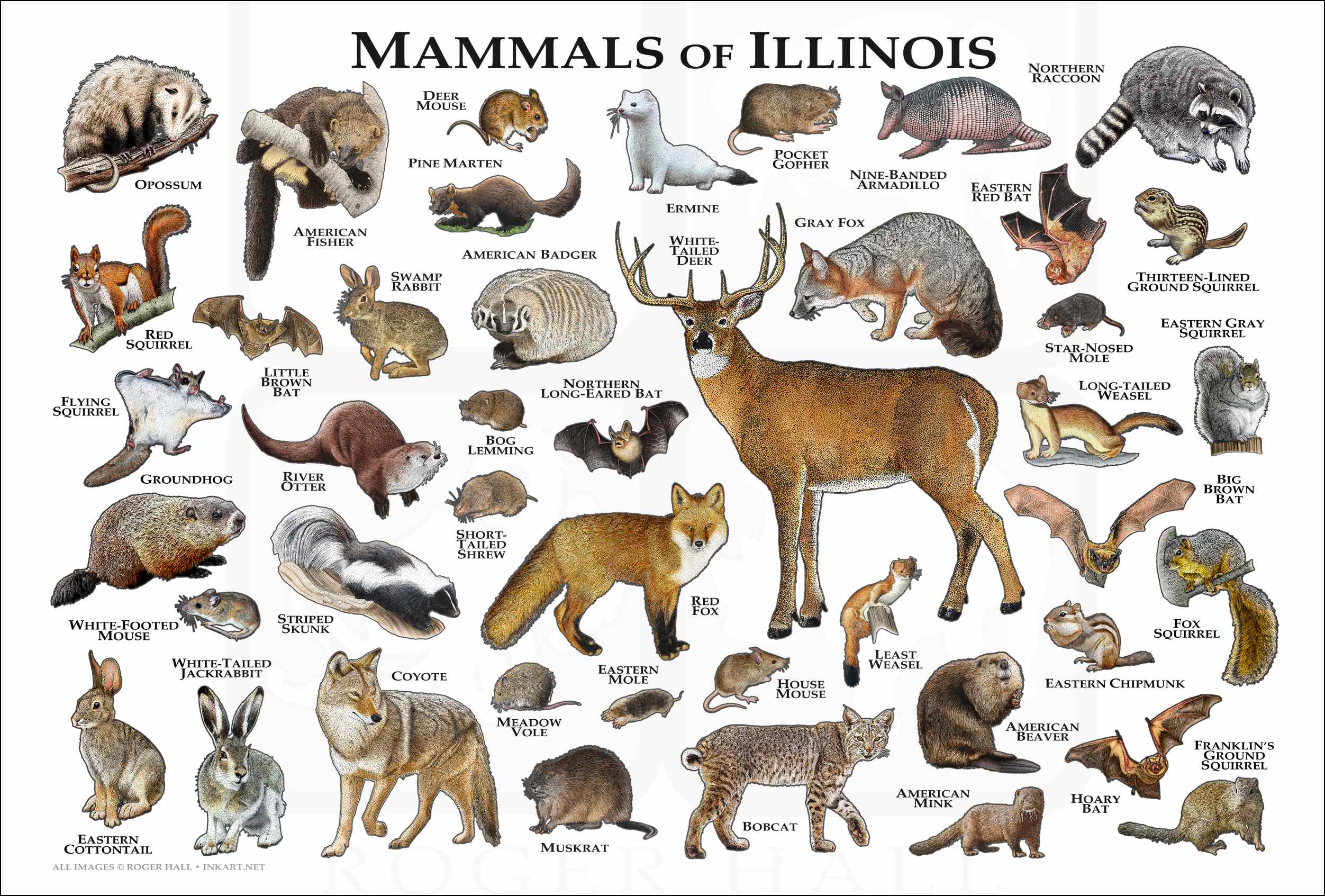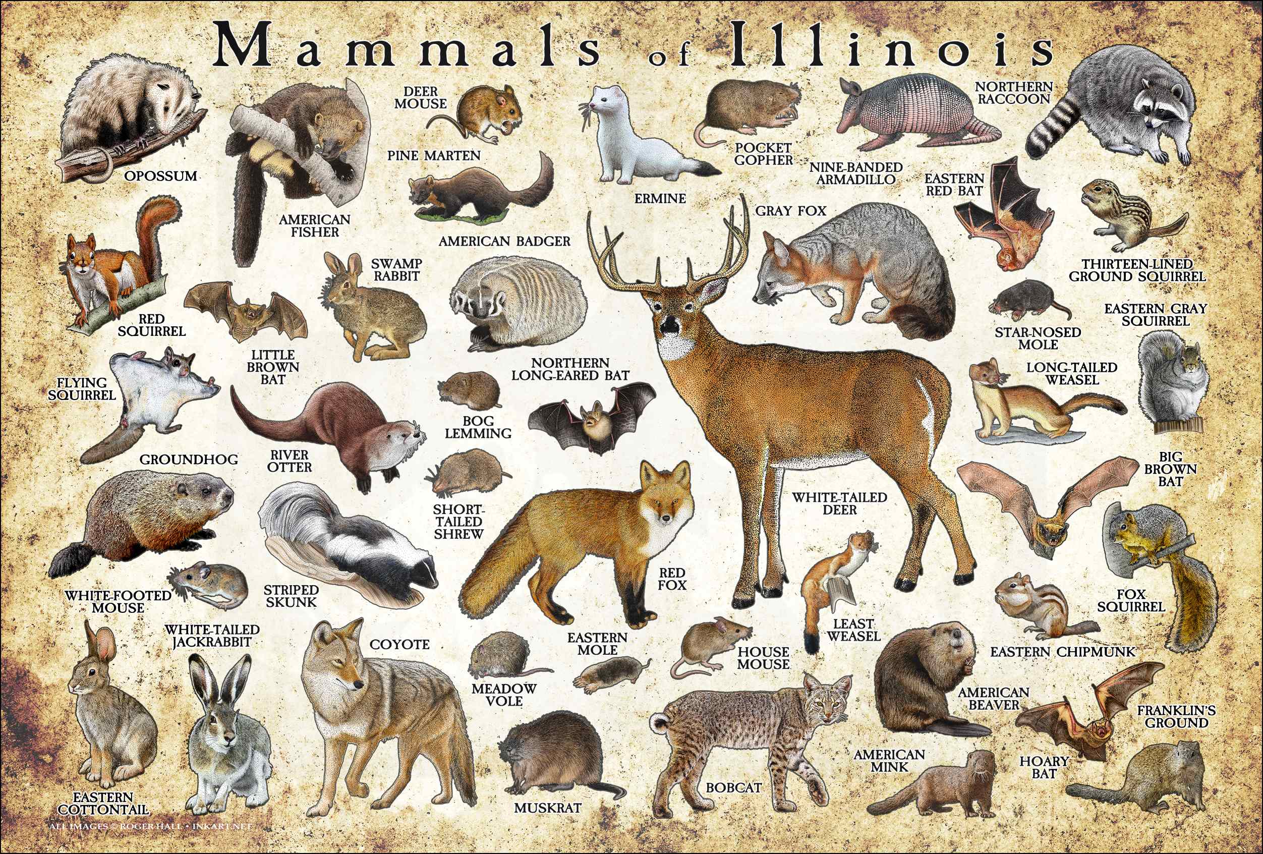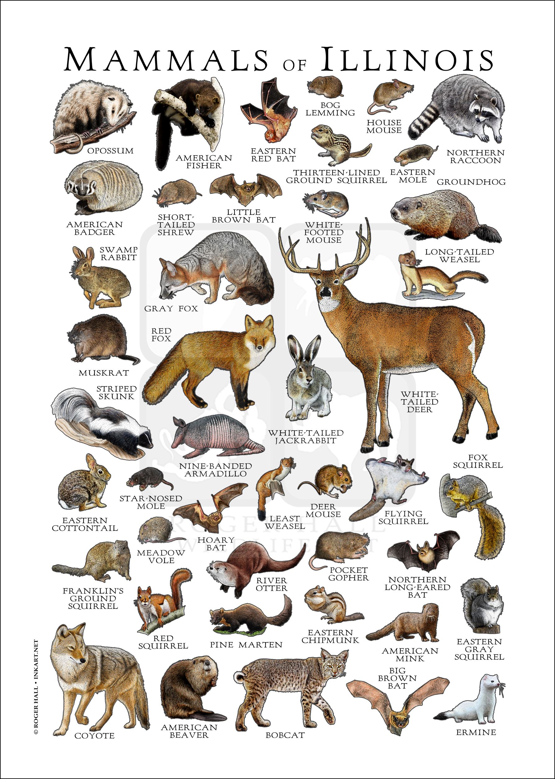 High quality fine art poster featuring all current living genus of mammals in the state of Illinois in the United States. The poster is printed on durable museum quality matte paper.