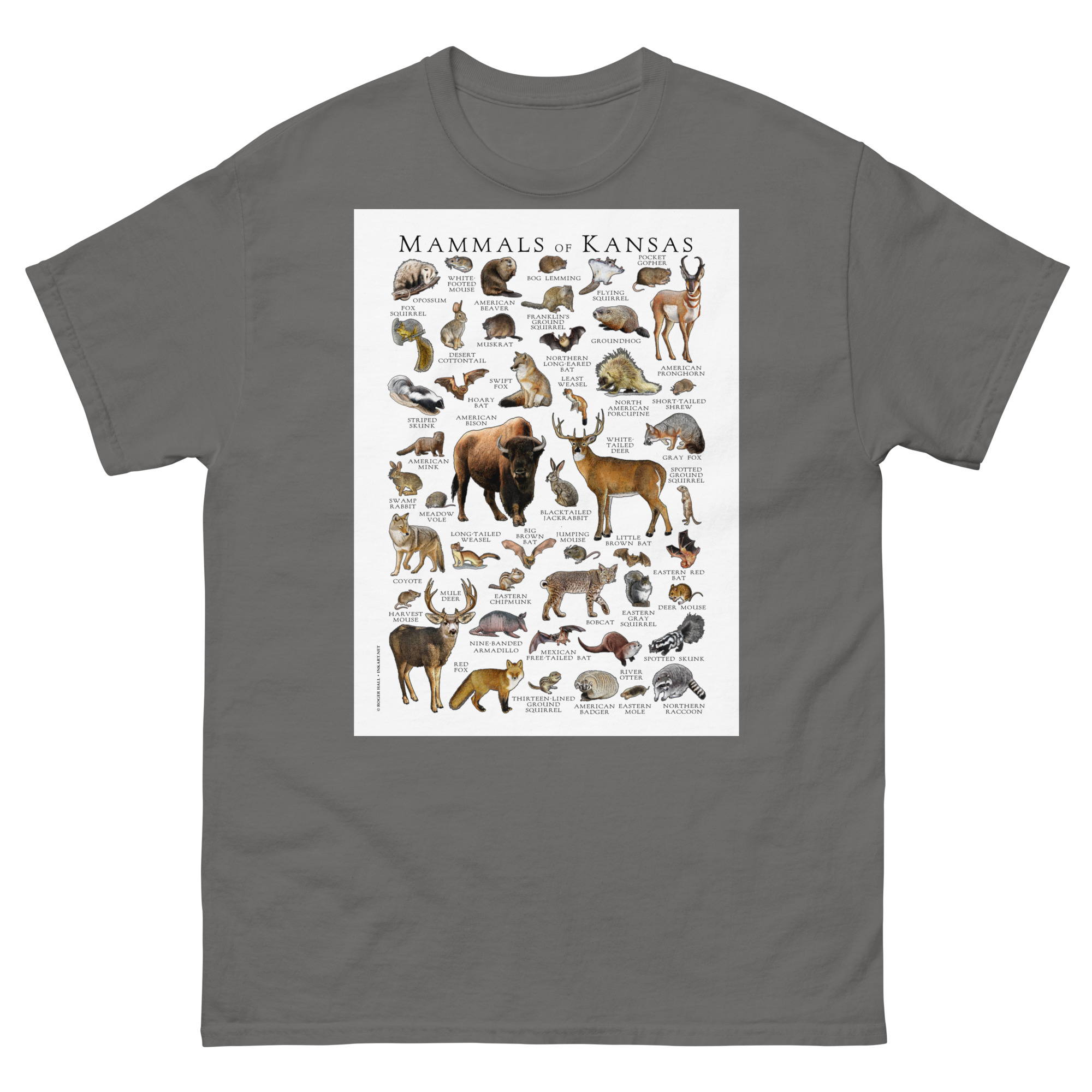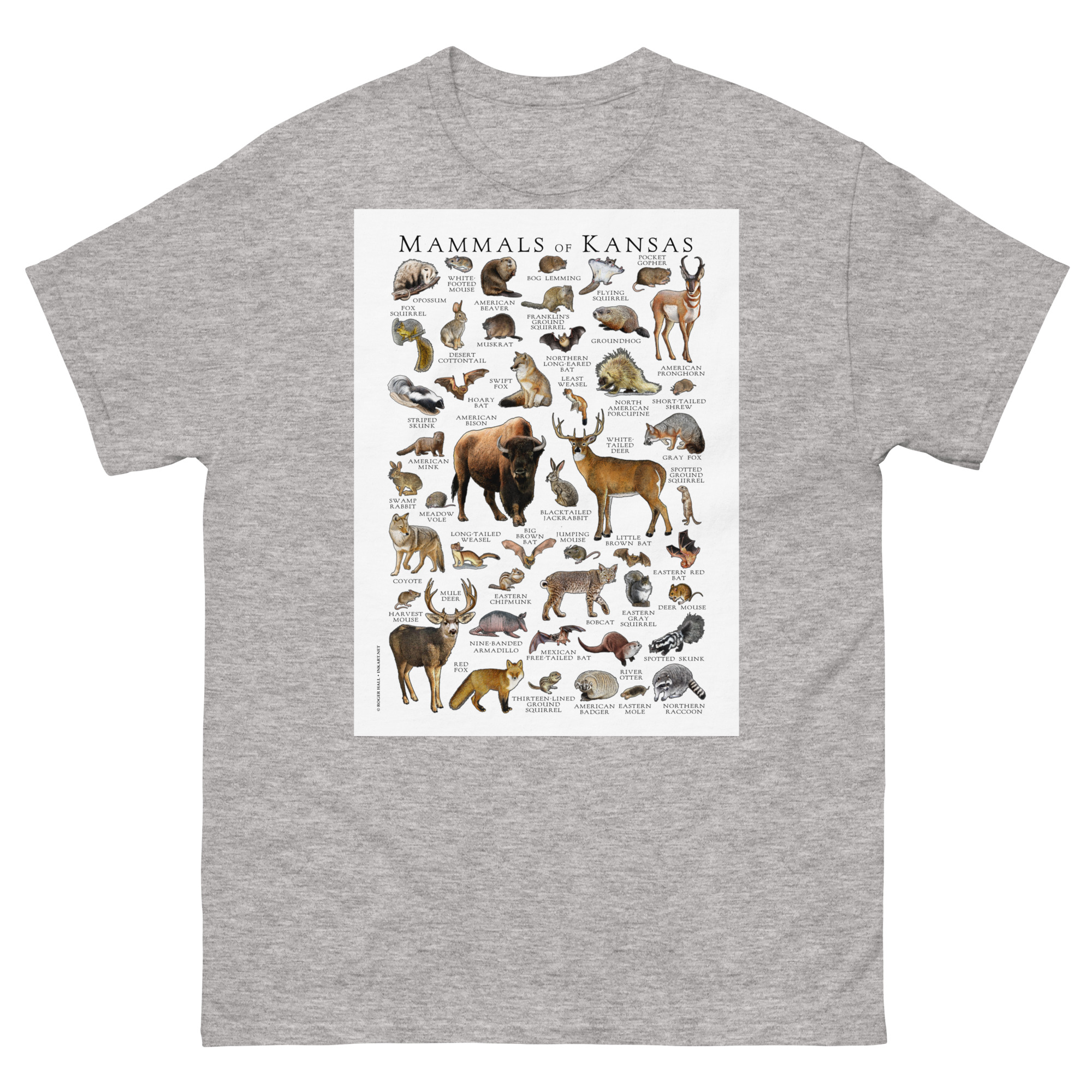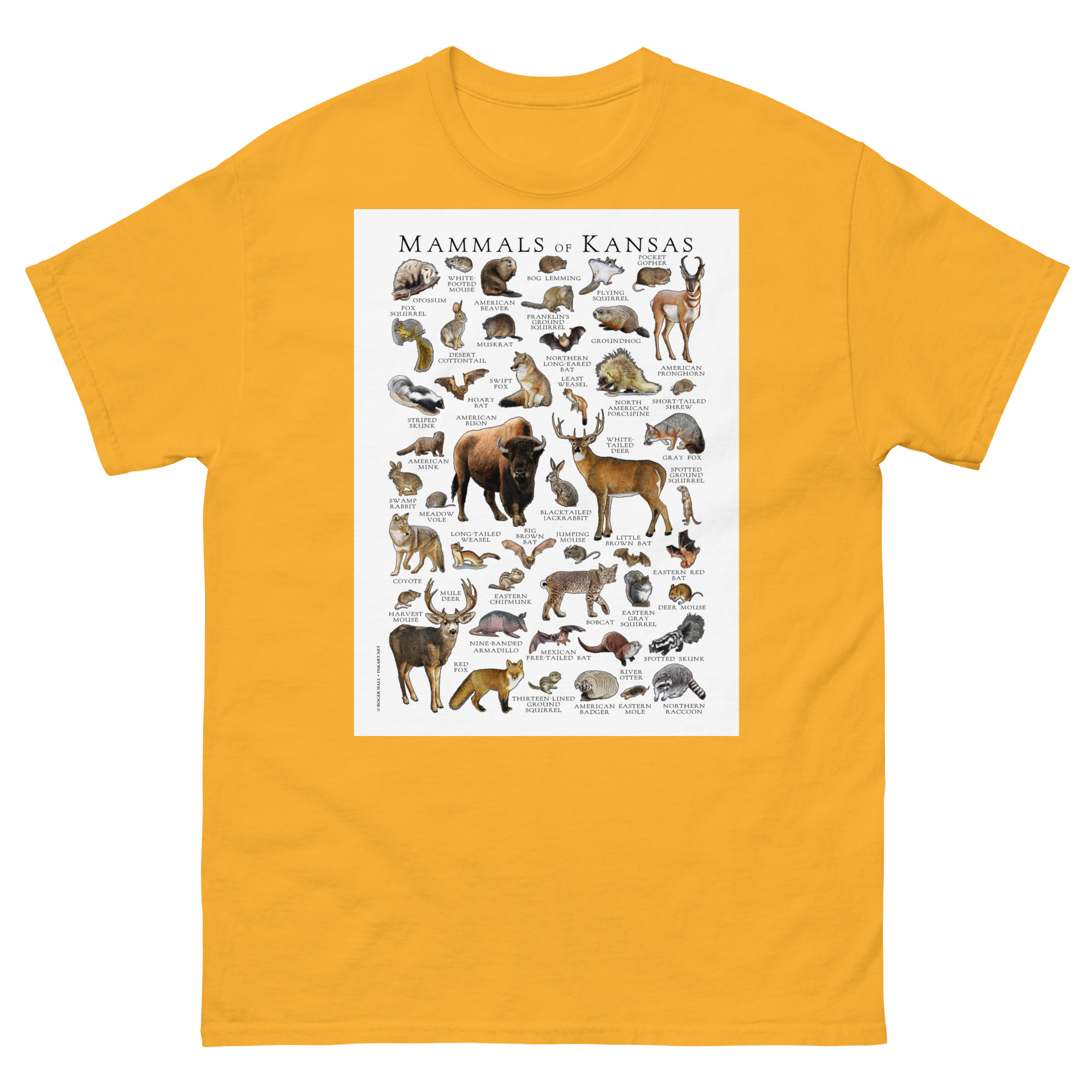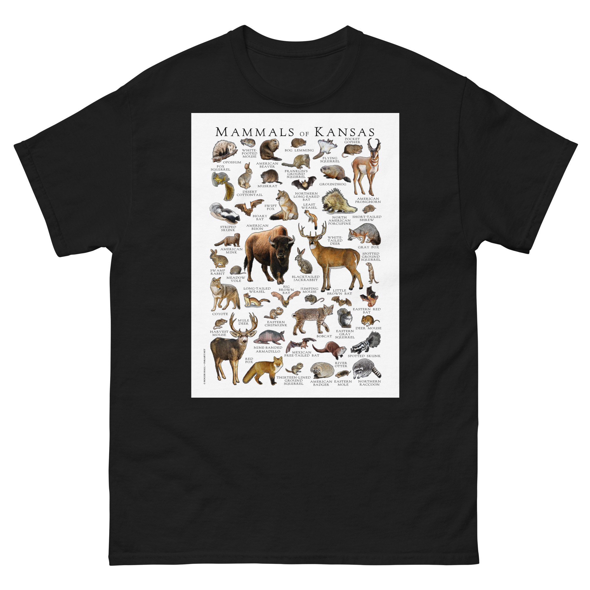 The state of Kansas is home to many amazing mammals. On this layout are many of them, including all genus currently living and native to the state printed on a high-quality 100% men’s cotton t-shirt..