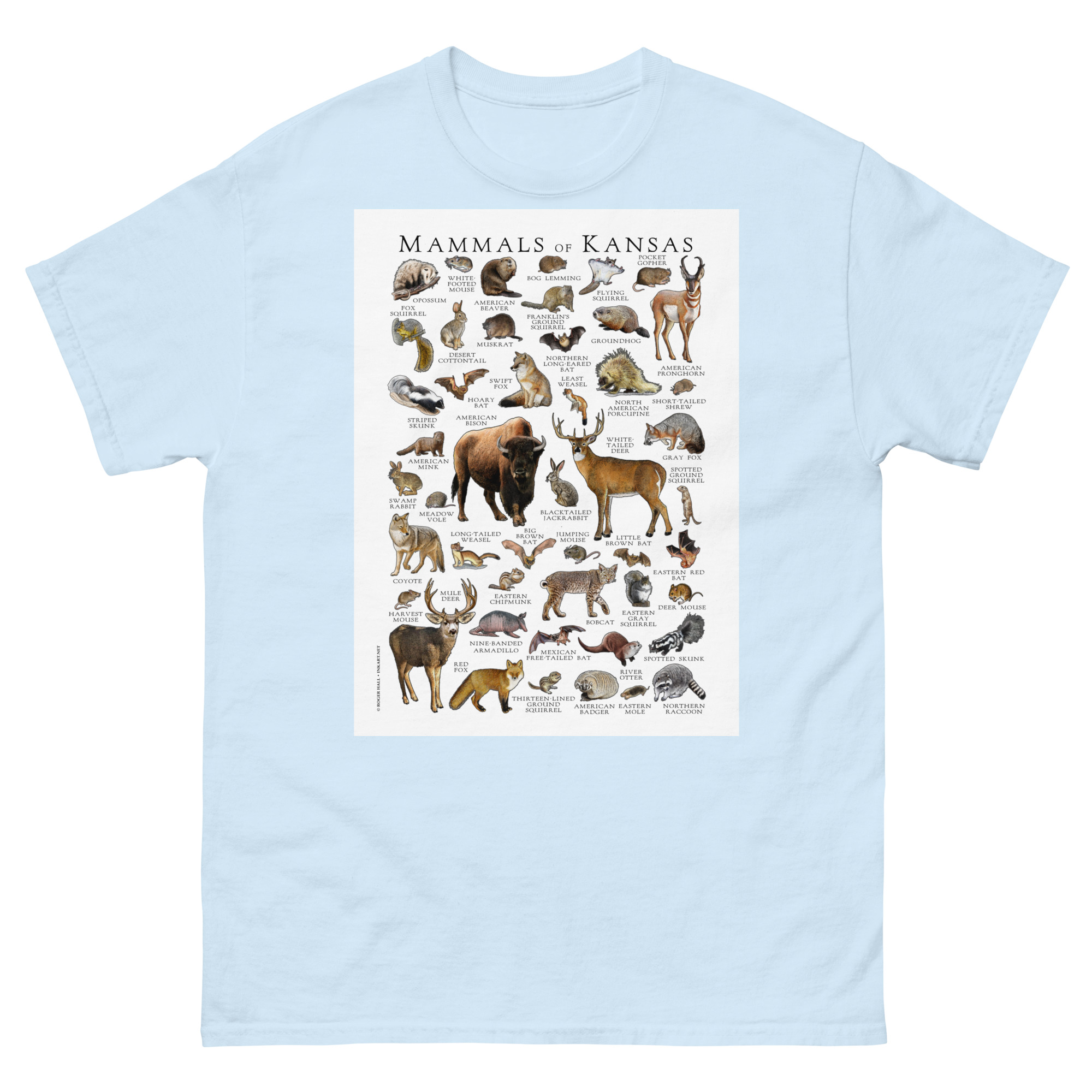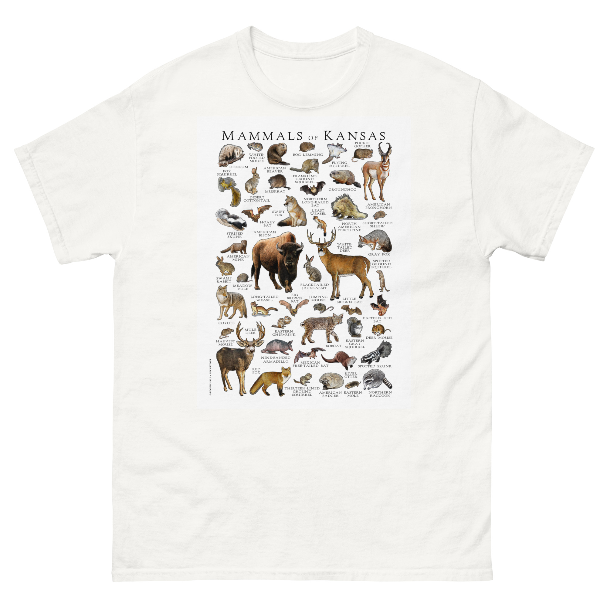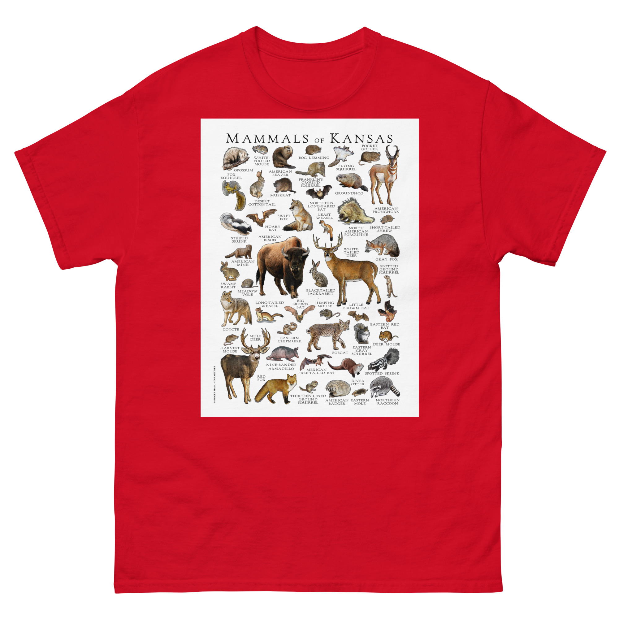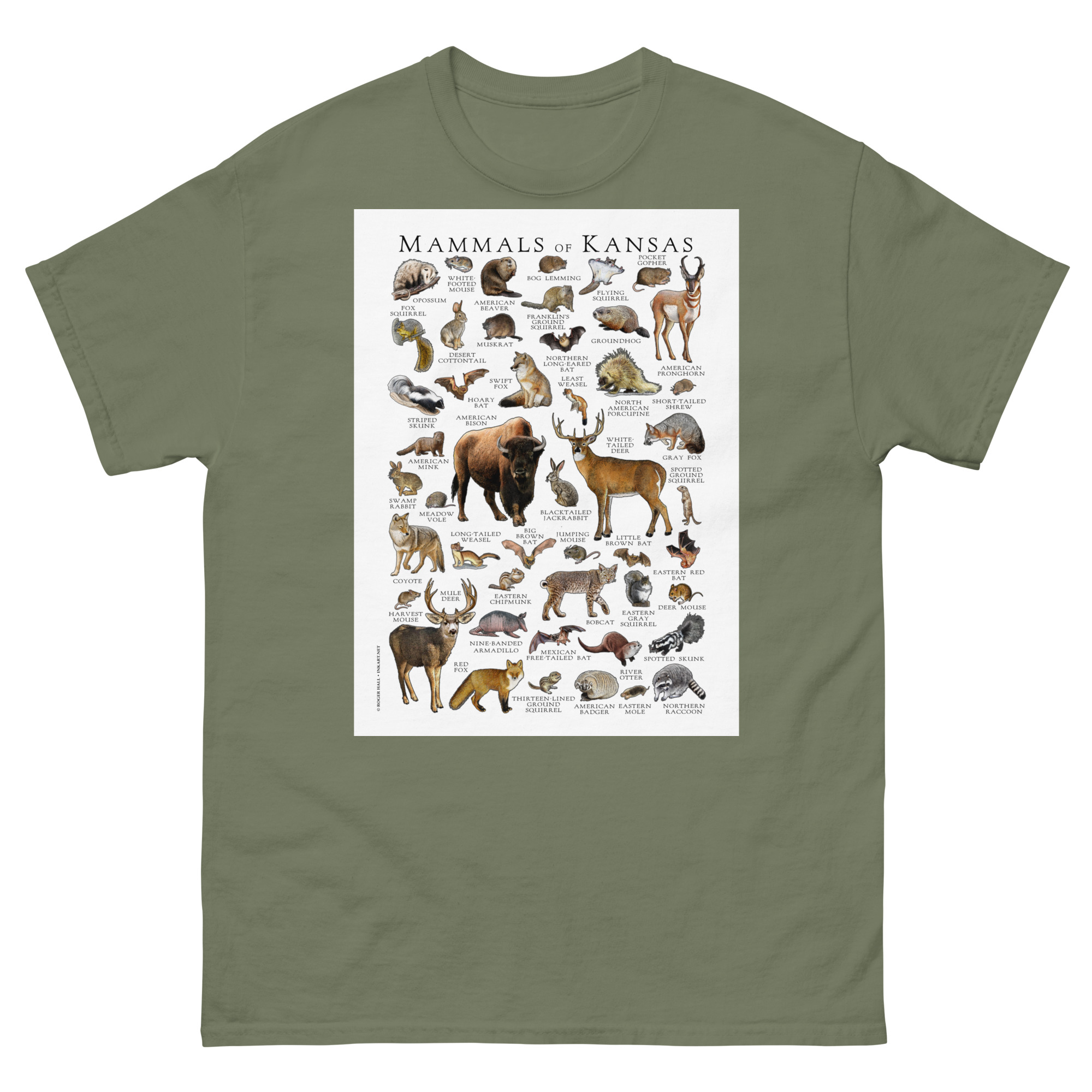 The state of Kansas is home to many amazing mammals. On this layout are many of them, including all genus currently living and native to the state printed on a high-quality 100% men’s cotton t-shirt..