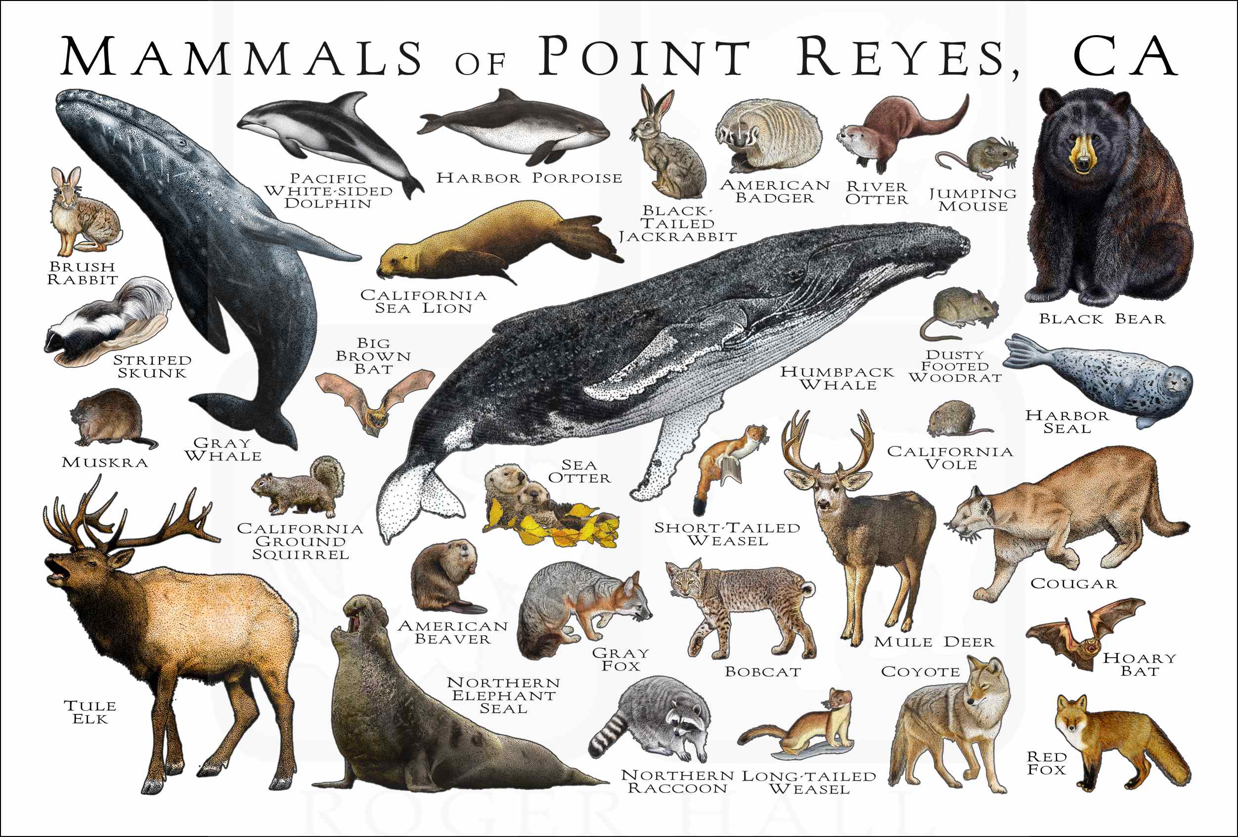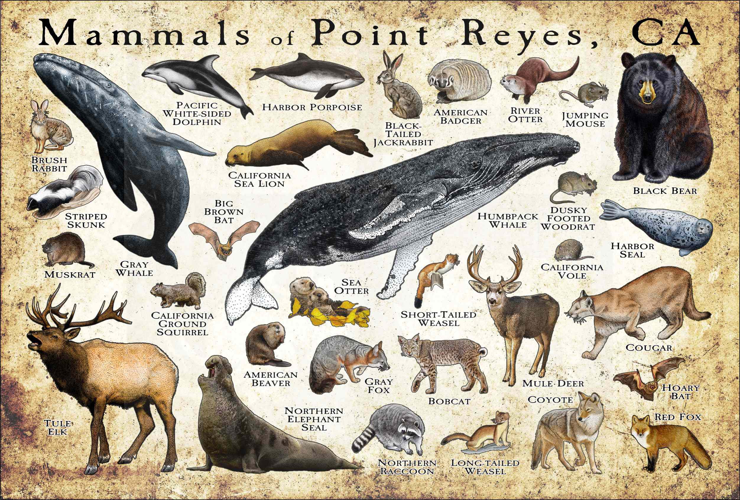Point Reyes National Seashore on the Pacific coast of Northern California is home to many amazing mammals. This poster featuring high quality illustration of many of the species found there.