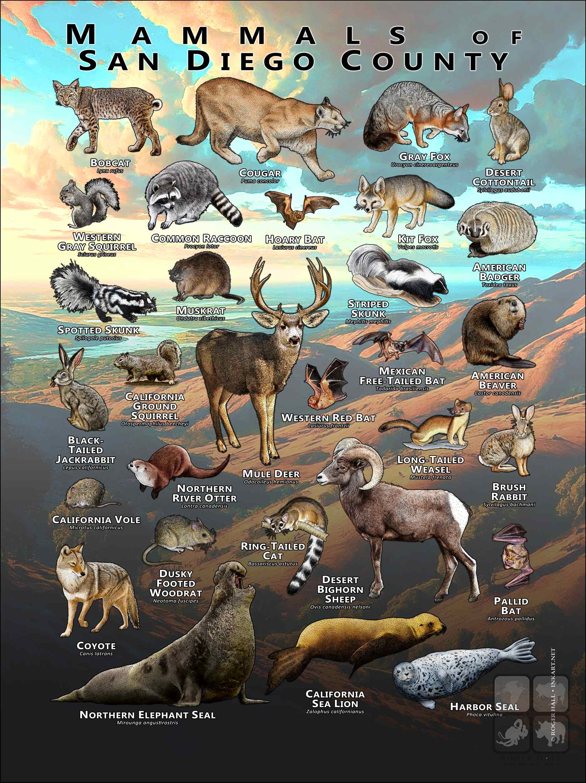 AMERICAN BADGER (Taxidea taxus) • AMERICAN BEAVER (Castor canadensis) • BLACK- TAILED JACKRABBIT (Lepus californicus) • BOBCAT (Lynx rufus) • BRUSH RABBIT (Sylvilagus bachmani) • CALIFORNIA GROUND SQUIRREL (Otospermophilus beecheyi) • CALIFORNIA SEA LION (Zalophus californianus) • COMMON RACCOON (Procyon lotor) • COUGAR (Puma concolor) • COYOTE (Canis latrans) • DESERT COTTONTAIL (Sylvilagus audubonii) • DUSKY-FOOTED WOODRAT (Neotoma fuscipes) • GRAY FOX (Urocyon cinereoargenteus) • HARBOR SEAL (Phoca vitulina) • HOARY BAT (Lasiurus cinereus) • KIT FOX (Vulpes macrotis) • LONG-TAILED WEASEL (Mustela frenata) • MULE DEER (Odocoileus hemionus) • MUSKRAT (Ondatra zibethicus) • NORTHERN ELEPHANT SEAL (Mirounga angustirostris) • NORTHERN RIVER OTTER (Lontra canadensis) • PALLID BAT (Antrozous pallidus) • RING-TAILED CAT (Bassariscus astutus) • SPOTTED SKUNK (Spilogale putorius) • STRIPED SKUNK (Mephitis mephitis) • WESTERN GRAY SQUIRREL (Sciurus griseus)