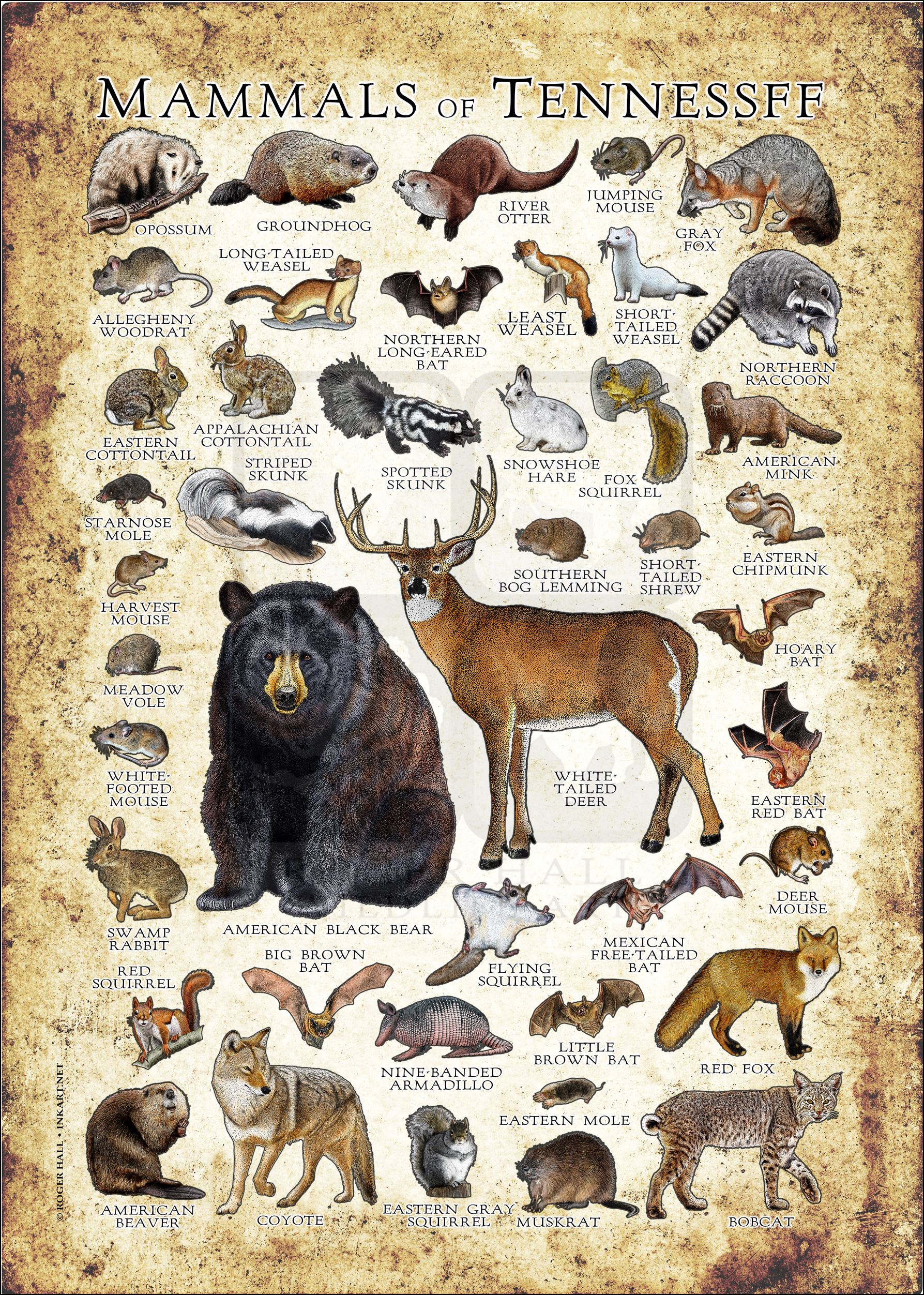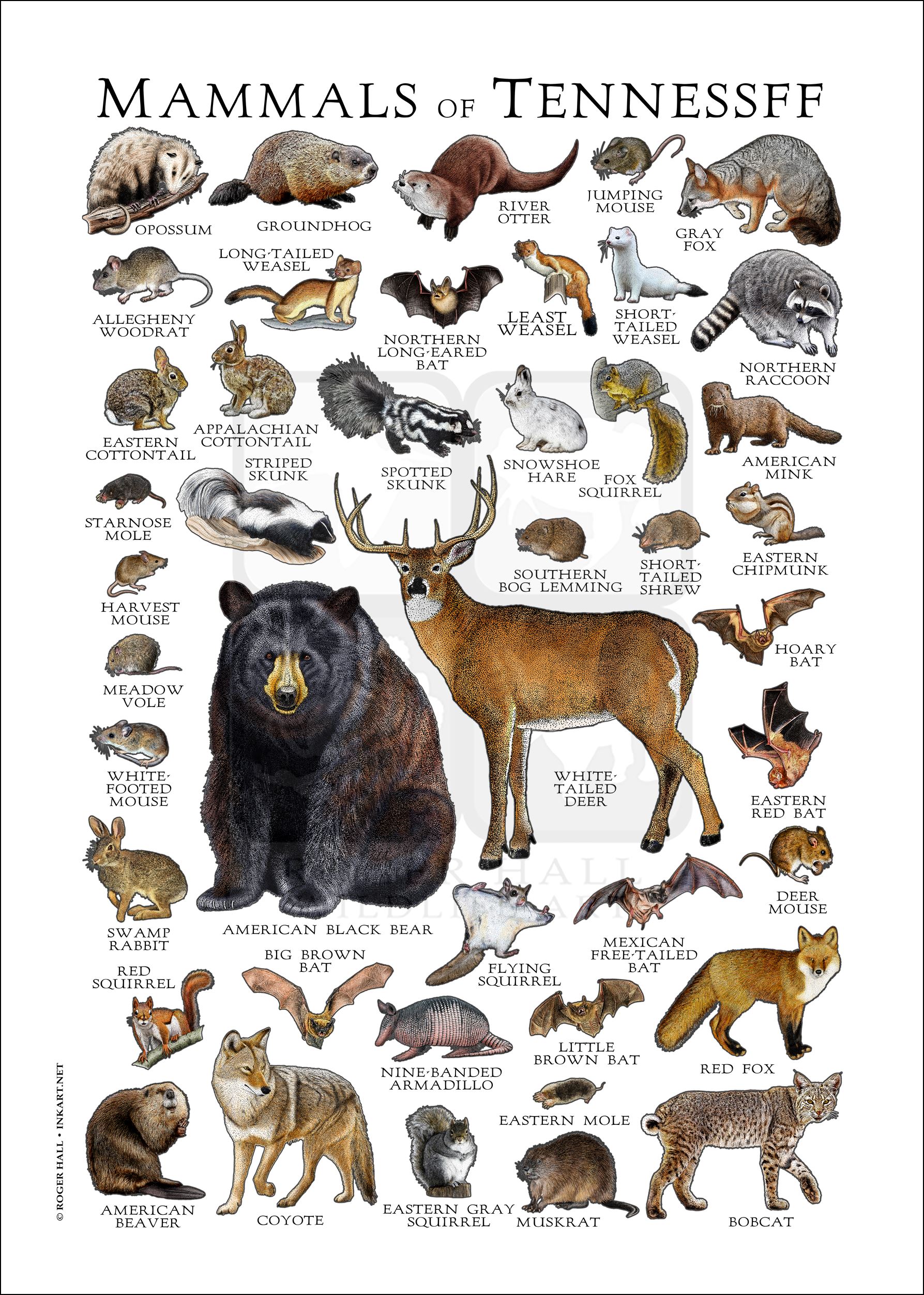 High quality fine art poster featuring all current living genus of mammals in the state of Tennessee in the United States. The poster is printed on durable museum quality matte paper.