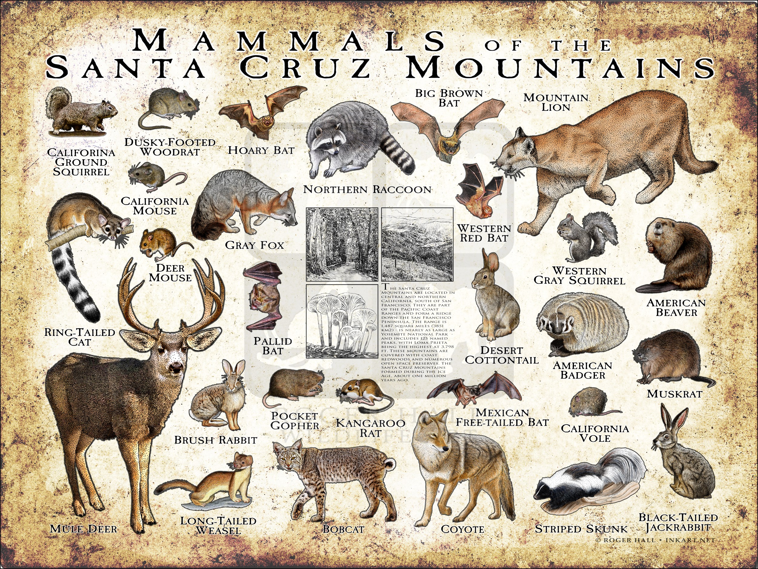 Poster design featuring various mammals native to Santa Cruz Mountains in California:
