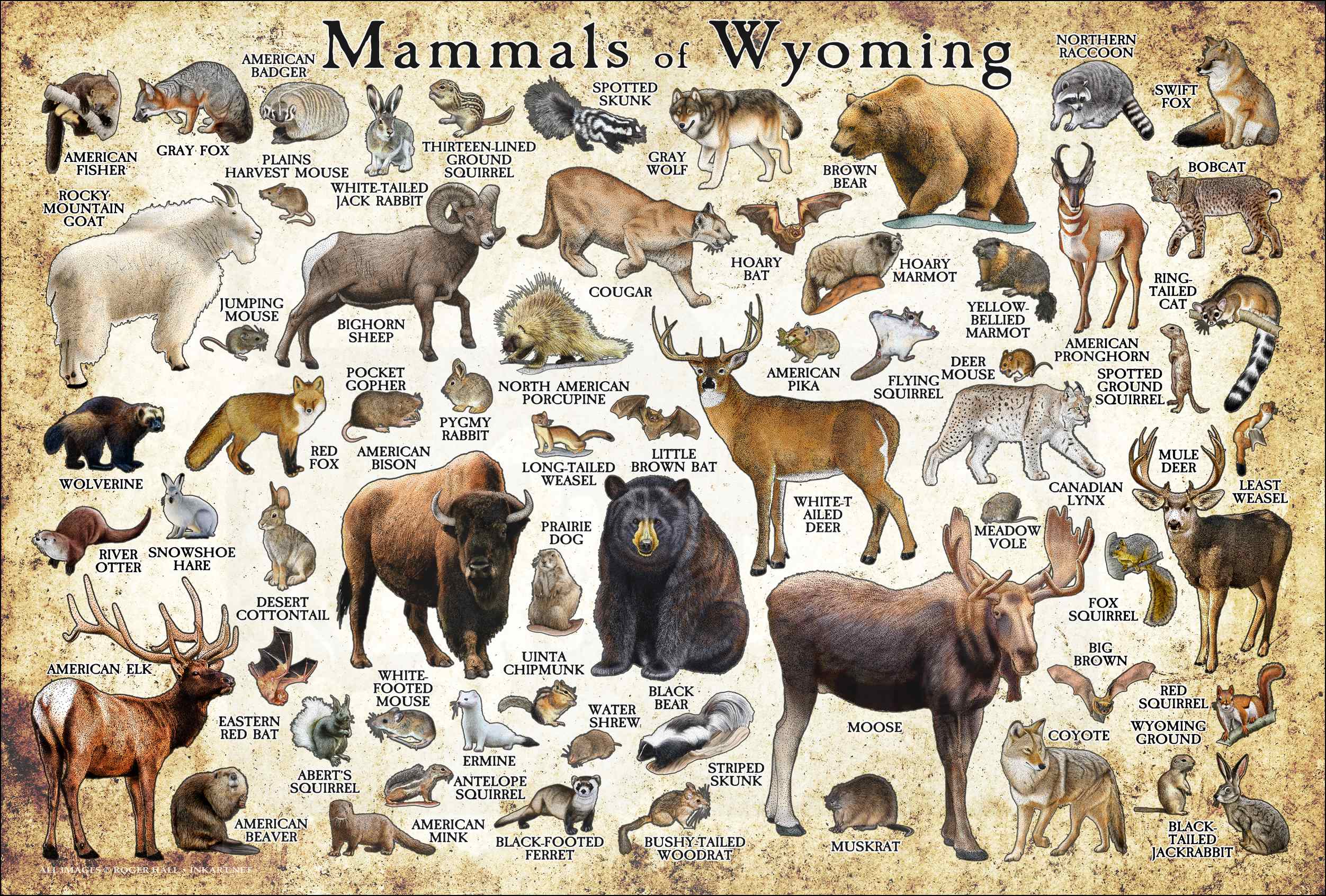 High quality fine art poster featuring all current living genus of mammals in the state of Wyoming in the United States. The poster is printed on durable museum quality matte paper.
