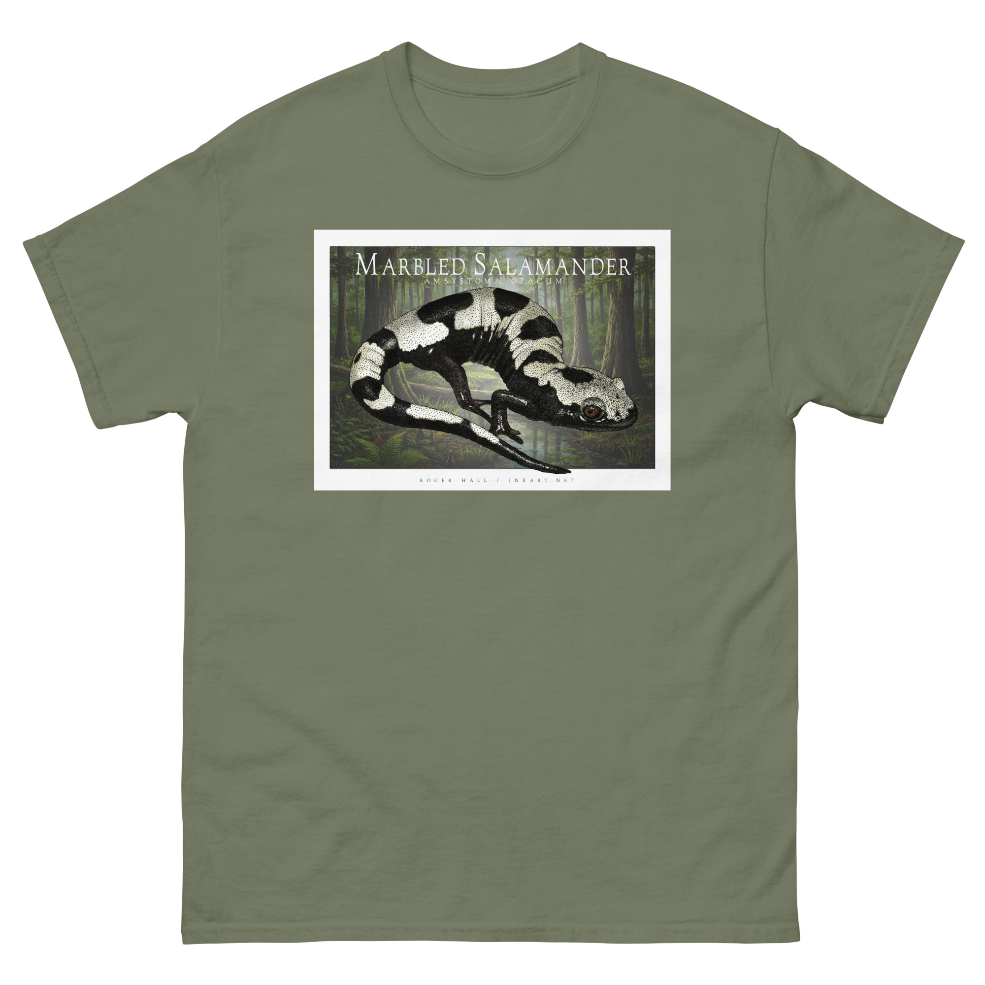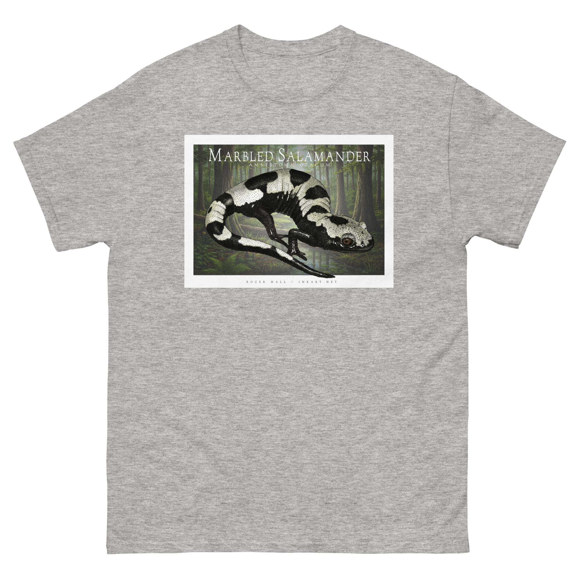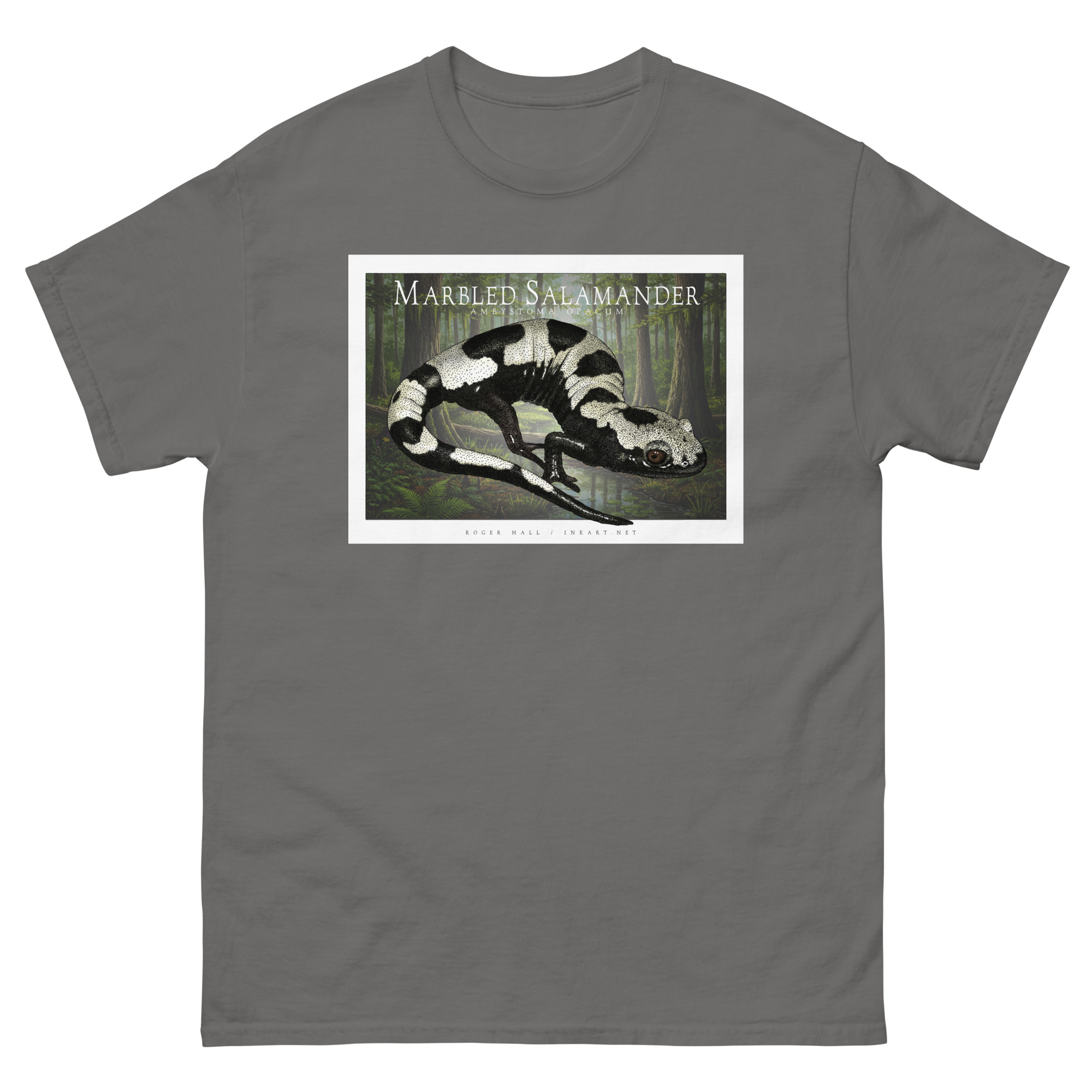 Scientifically accurate drawing of a Marbled Salamander (Ambystoma opacum.) The illustration of a printed on a high-quality 100% unisex cotton t-shirt.