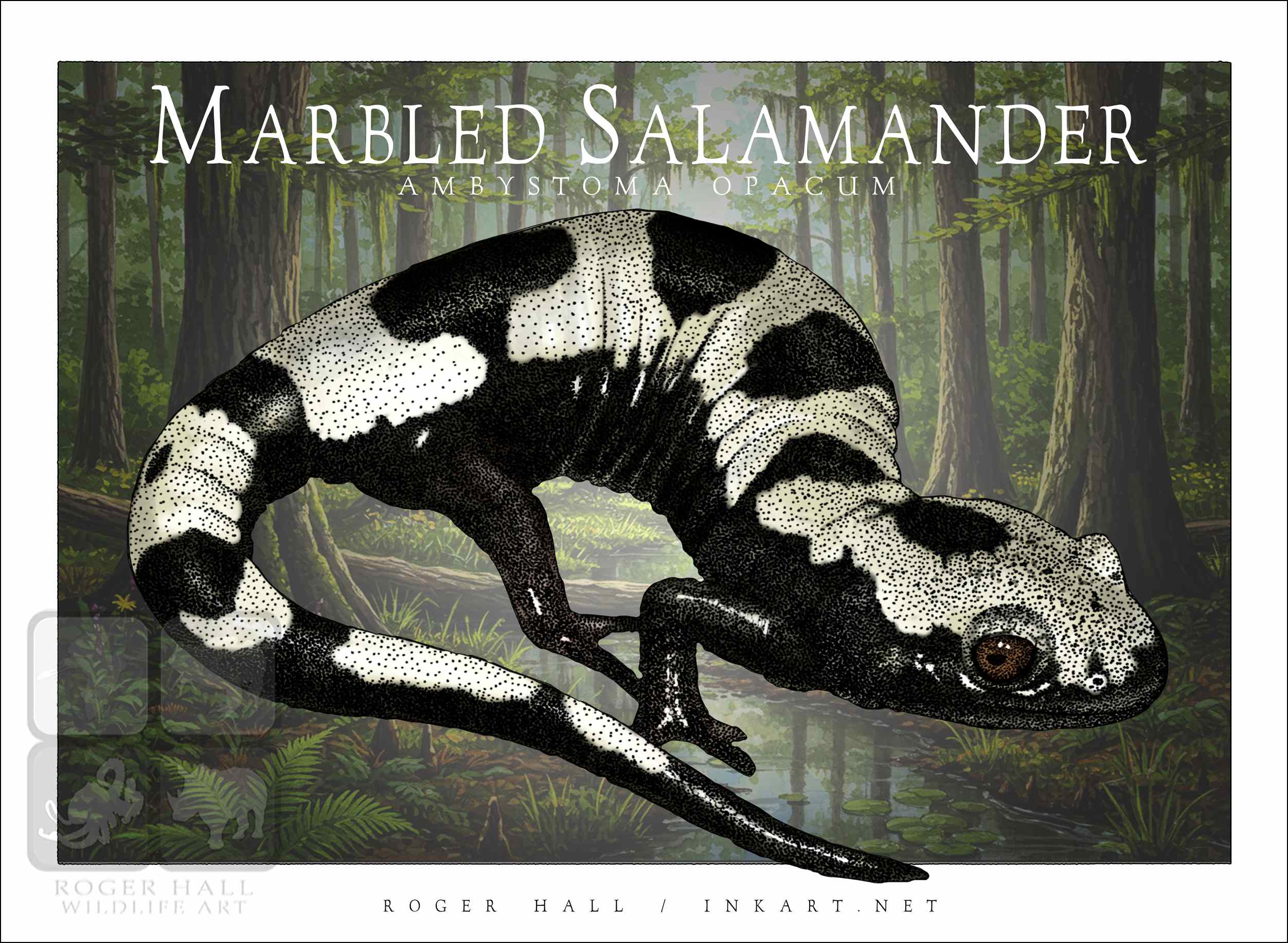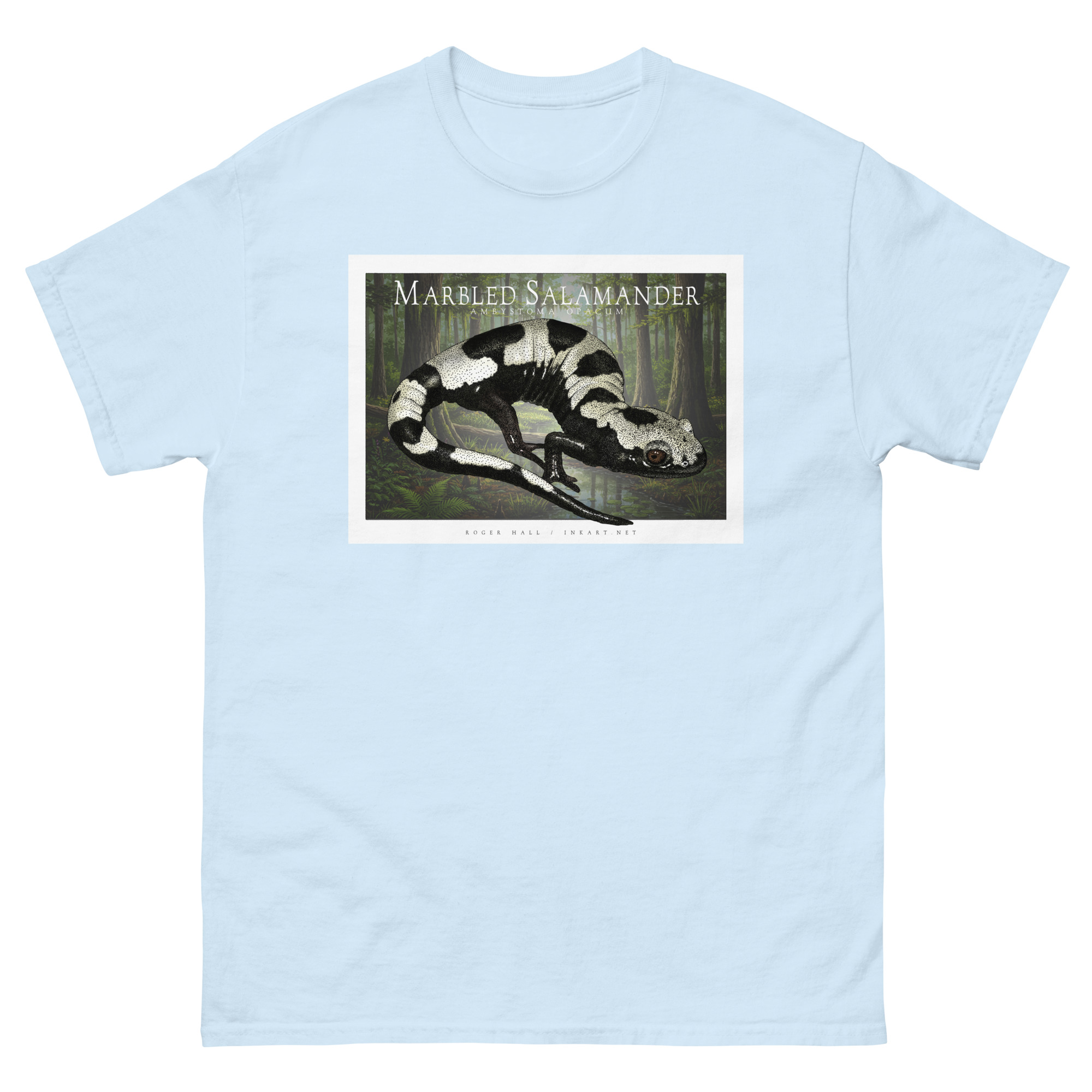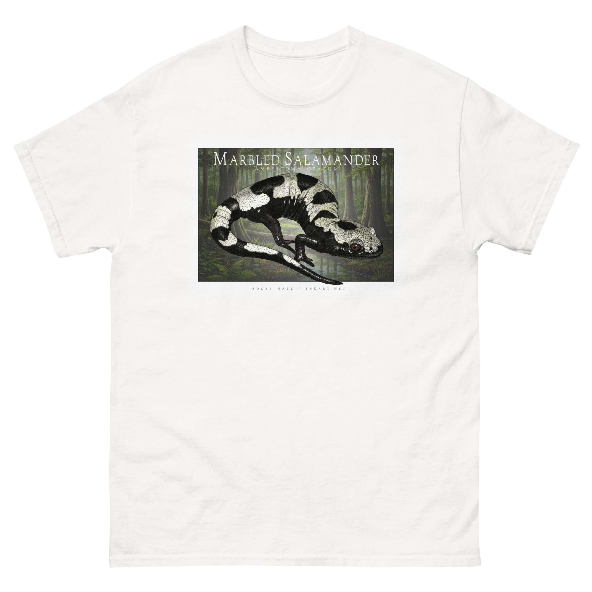 Scientifically accurate drawing of a Marbled Salamander (Ambystoma opacum.) The illustration of a printed on a high-quality 100% unisex cotton t-shirt.