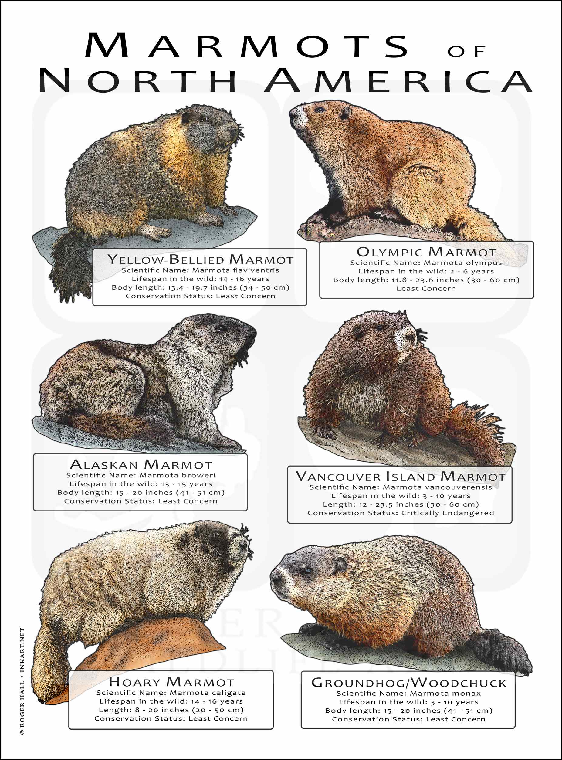 There are six species of marmot native to North America. Of the six, only the Vancouver Island Marmot is considered threatened. Marmots are the largest members of the squirrel family and found only in North America, Europe and Asia. They feed mostly on grasses, leaves, flowers, and seeds. The poster print features a fine art illustration of all species of North American Marmot