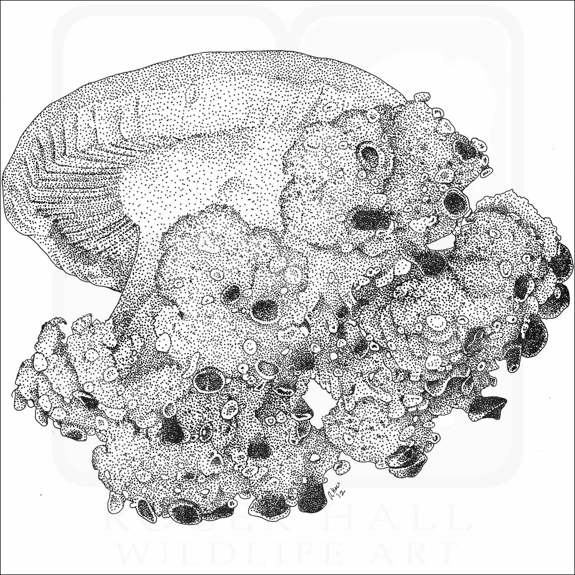 Fine art illustration of a Mediterranean Jellyfish (Cotylorhiza tuberculata.) The illustration is available in black and white or color.