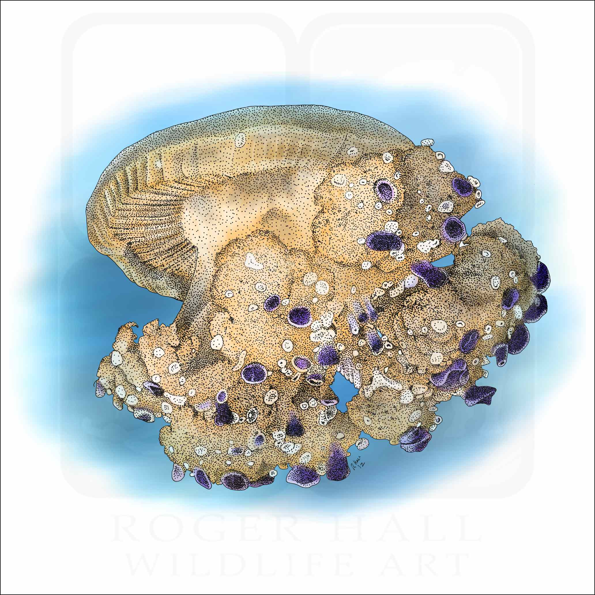 Tags: animal renderings, Cotylorhiza tuberculata, fine art print, fried egg jellyfish, jellyfish, Mediterranean jellyfish, picture, realistic drawing, scientific illustration, sketch, wildlife art