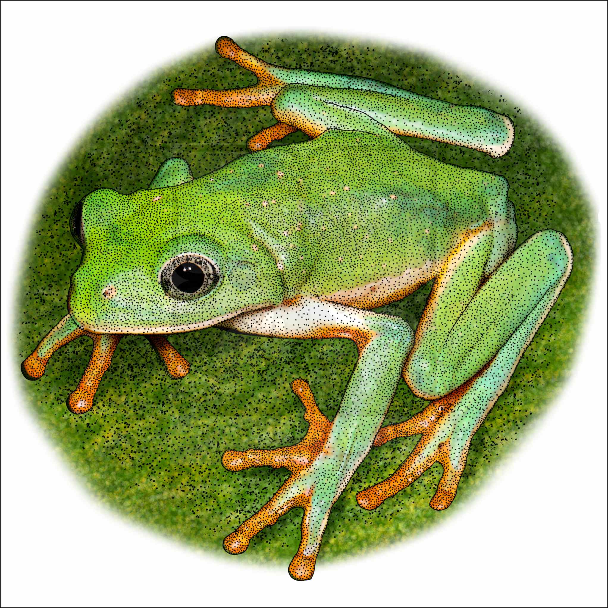 Fine art illustration of a Mexican Leaf Frog (Agalychnis dacnicolor.) The illustration is available in black and white or color.