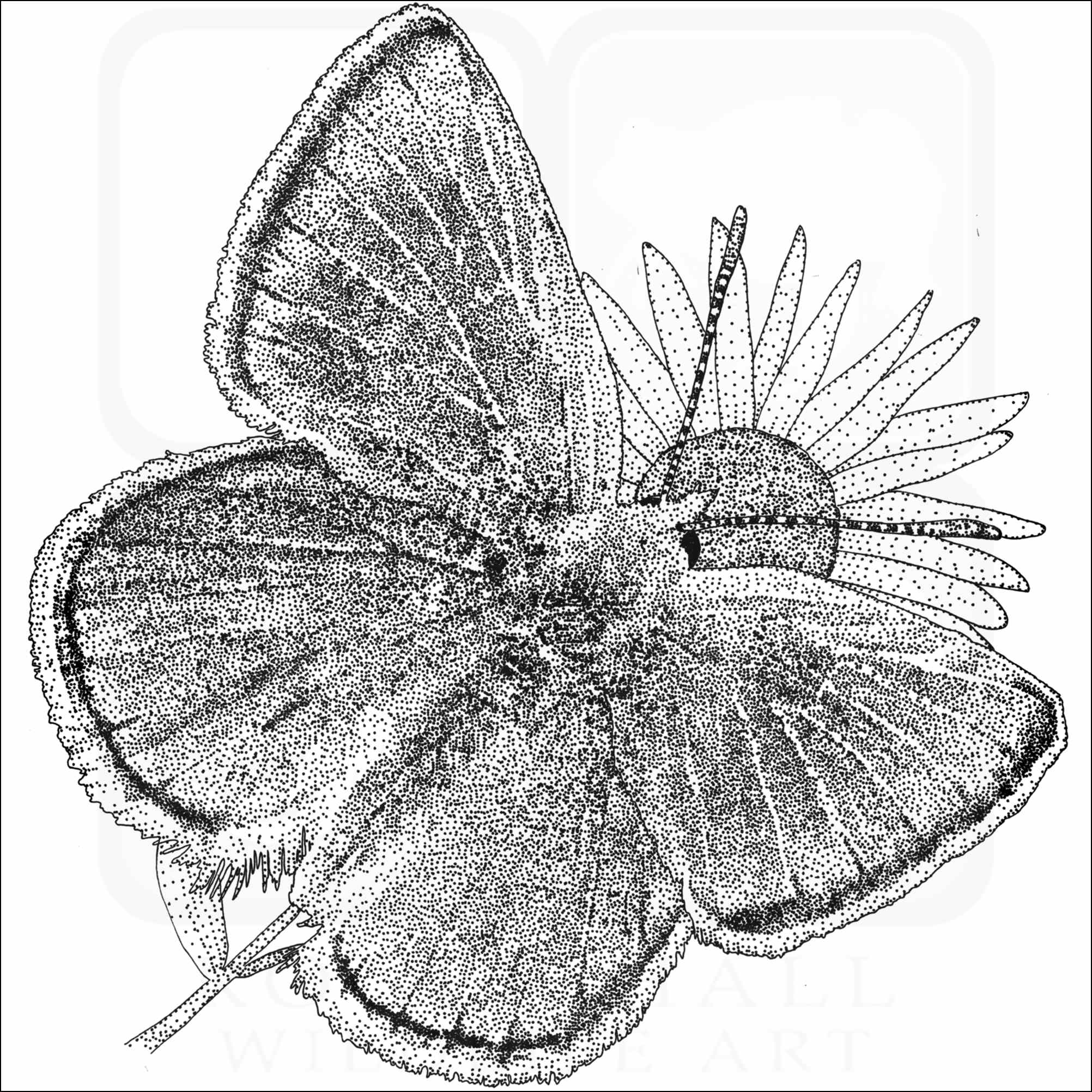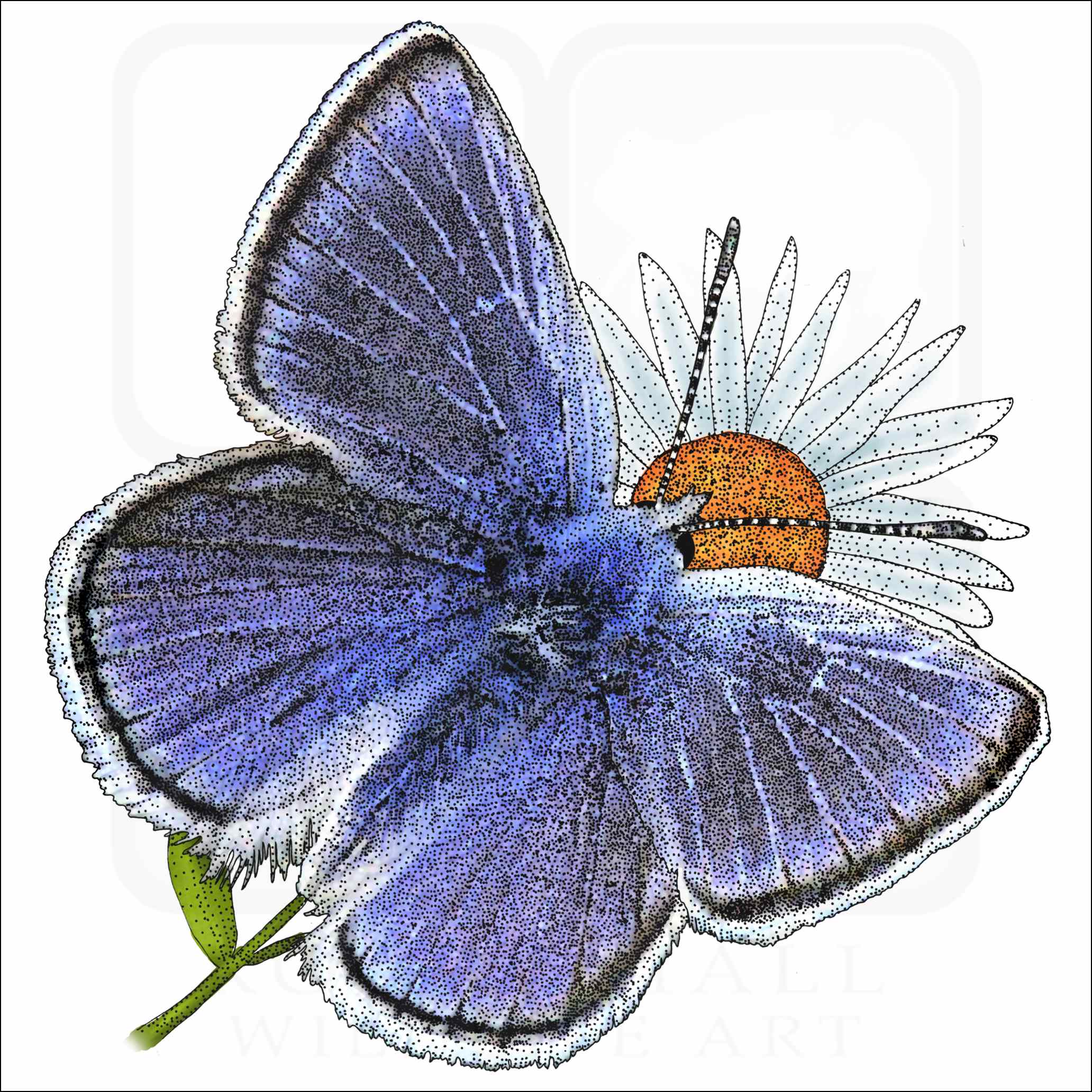 Fine art illustration of a Mission Blue Butterfly (Icaricia icarioides missionensis.) The illustration is available in black and white or color.