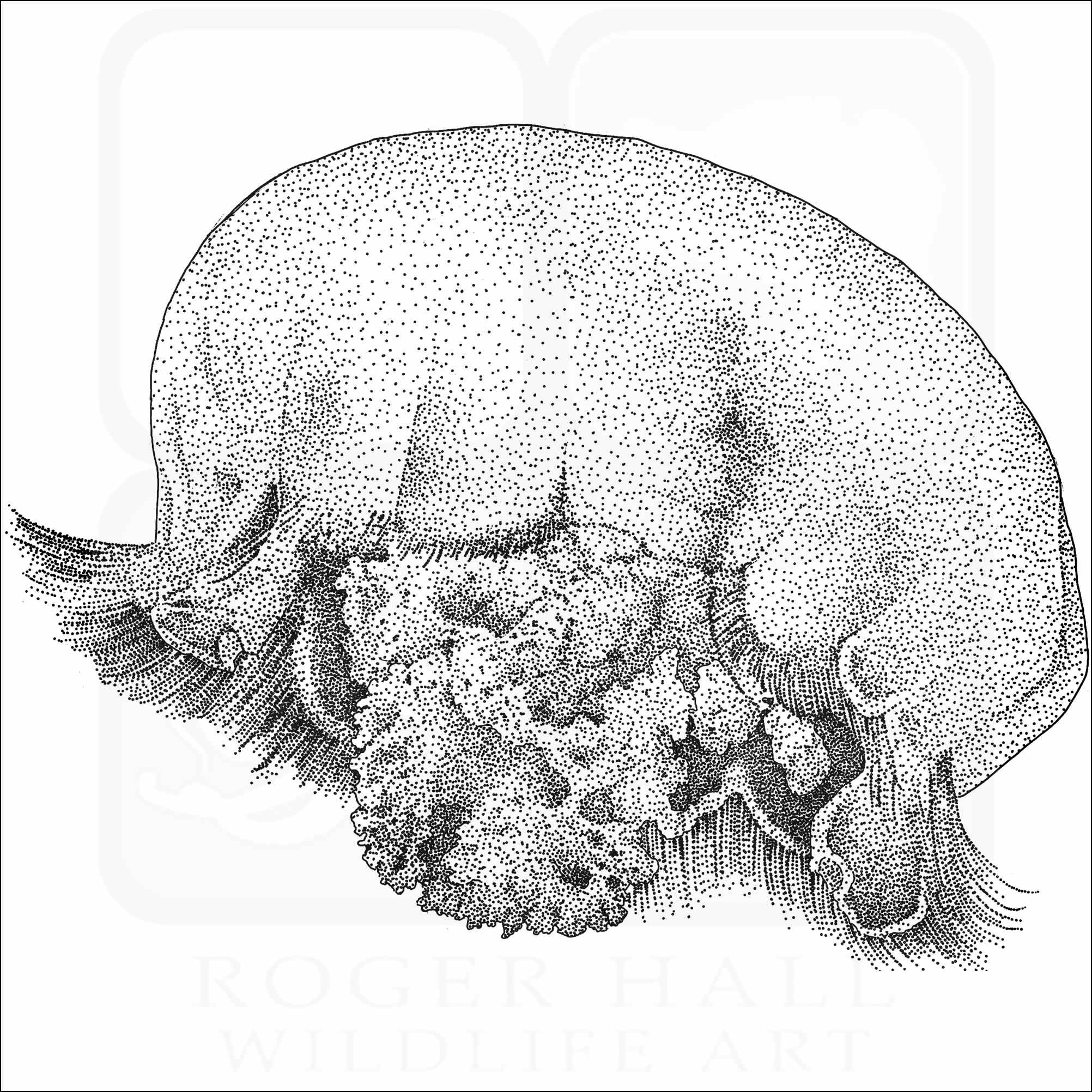 The Moon Jellyfish was completed on 11.20.2011. Mostly translucent animal, such as jellyfish, can be pretty tricky to render, when the foundation of the drawing is black ink. Usually, I have to get a little creative and make a somewhat unreal image. Although the illustration is still scientifically accurate. One method to make an underwater animal pop a little bit off the page is to give it a slight luminescence, such as this jelly has. The drawing is based on a photo by Charlene-SJ.