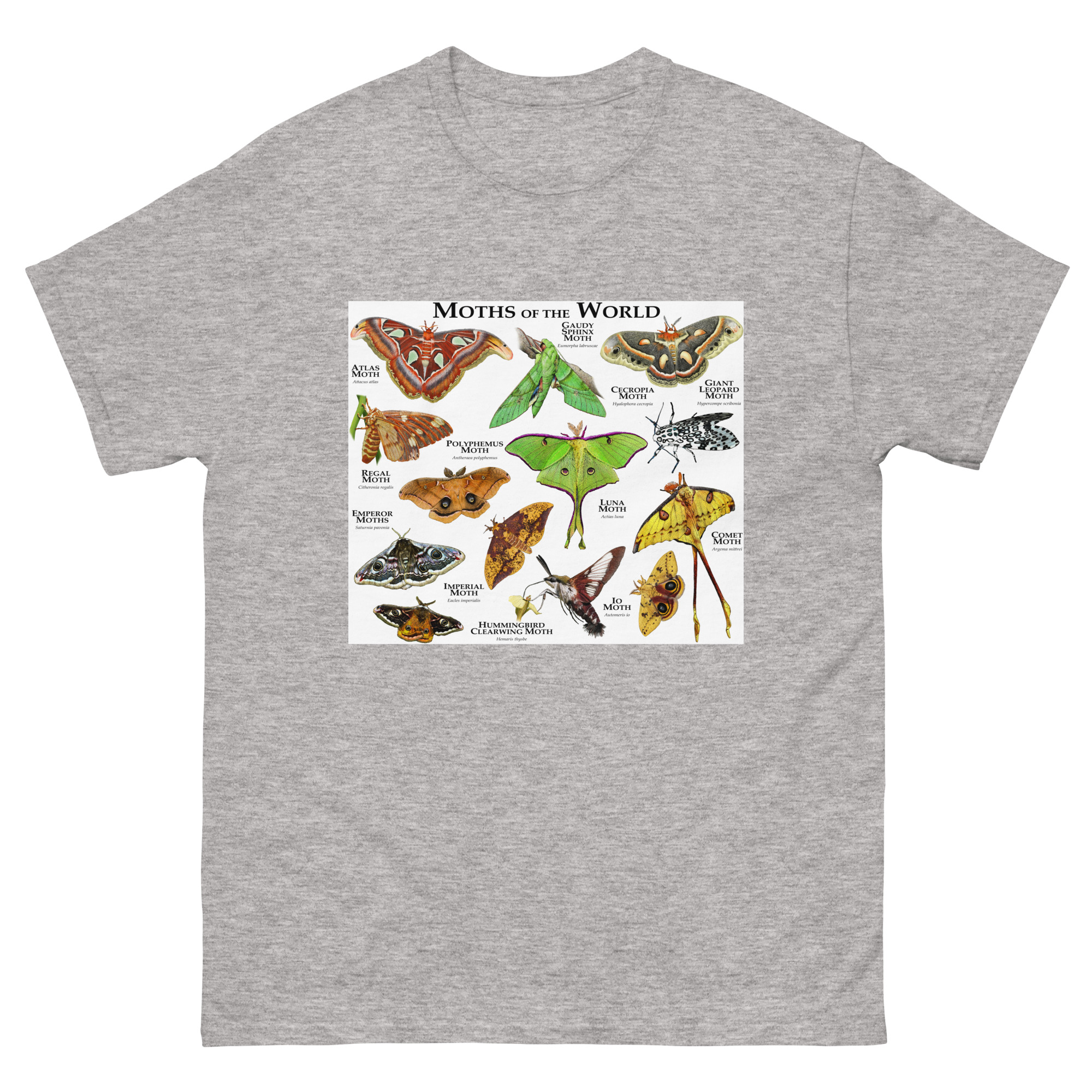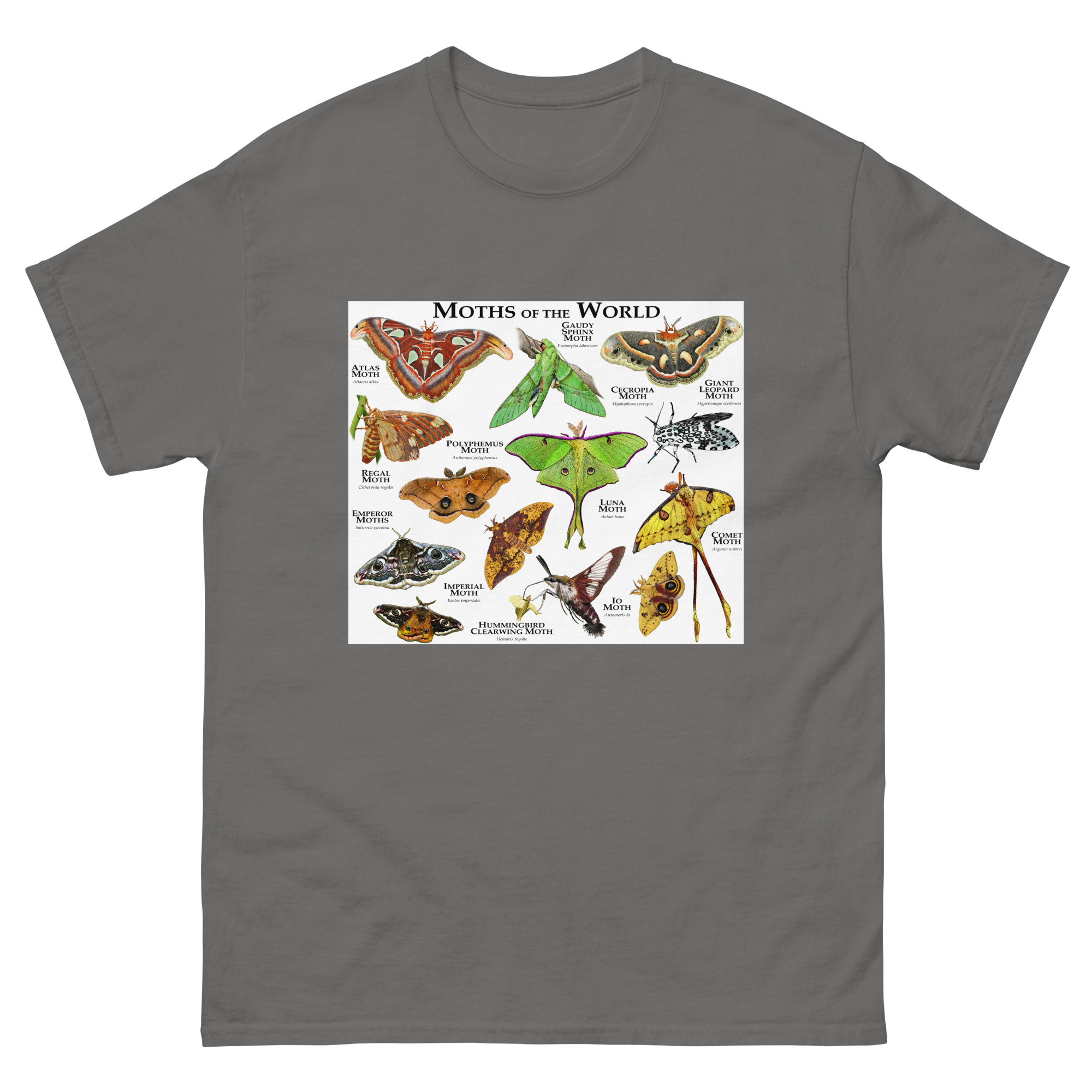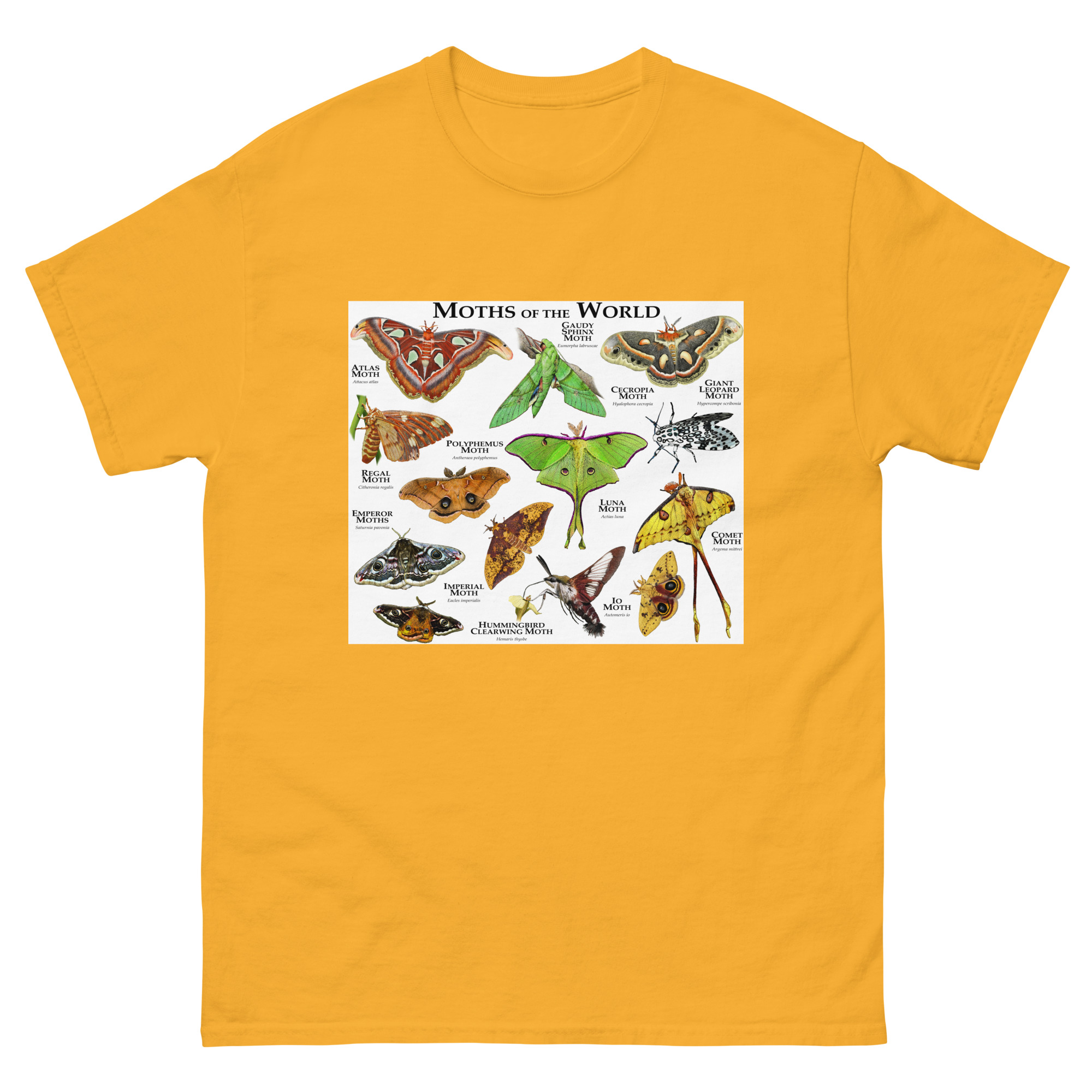 Fine art illustration of various species of moth printed on a high-quality men’s t-shirt.