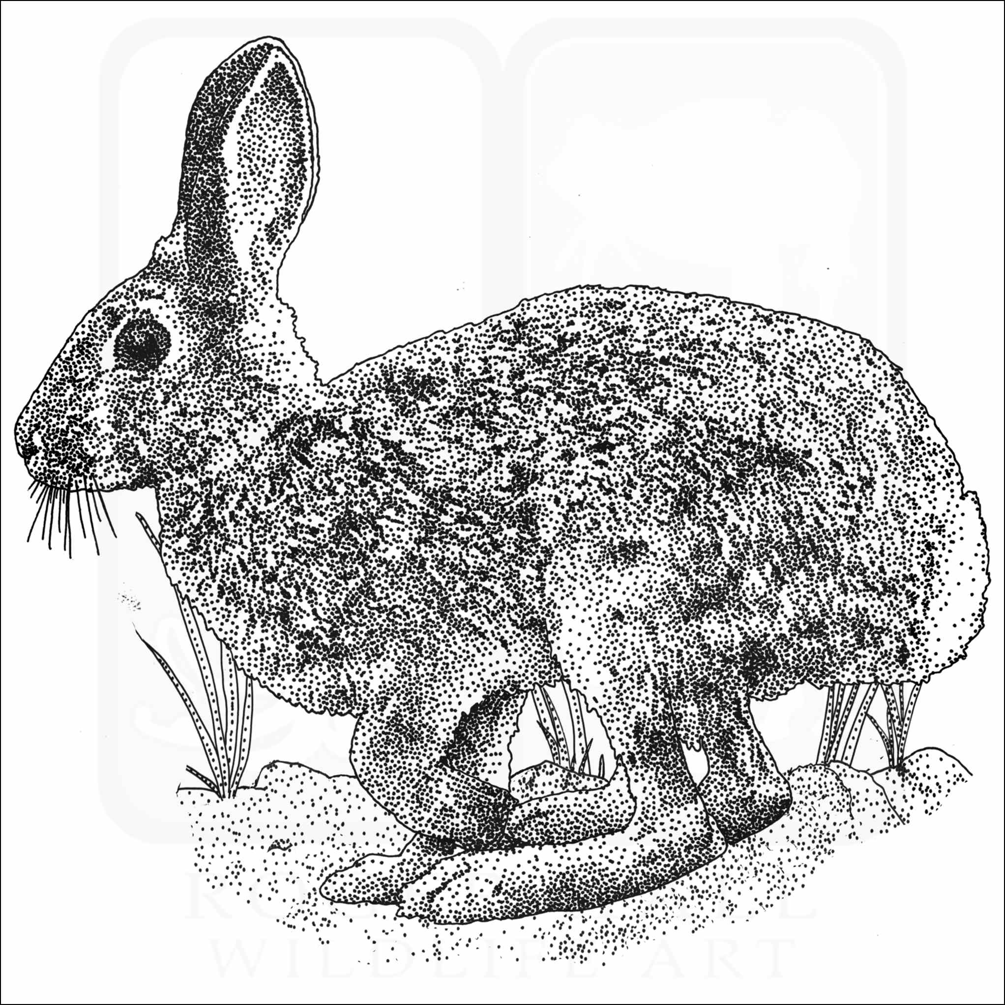 Fine art illustration of a Mountain Cottontail (Sylvilagus nuttallii.) The illustration is available in black and white or color.