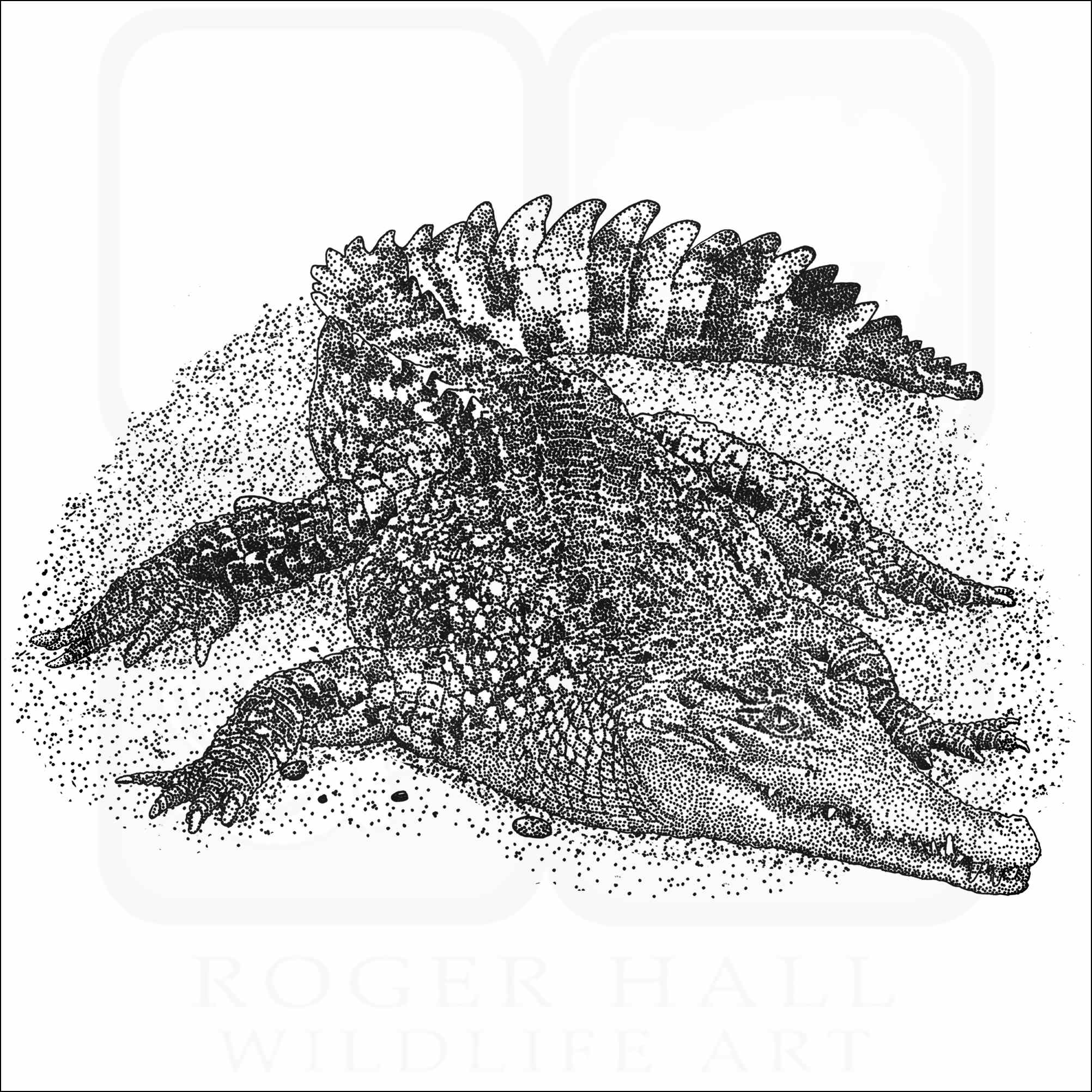 Fine art illustration of a New Guinea Crocodile (Crocodylus novaeguineae.) The illustration is available in black and white or color.