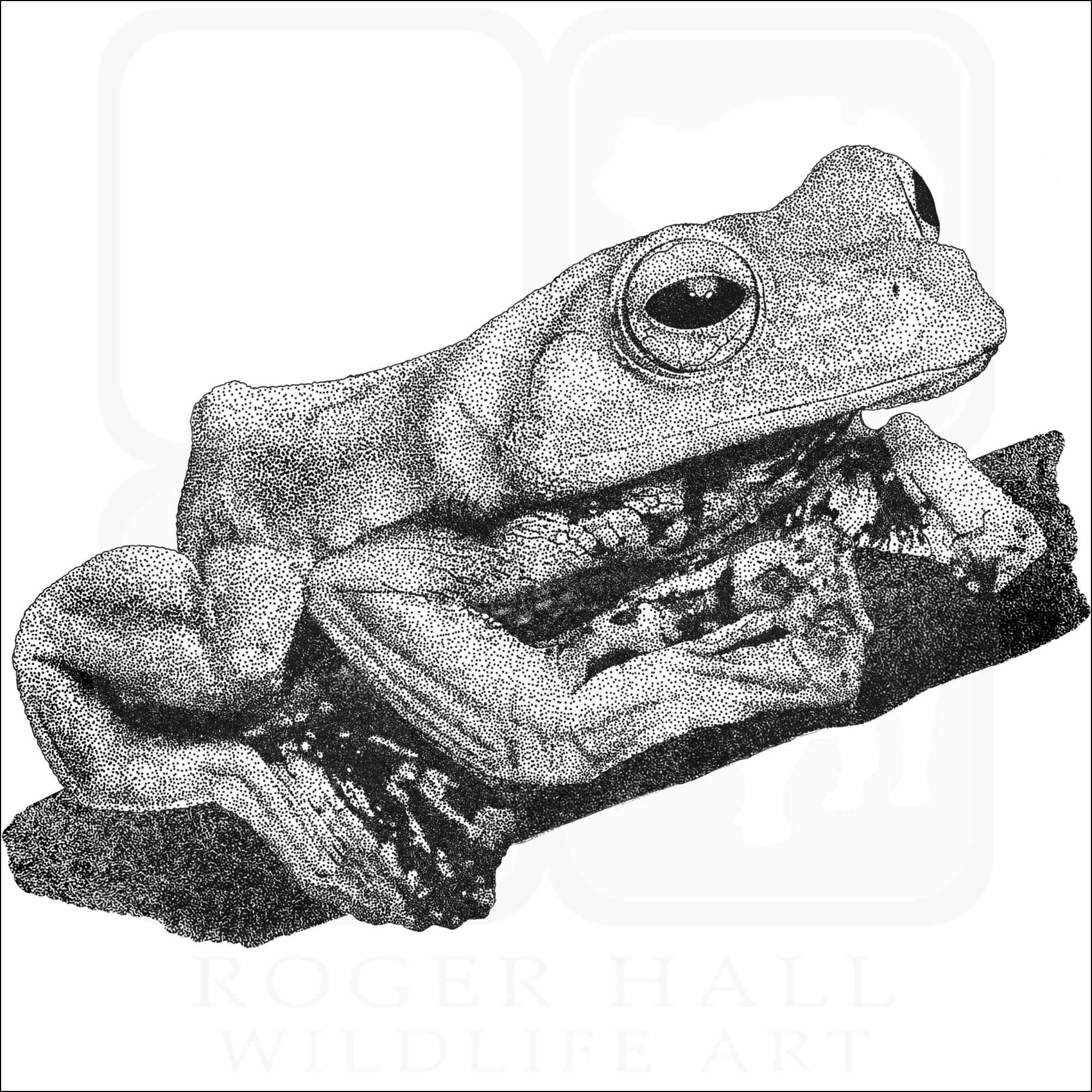 Fine art illustration of a Norhayati’s Gliding or Flying Frog (Rhacophorus norhayatii.) The illustration is available in black and white or color.