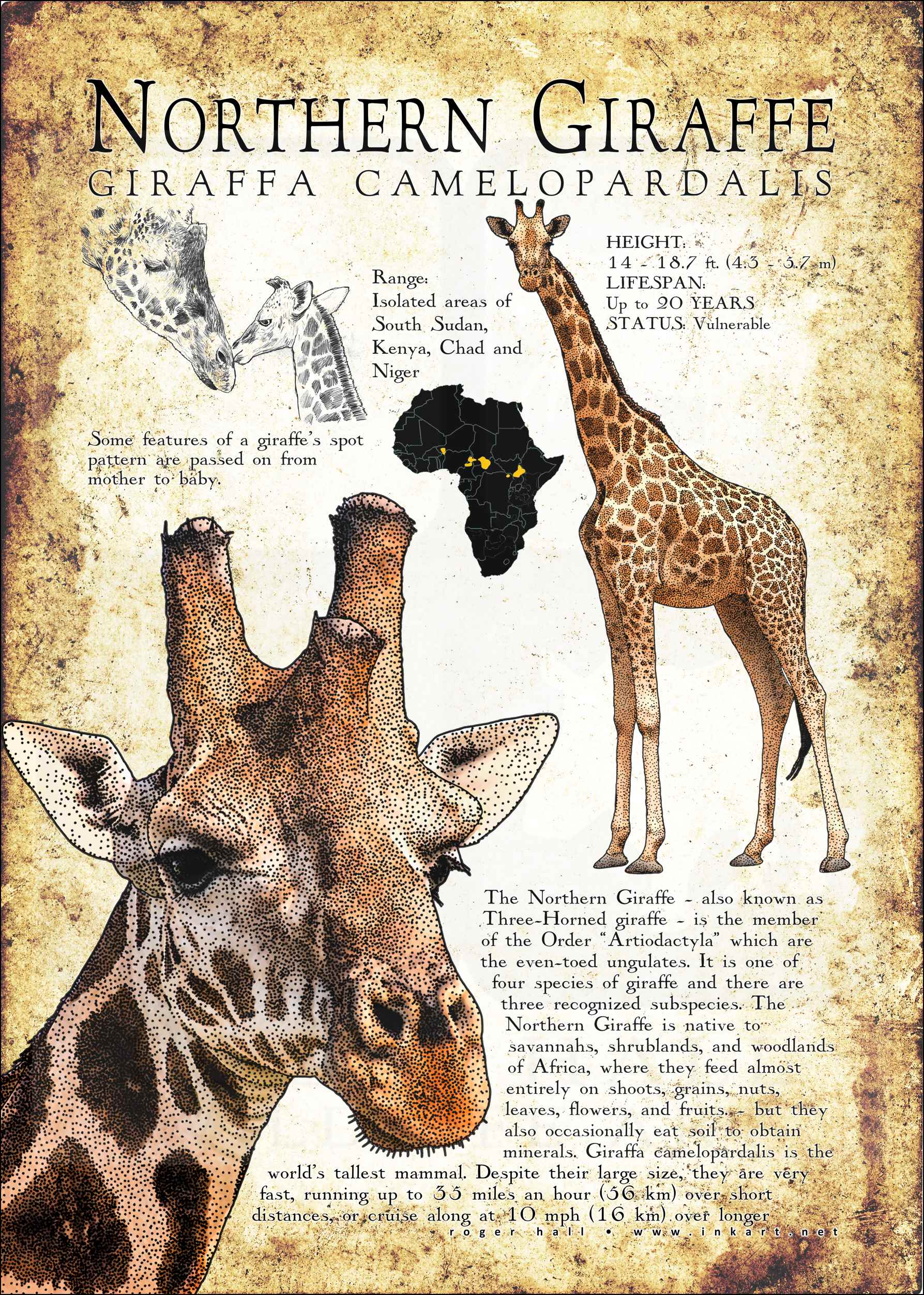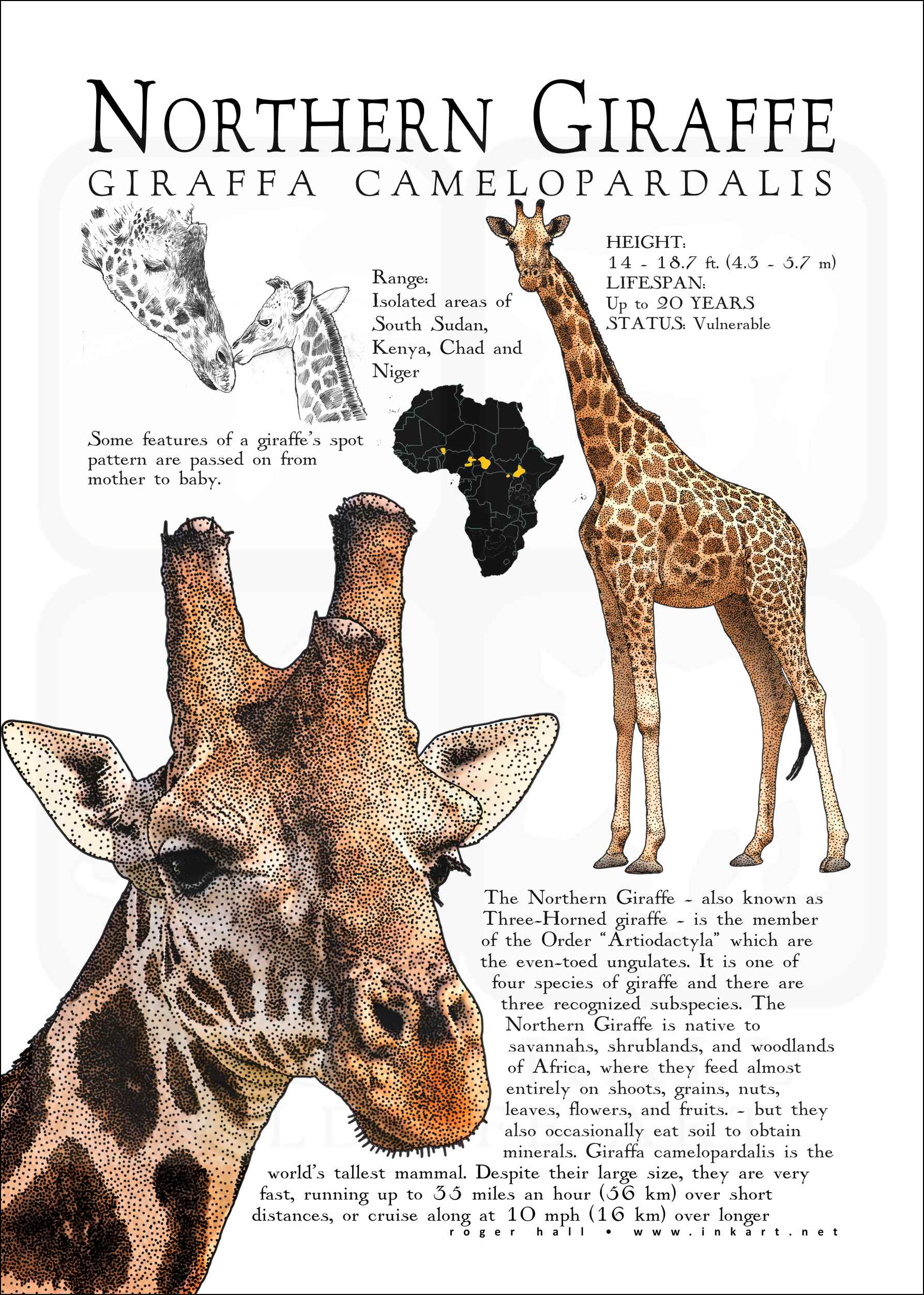 This poster features an informational graphic of the Northern Giraffe (Giraffa camelopardalis) It includes a map of the giraffe’s range, along with three illustrations and a small paragraph with information about animal.