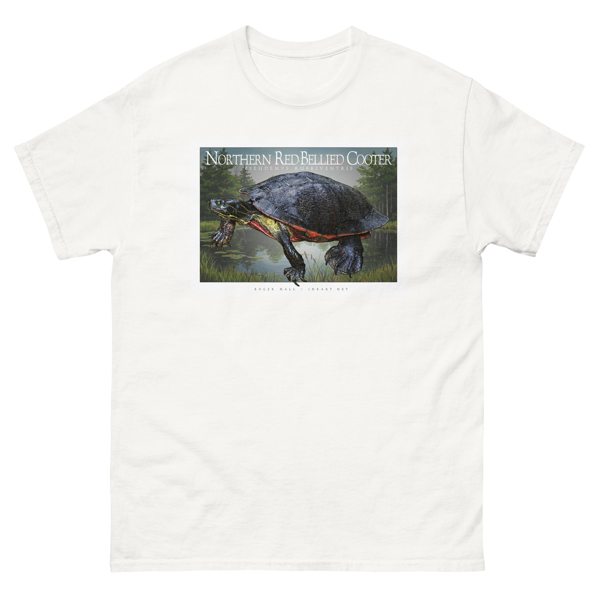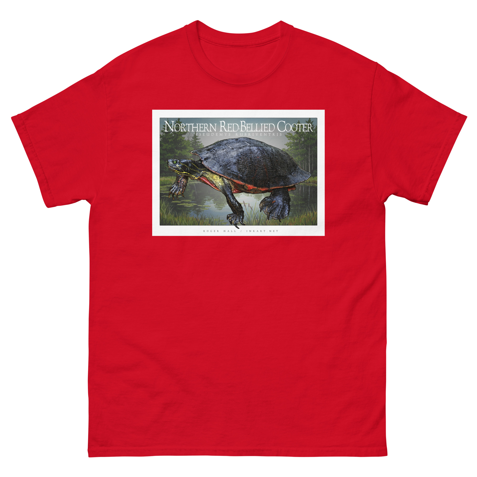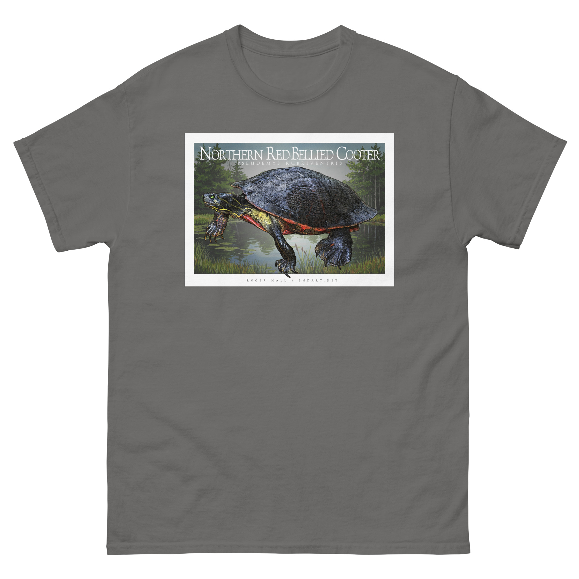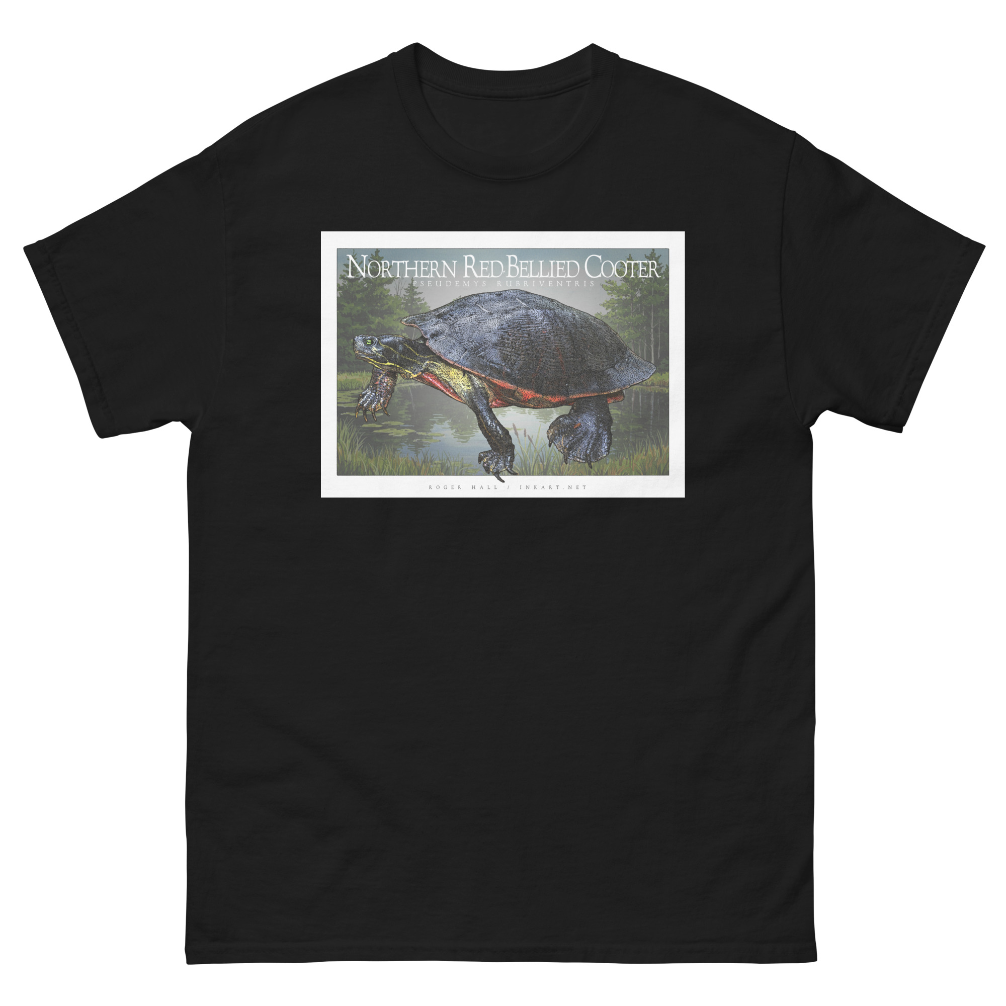 Scientifically accurate drawing of a Northern Red-Bellied Cooter (Pseudemys rubriventris.) The illustration of a printed on a high-quality 100% unisex cotton t-shirt.