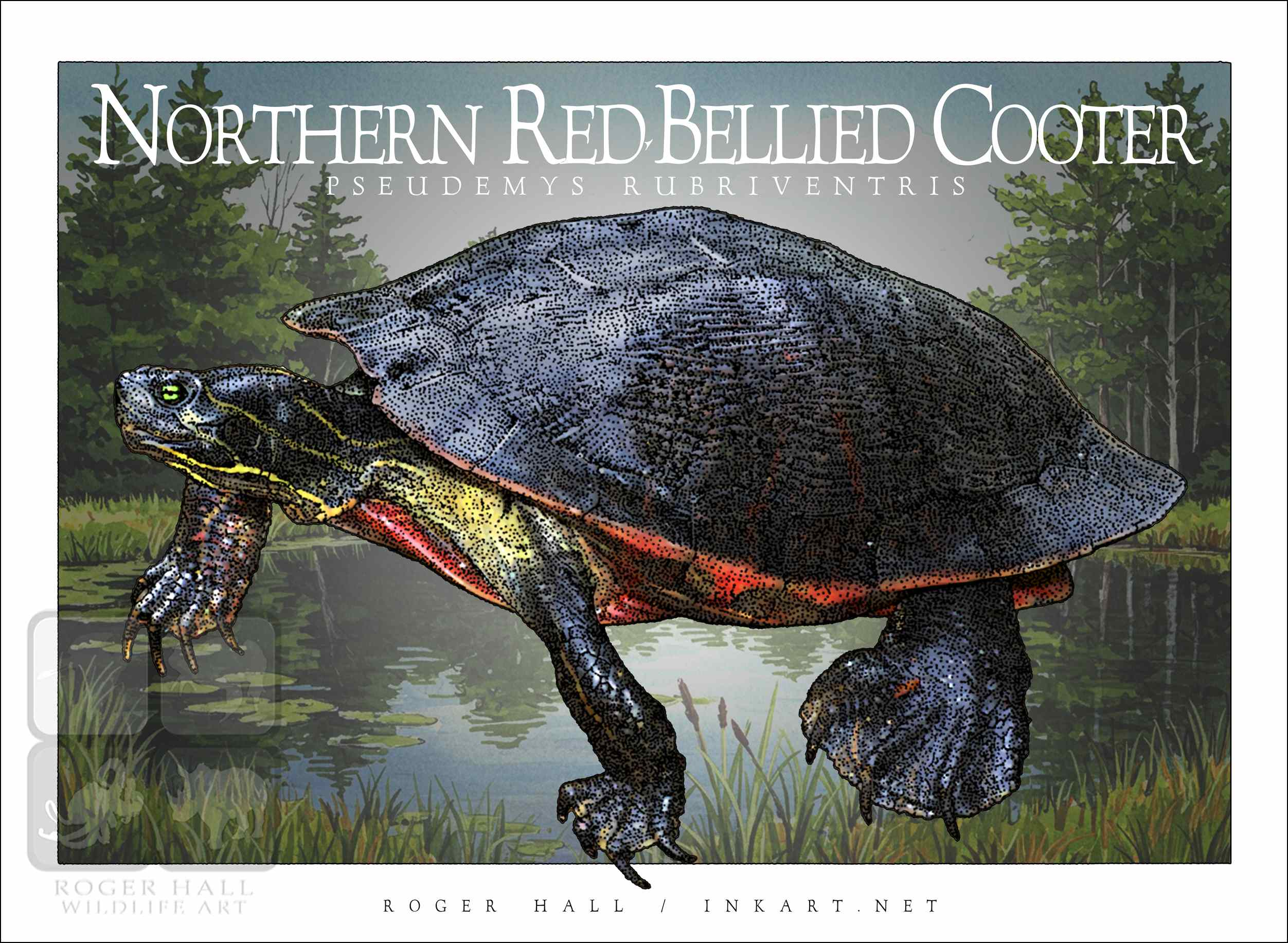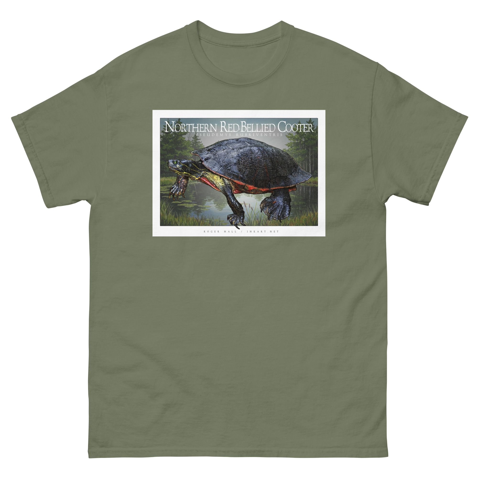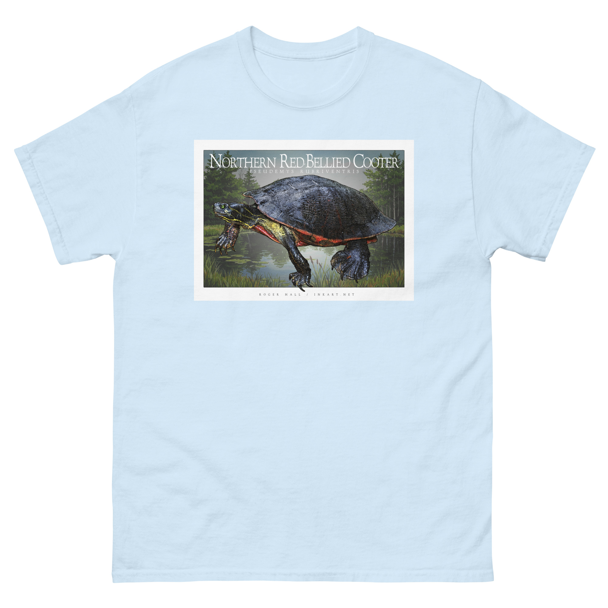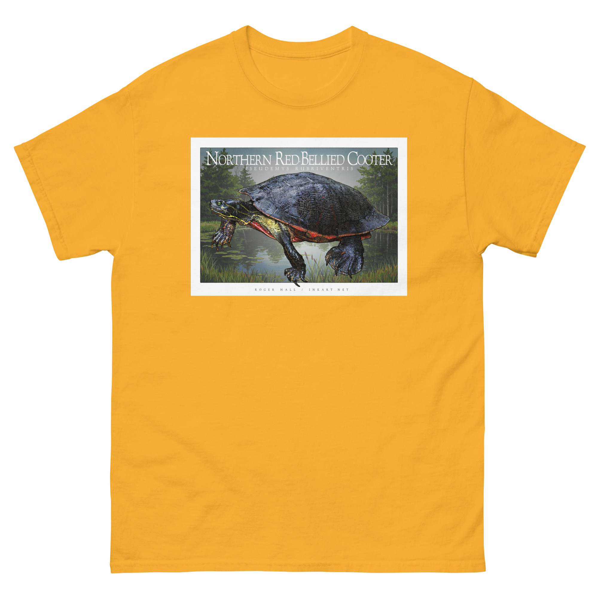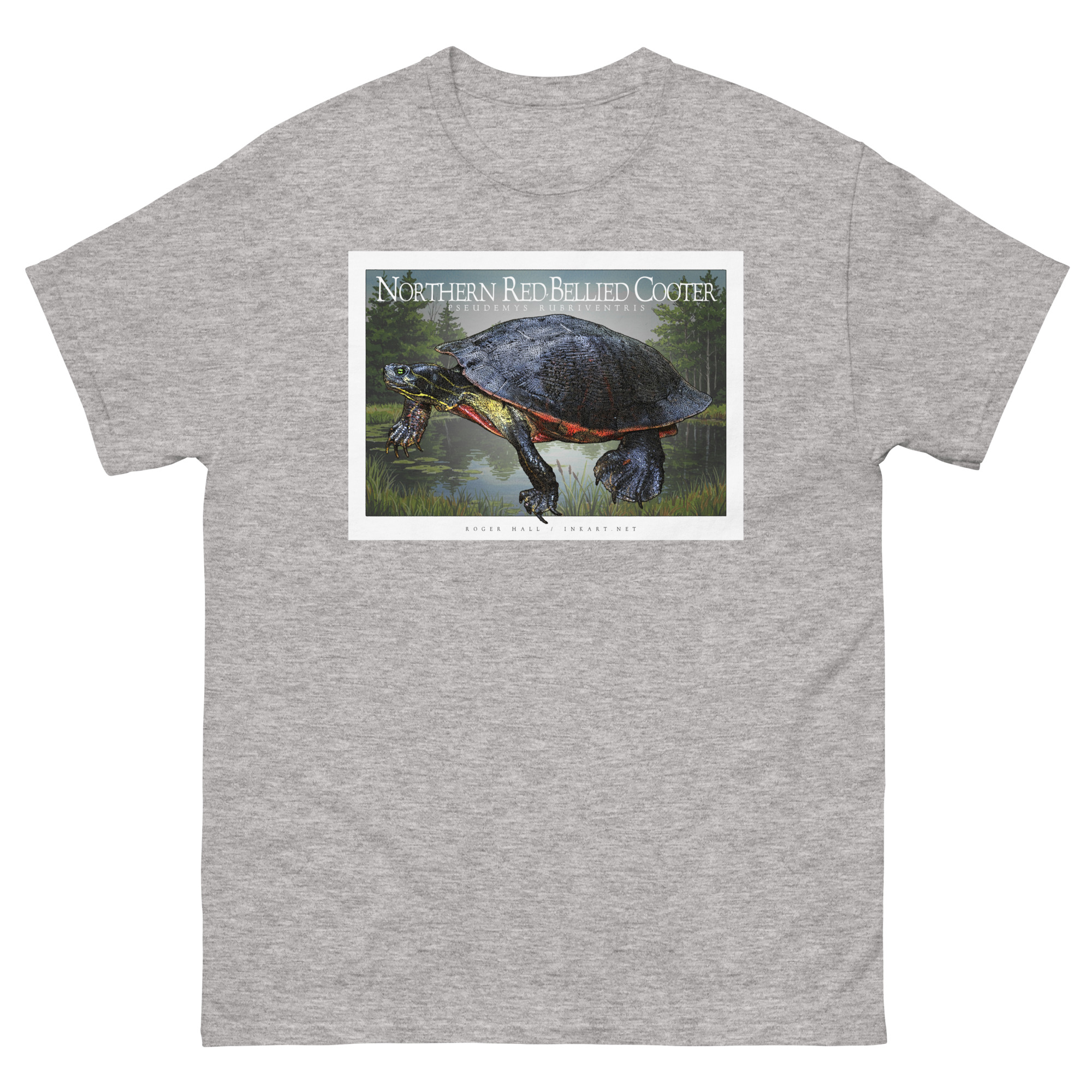 Scientifically accurate drawing of a Northern Red-Bellied Cooter (Pseudemys rubriventris.) The illustration of a printed on a high-quality 100% unisex cotton t-shirt.