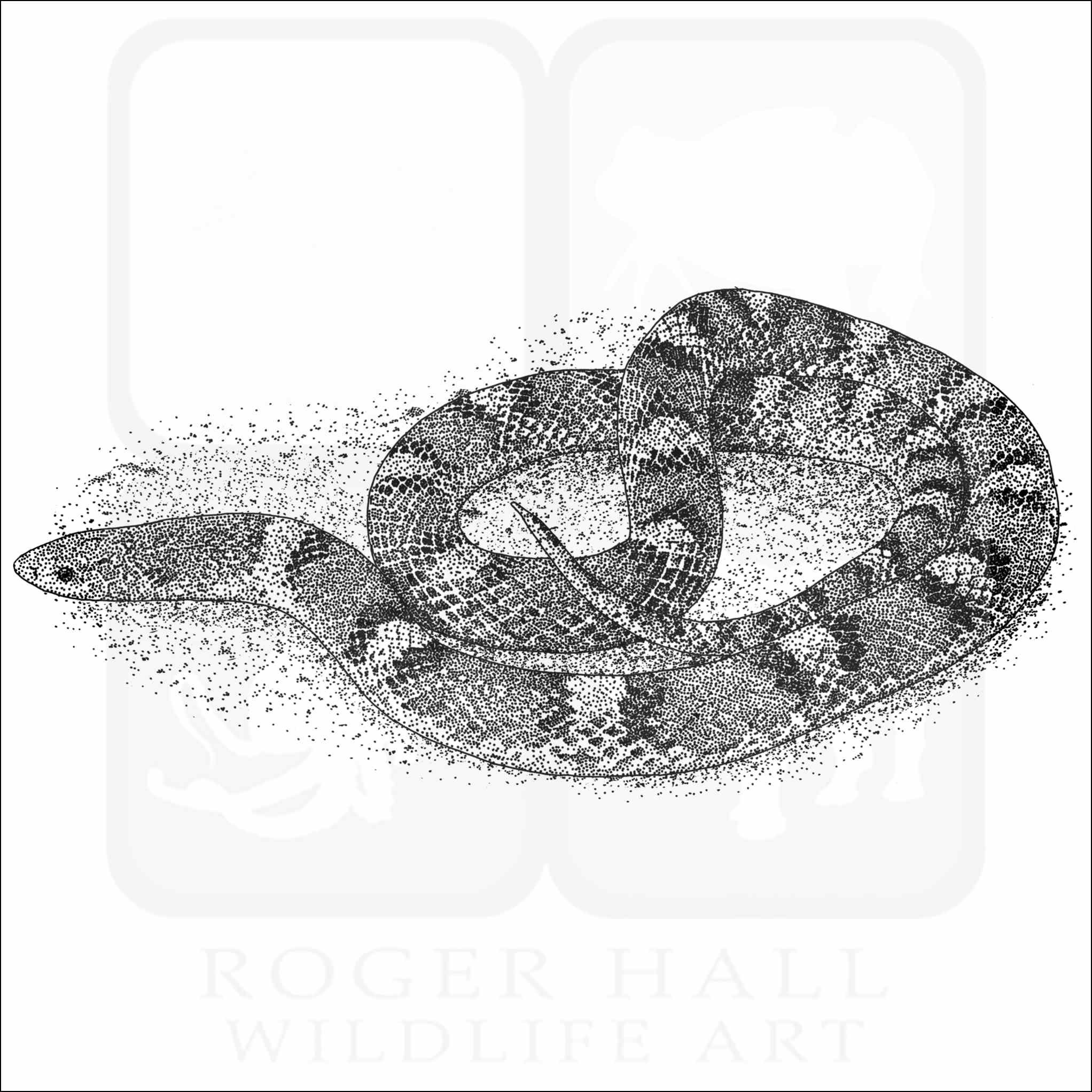 Fine art illustration of a Northern Scarlet Snake (Cemophora coccinea copei.) The illustration is available in black and white or color.