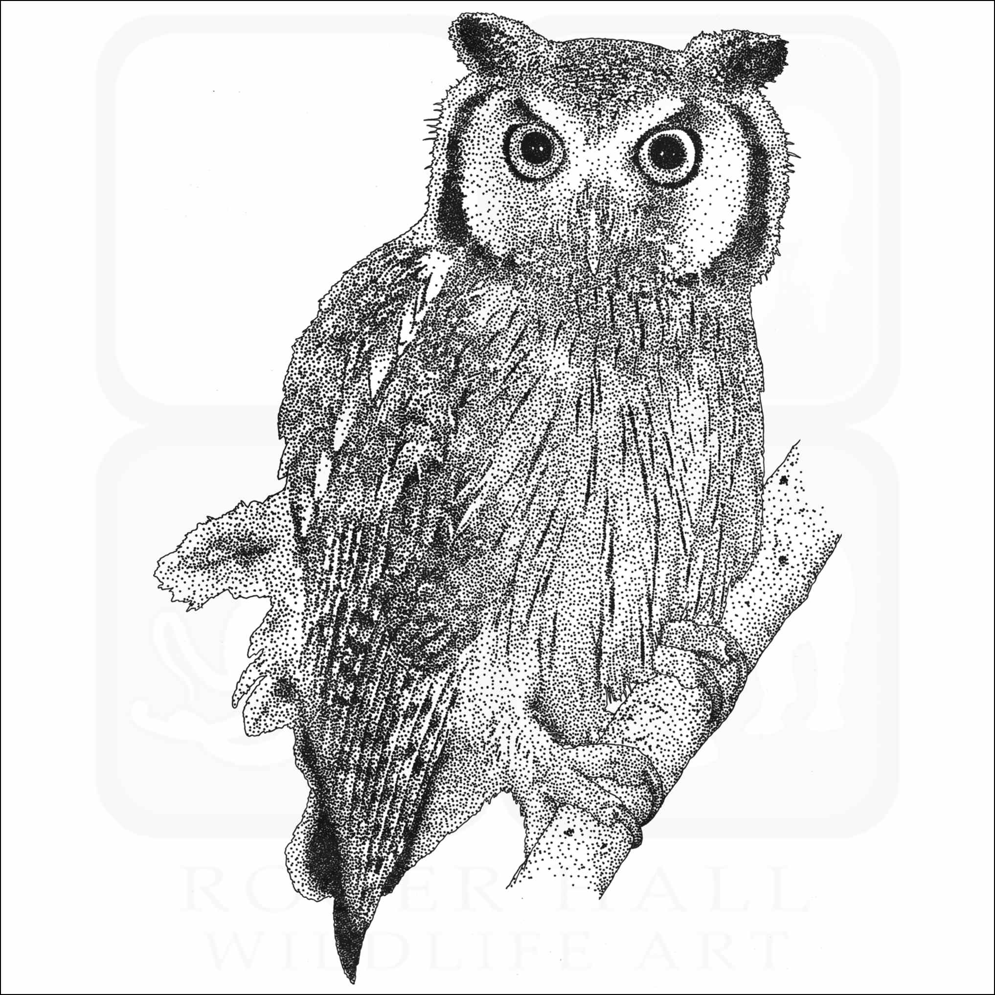 Fine art illustration of a Northern White-Faced Owl (Ptilopsis leucotis.) The illustration is available in black and white or color.