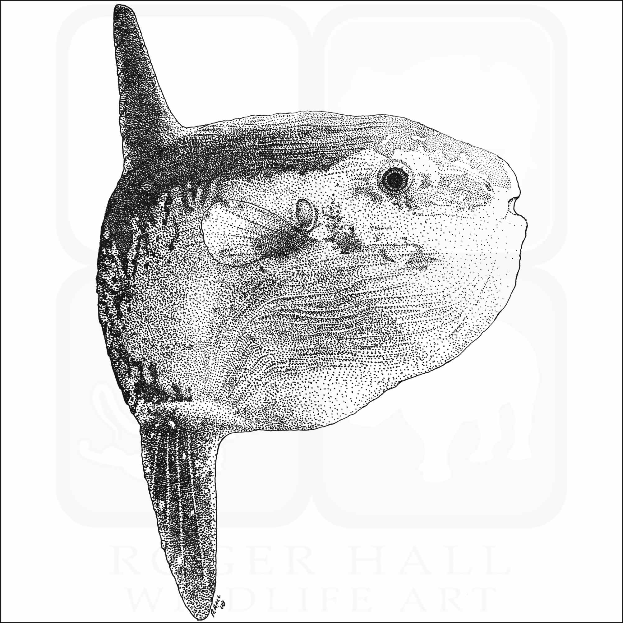 Fine art illustration of an Ocean Sunfish (Mola mola.) The illustration is available in black and white or color.