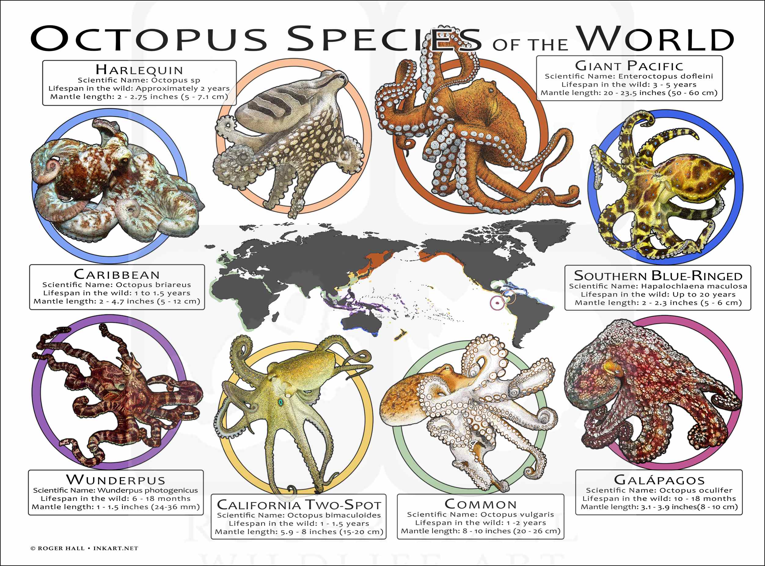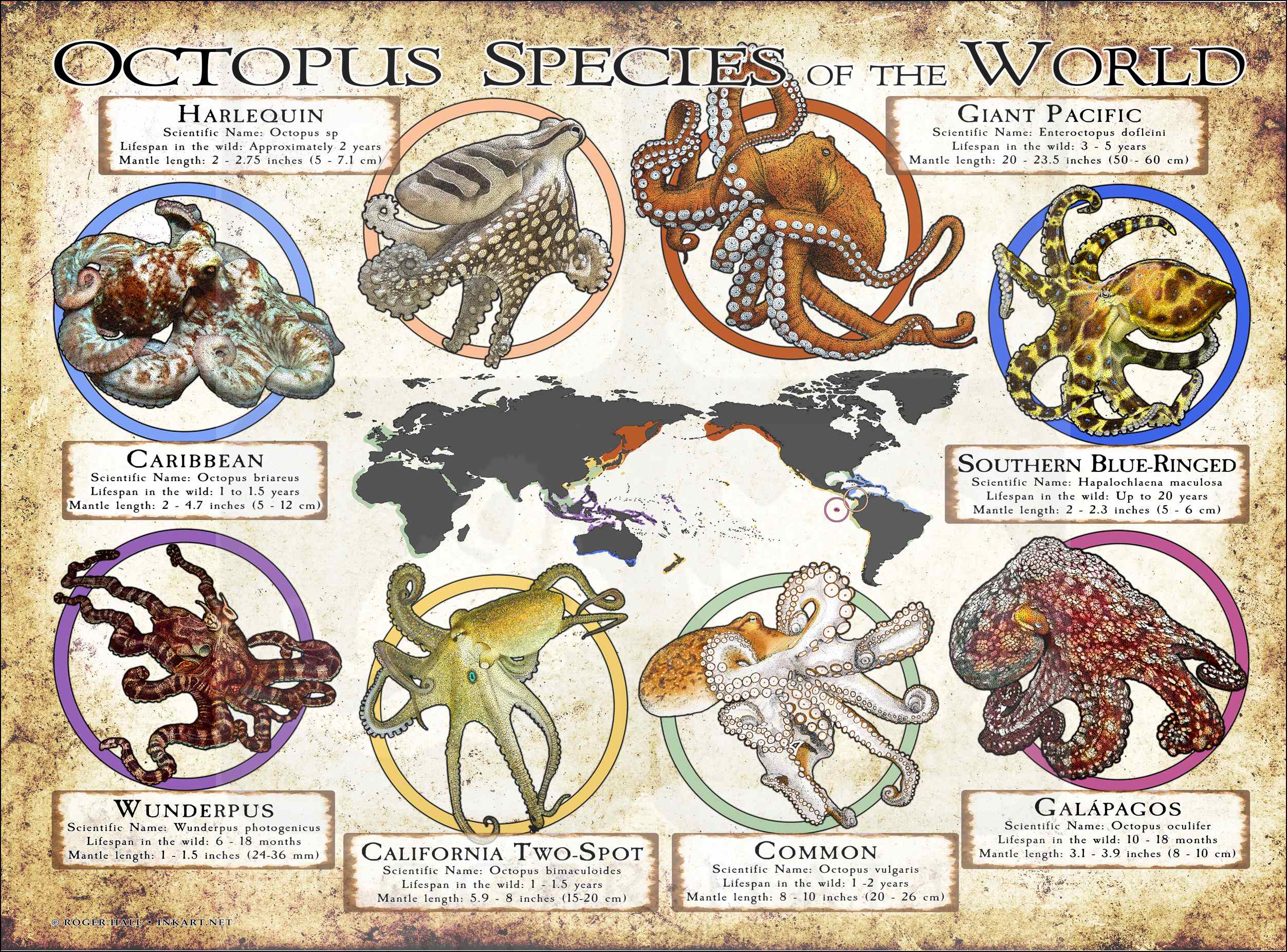 Octopus are found all over the world. The poster print features a fine art illustration of eight different types of these intelligent cephalopod, along with a range map showing their distribution and information about each different species.
