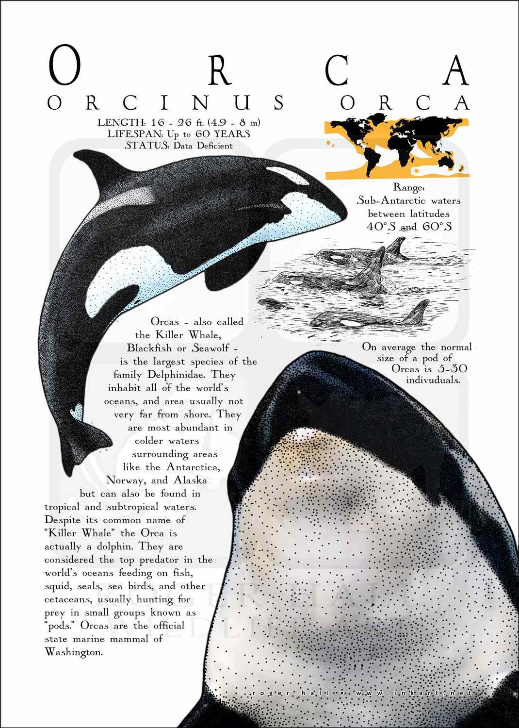 This poster features an informational graphic of an Orca or Killer Whale. It includes a map of the marine mammals range, along with three illustrations and a small paragraph with information.