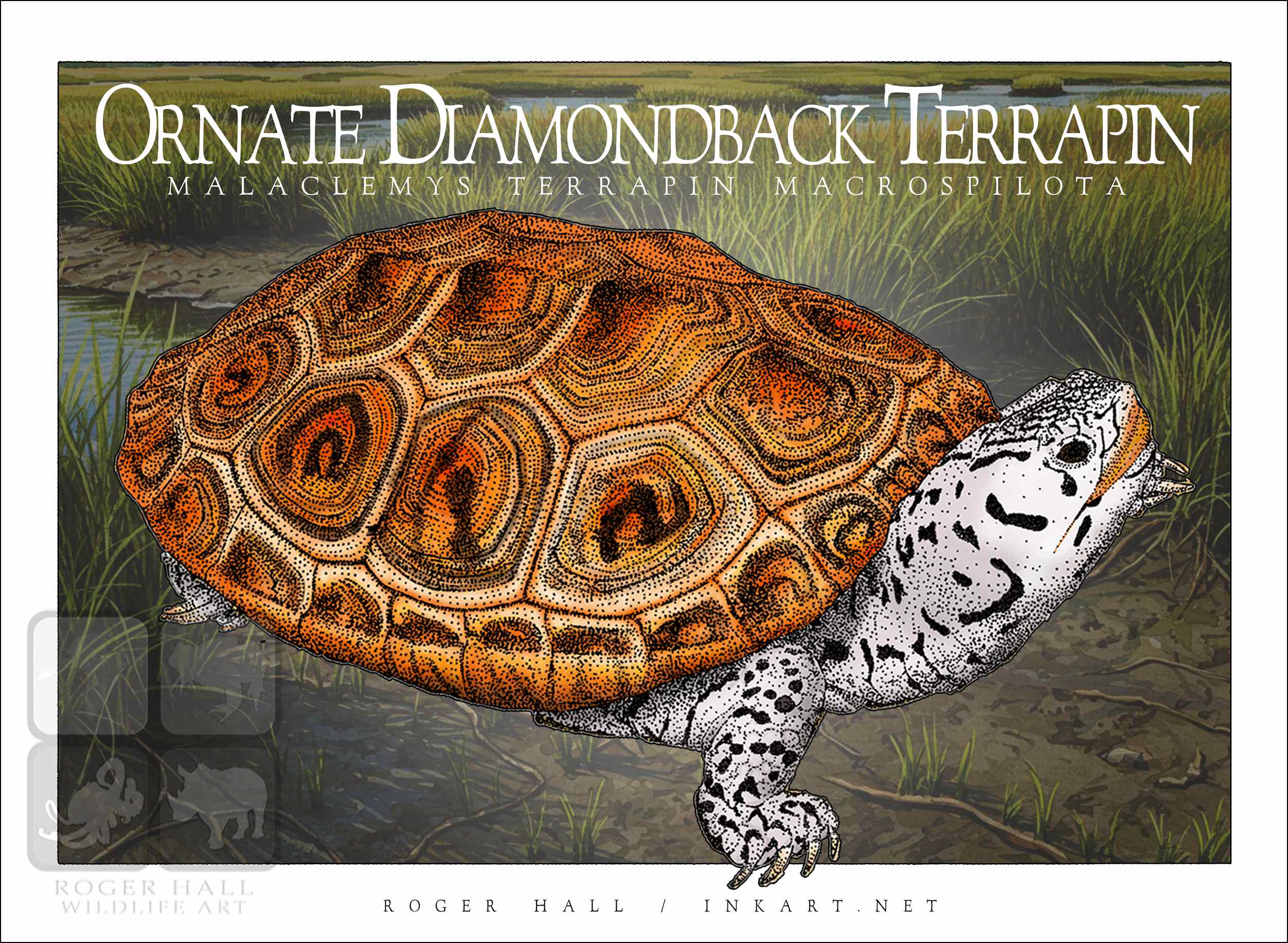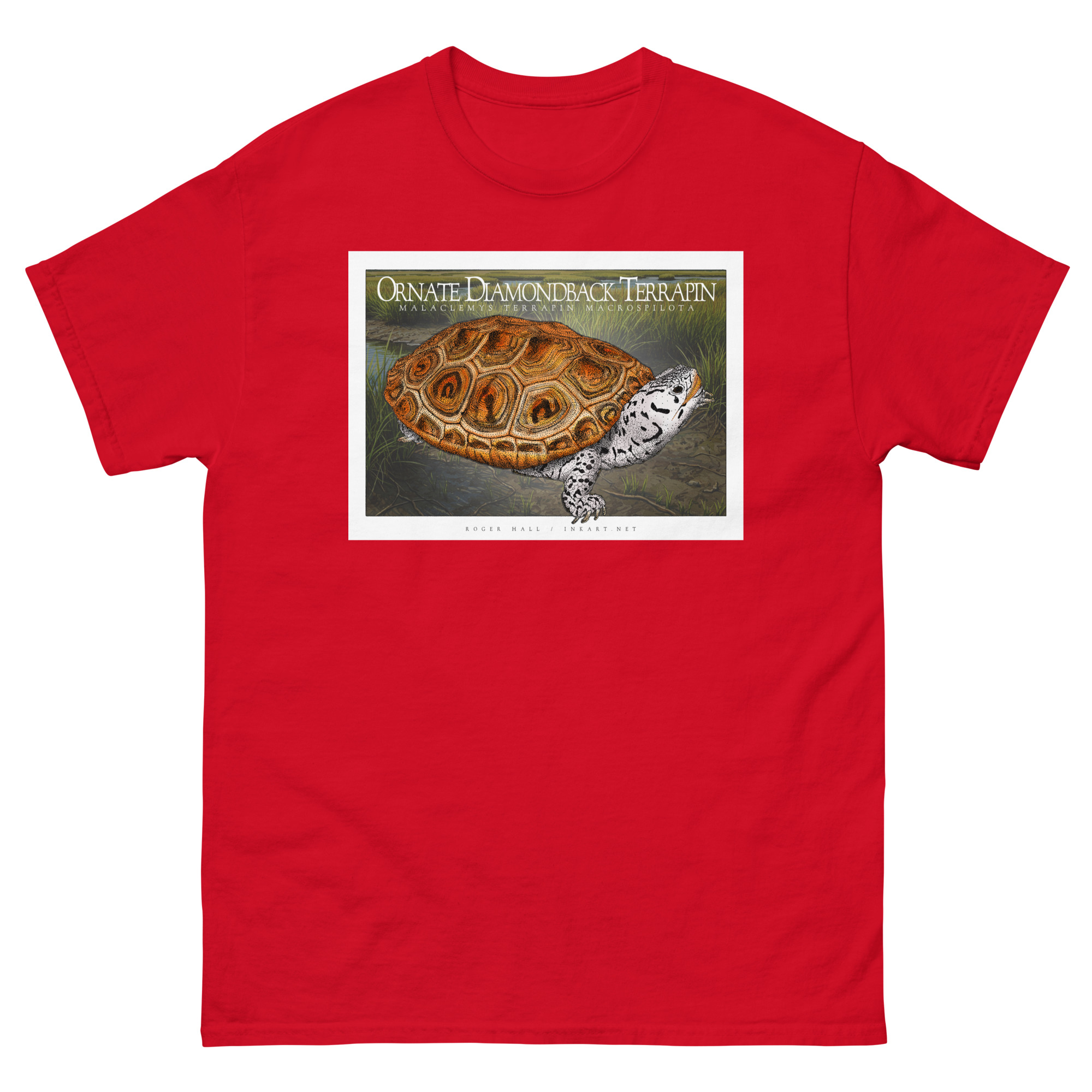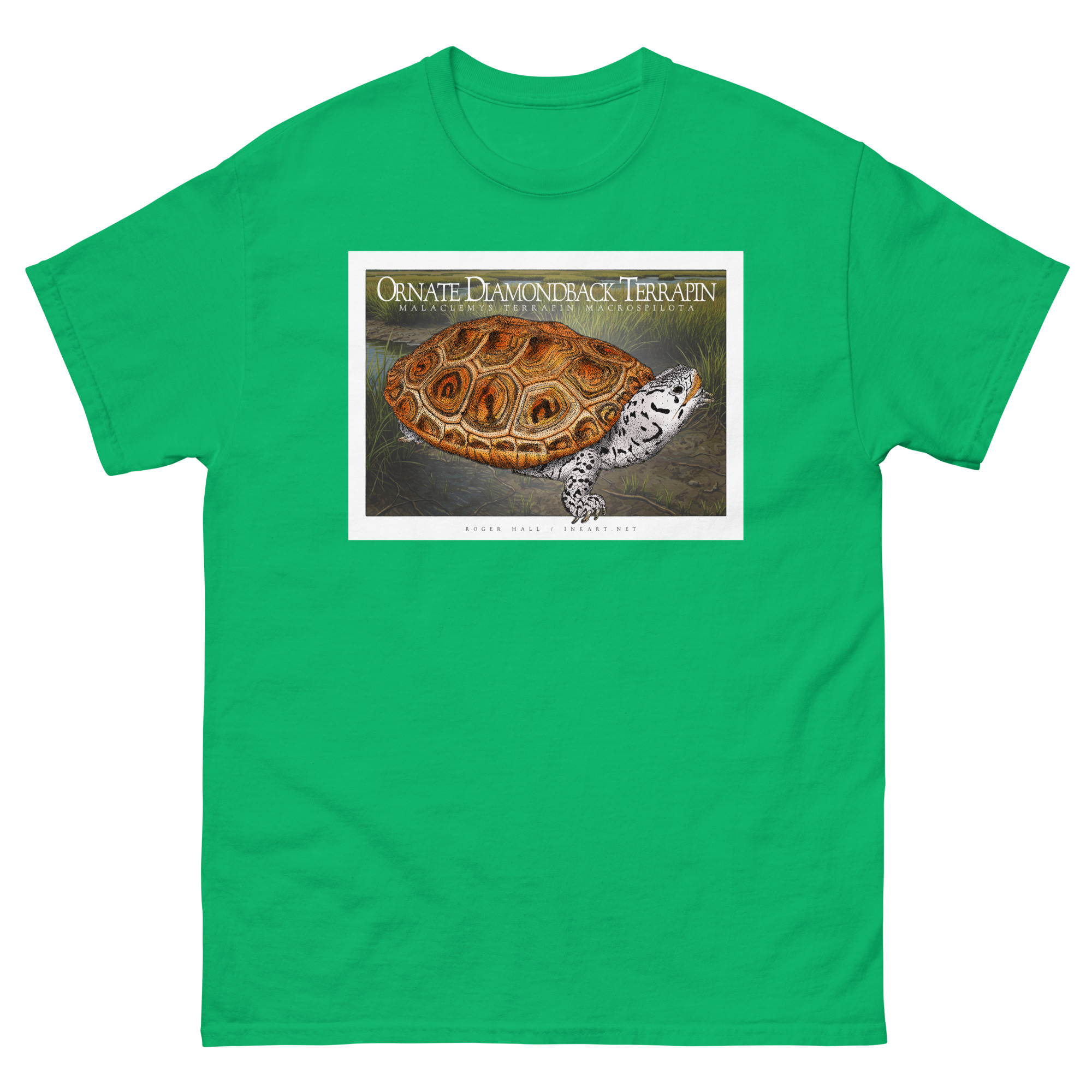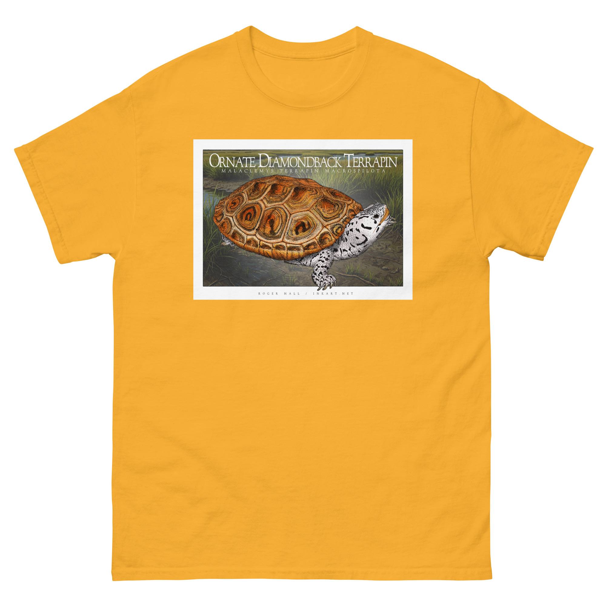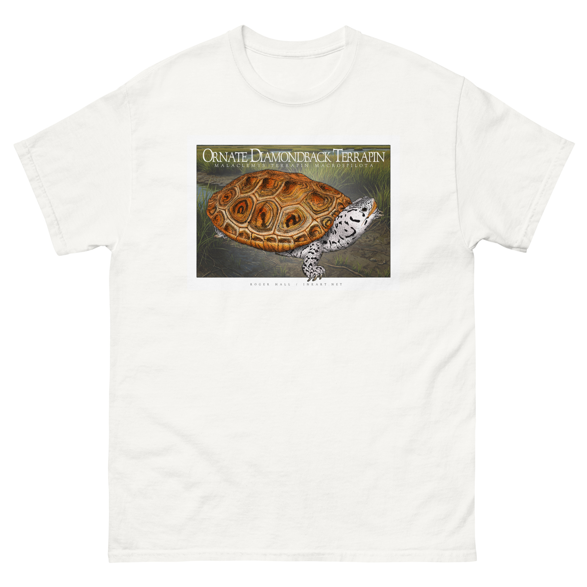 Scientifically accurate drawing of an Ornate Diamondback Terrapin (Malaclemys terrapin macrospilota.) The illustration of a printed on a high-quality 100% unisex cotton t-shirt.