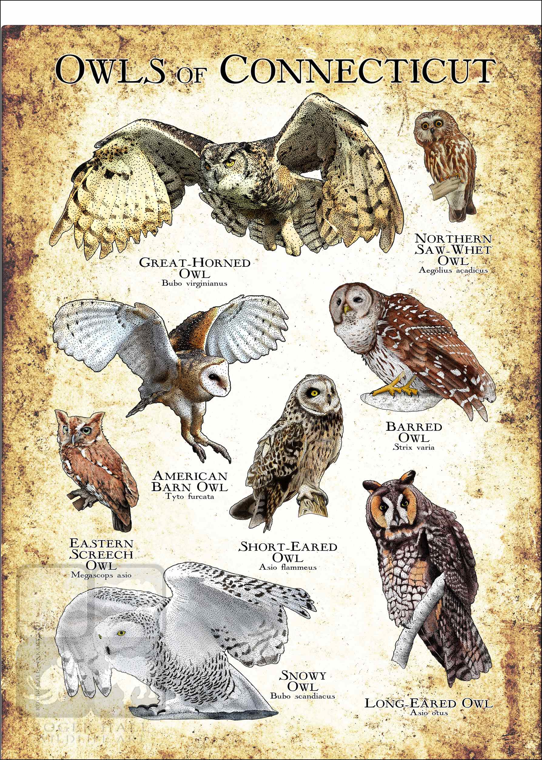 The state of Connecticut in North America’s New England region has eight native species of owl. They’re all here on this poster, drawn beautifully and with amazing scientific accuracy. The owl species included: