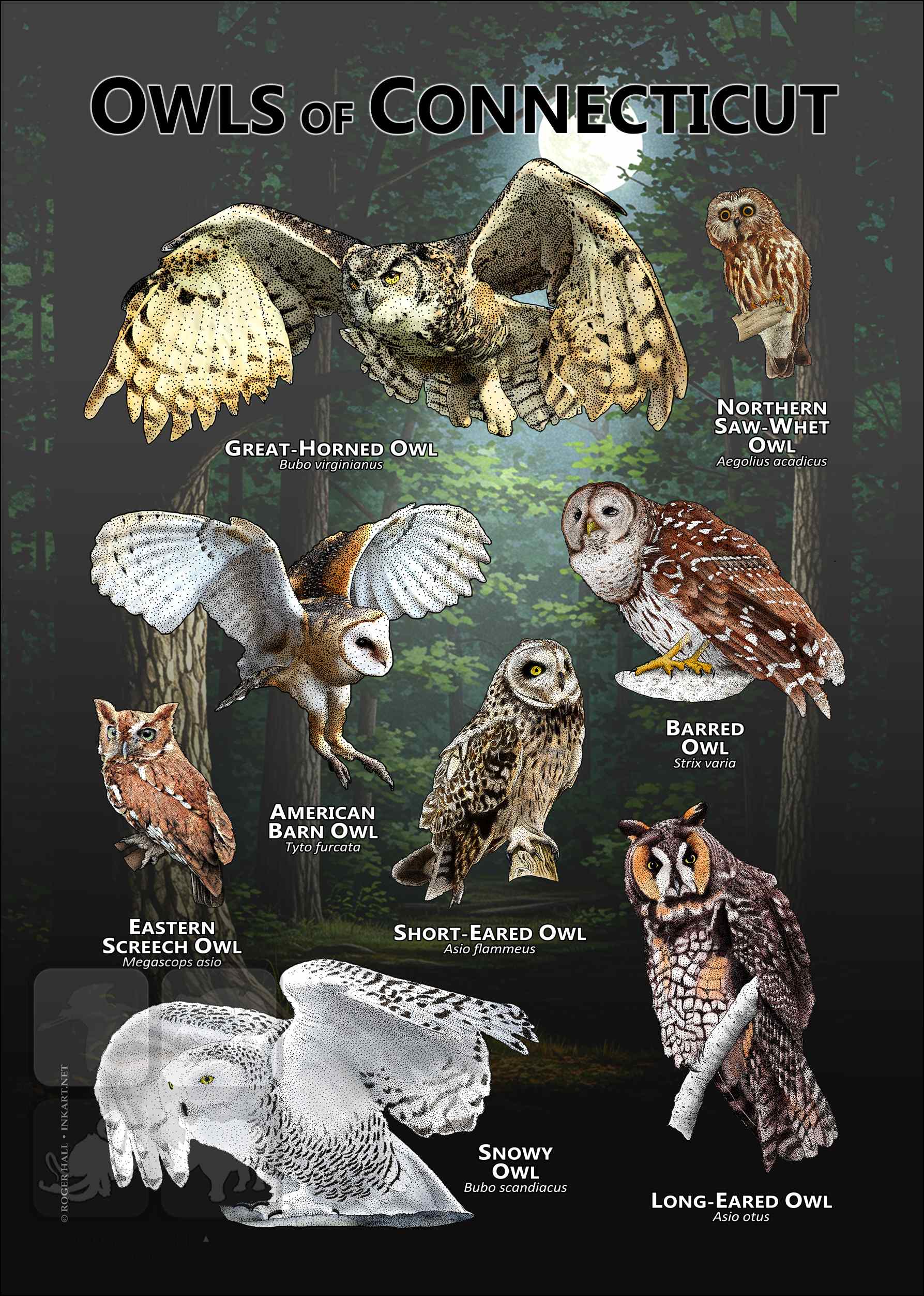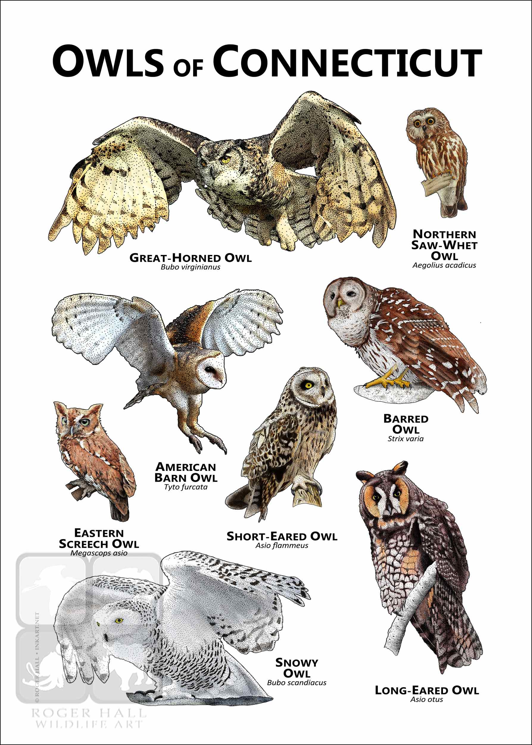 AMERICAN BARN OWL (Tyto furcata) • BARRED OWL (Strix varia) • EASTERN SCREECH OWL (Megascops asio) • GREAT-HORNED OWL (Bubo virginianus) • LONG-EARED OWL (Asio otus) • NORTHERN SAW WHET OWL (Aegolius acadicus) • SHORT-EARED OWL (Asio flammeus) • SNOWY OWL (Bubo scandiacus)