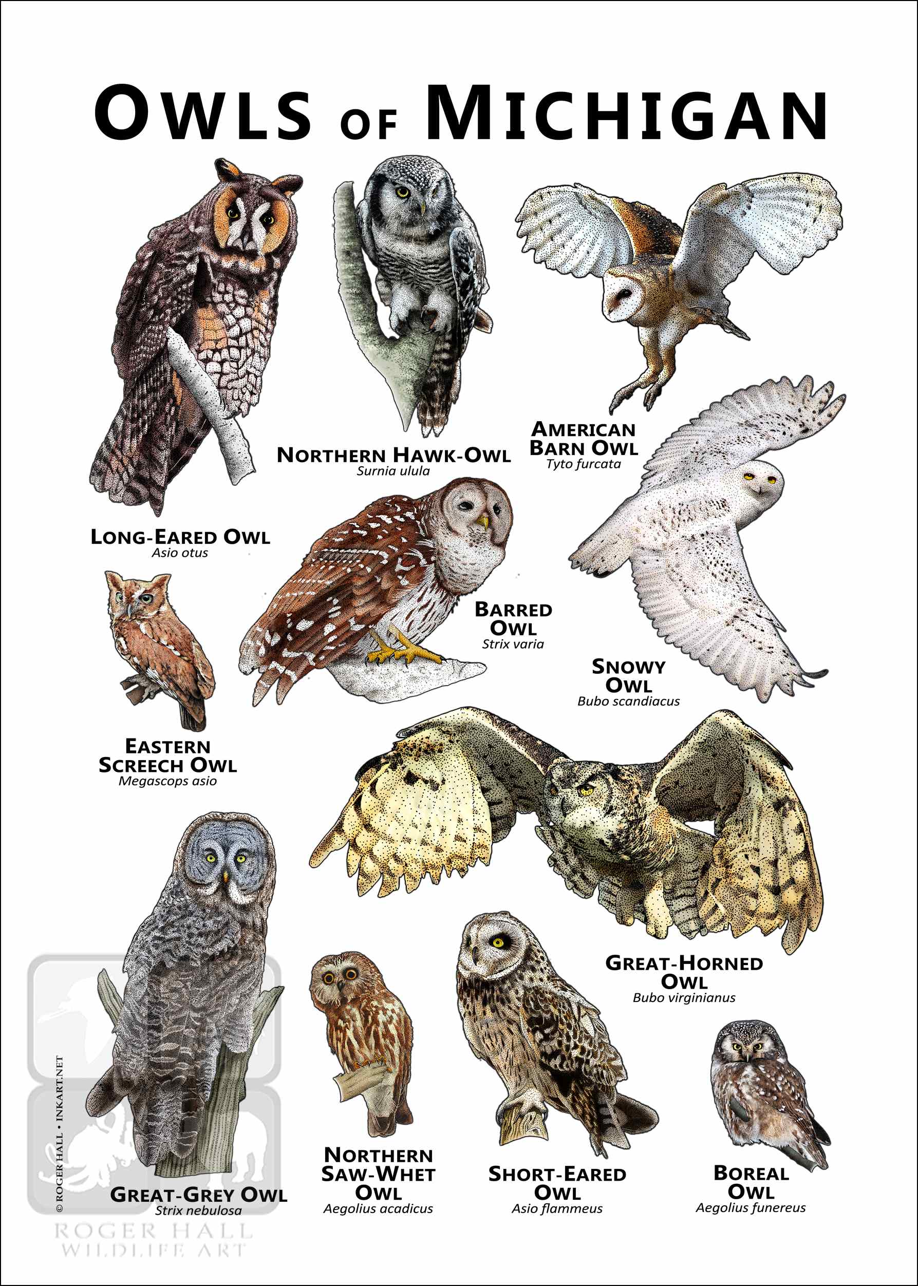 The state of Michigan in North America has eleven native species of owl. They’re all here on this poster, drawn beautifully and with amazing scientific accuracy. The owl species included:
