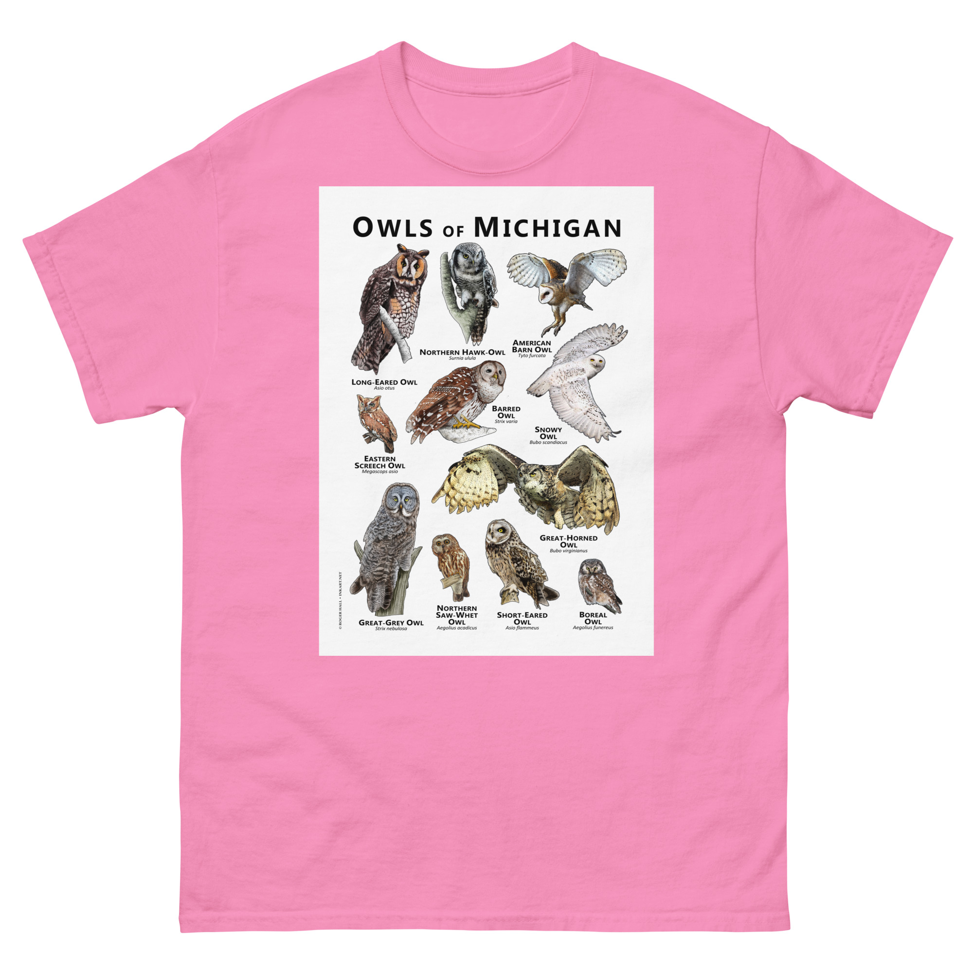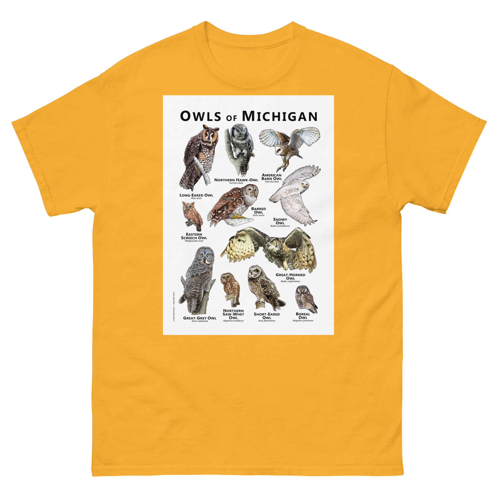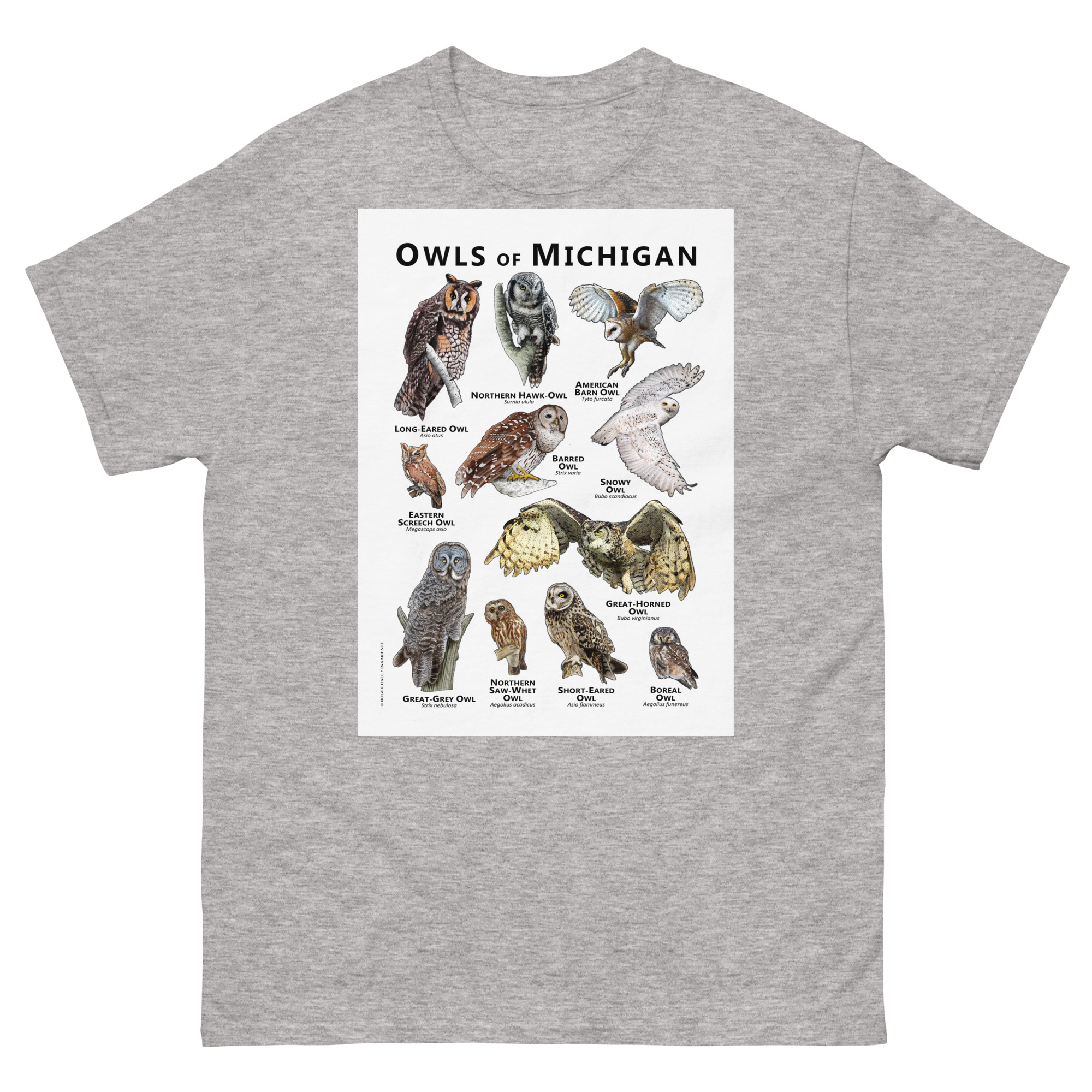 The state of Michigan in North America has eleven native species of owl. They’re all here on this unisex classic tee. Each owl is drawn beautifully and with amazing scientific accuracy.