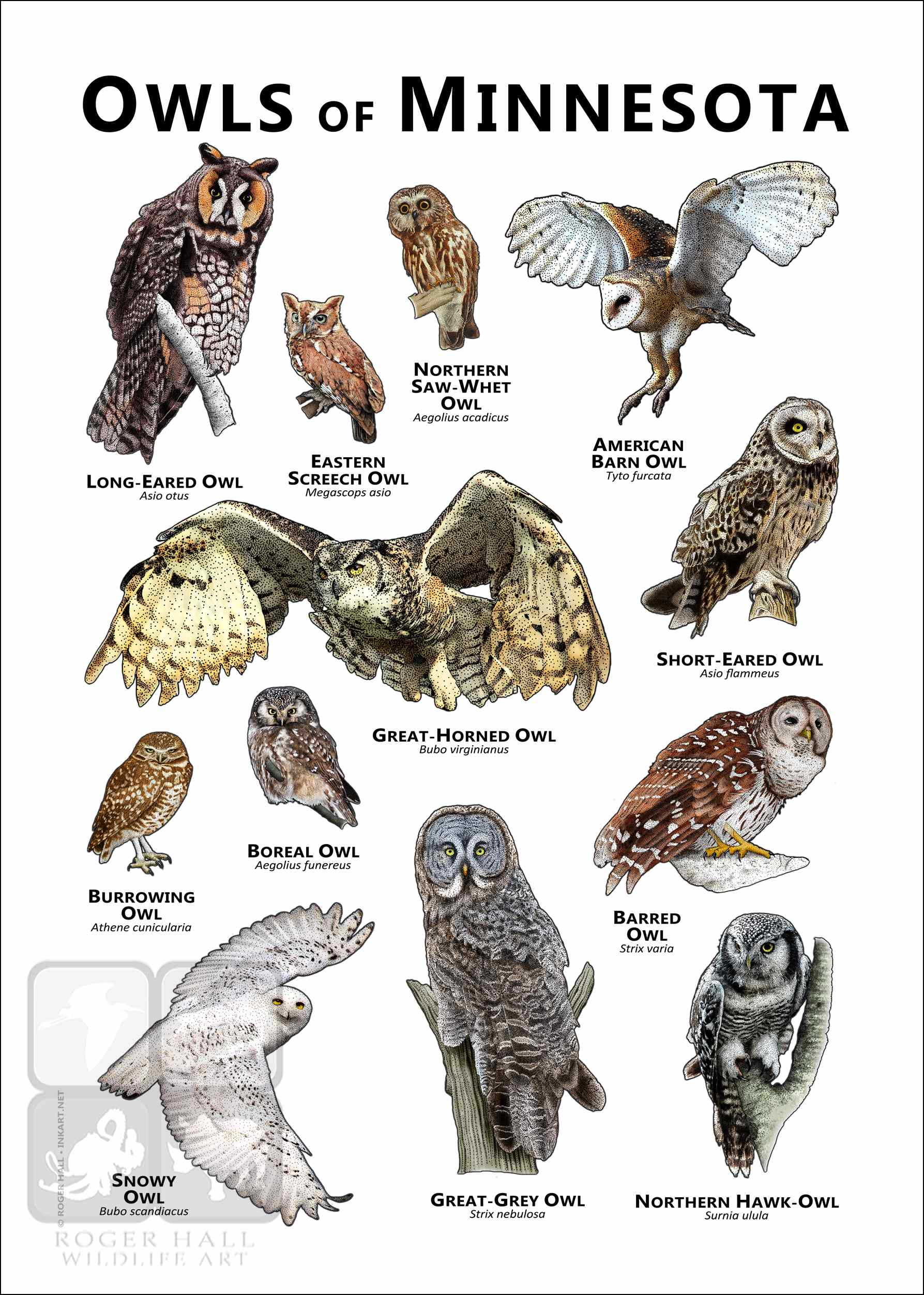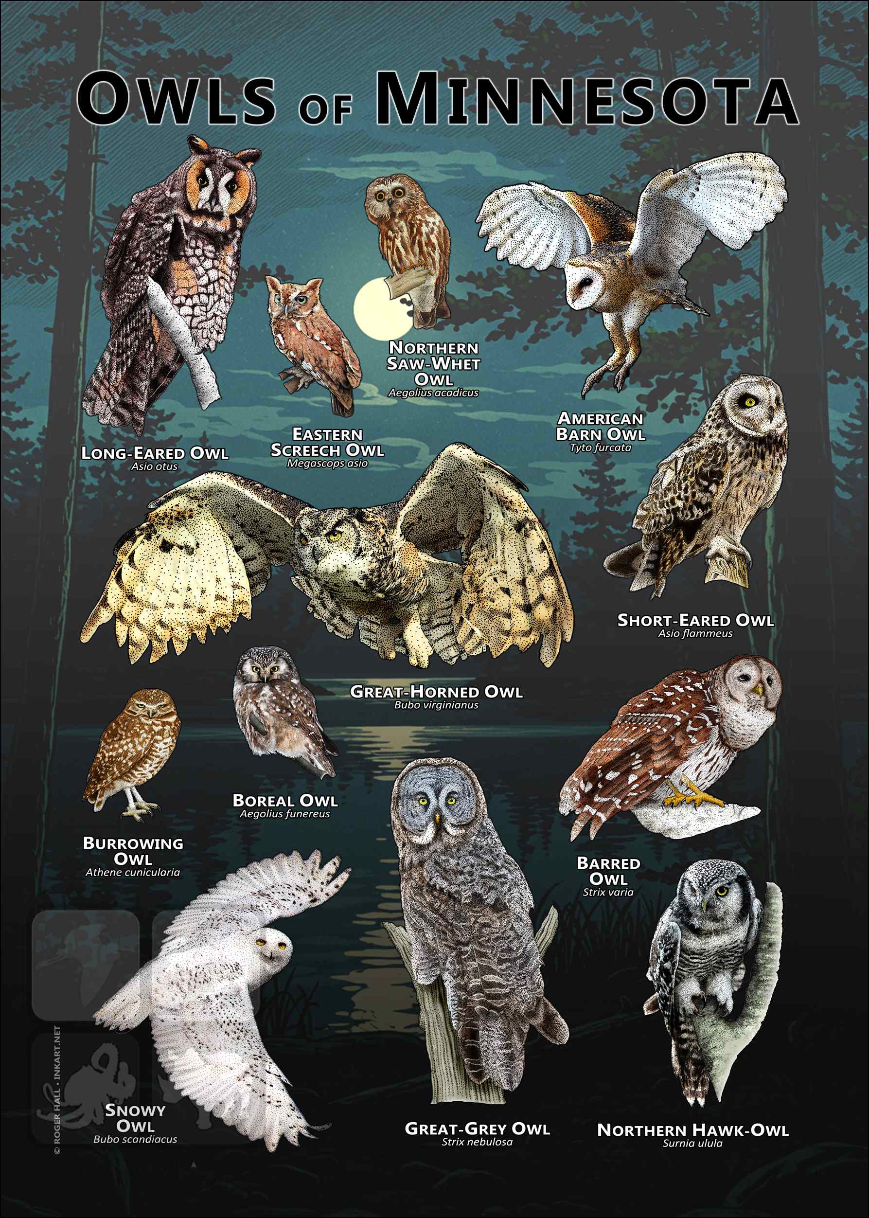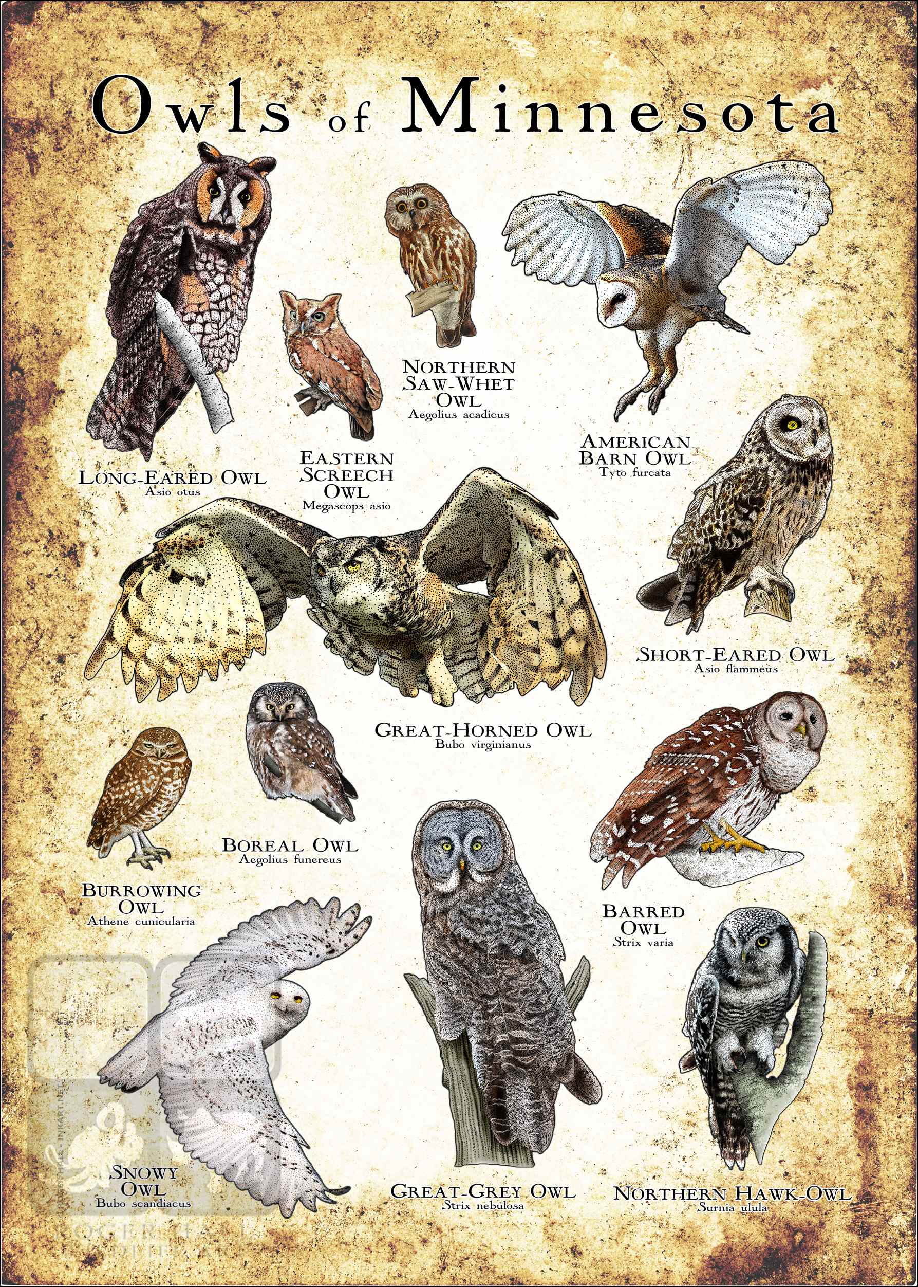 The state of Minnesota in North America has twelve native species of owl. They’re all here on this poster, drawn beautifully and with amazing scientific accuracy. The owl species included: