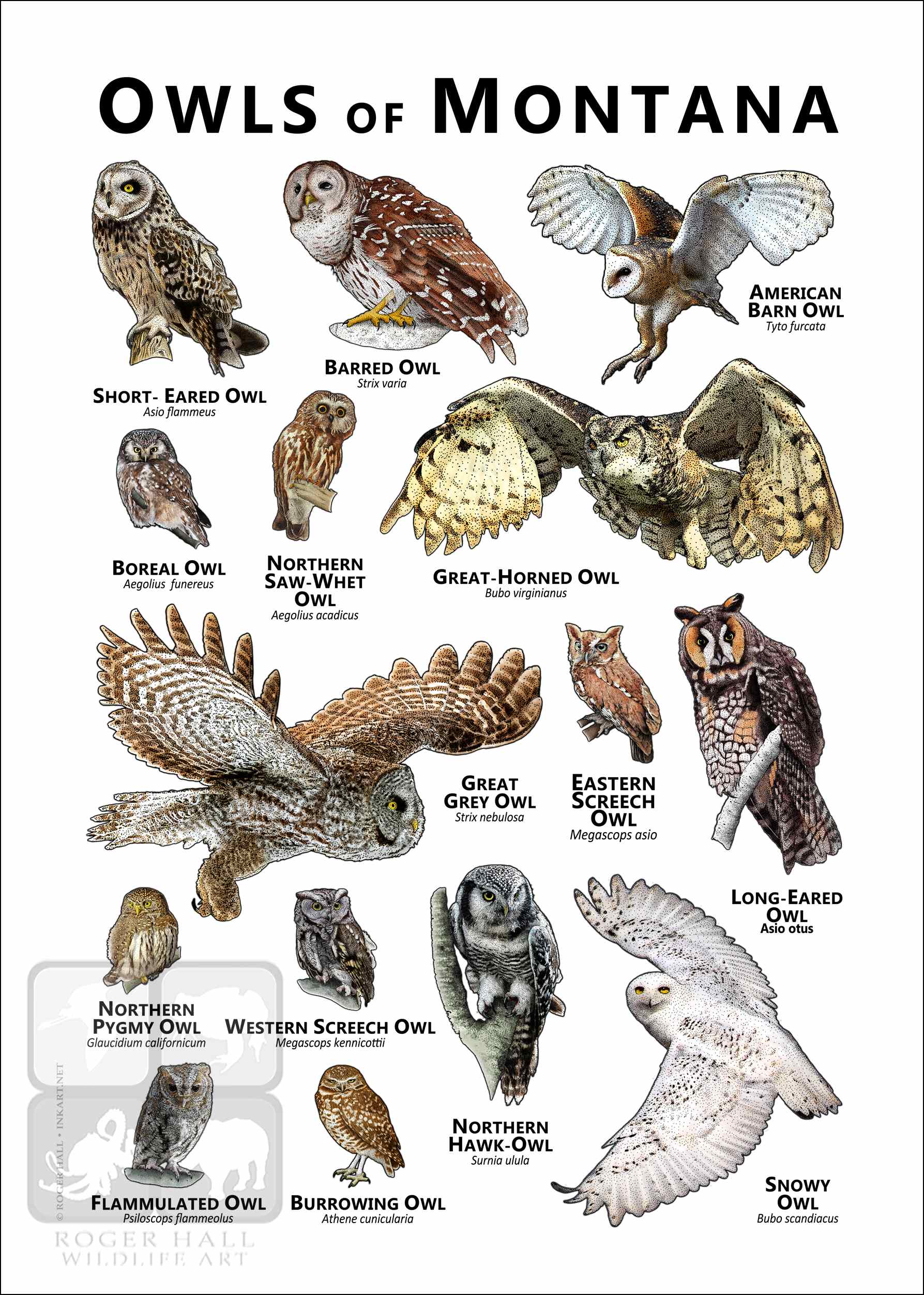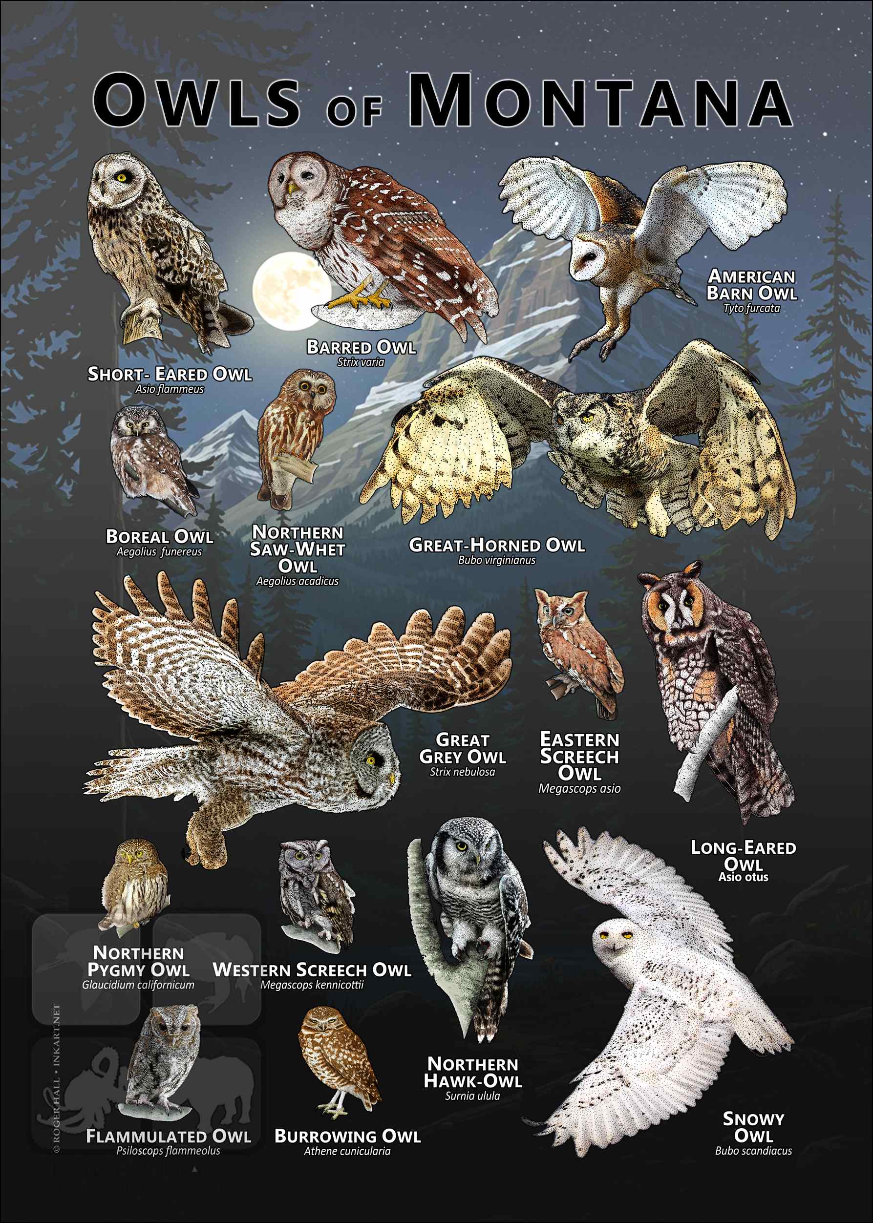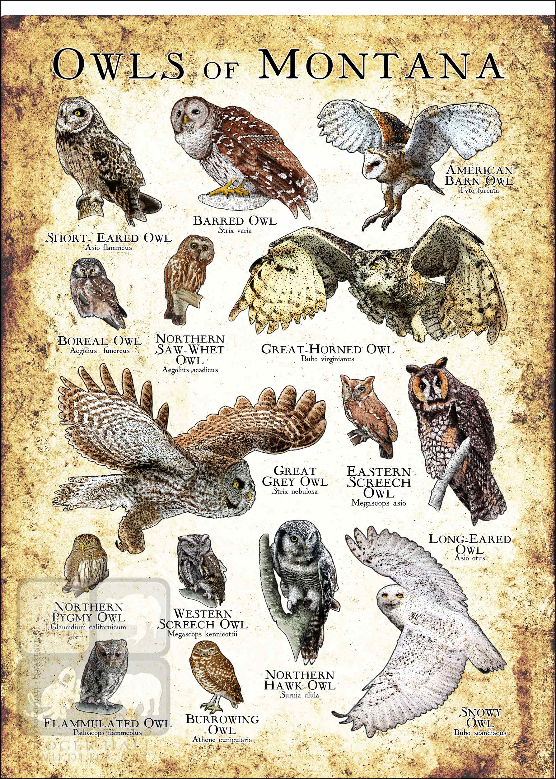 The state of Montana in North America has fourteen native species of owl. They’re all here on this poster, drawn beautifully and with amazing scientific accuracy. The species included: