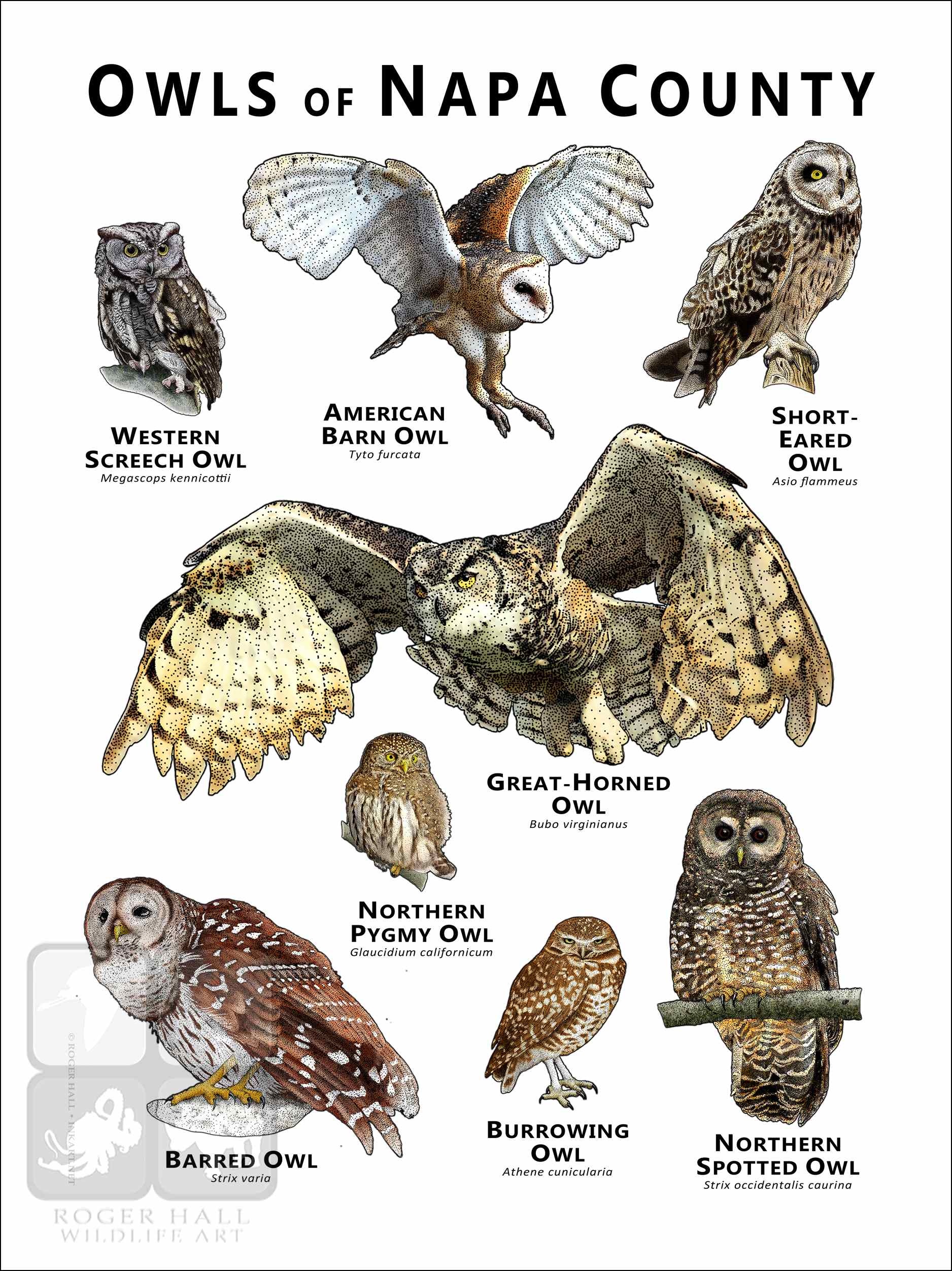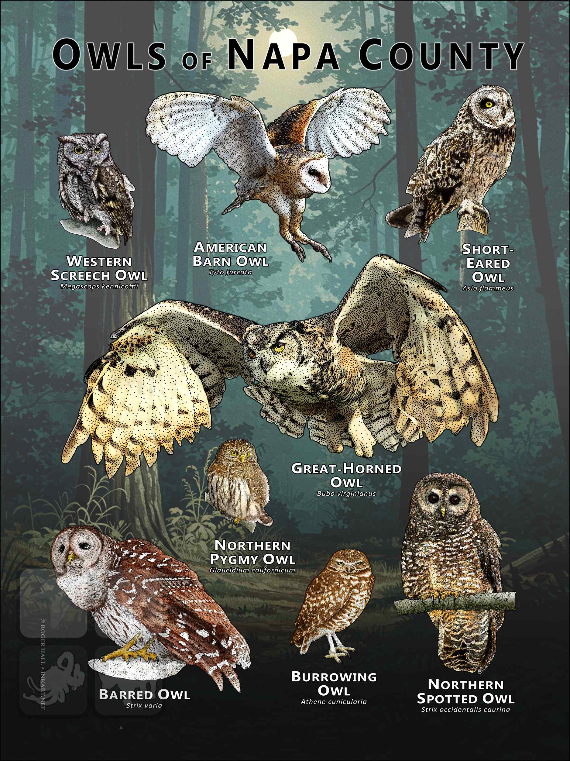 The county of Napa in North America has seven native species of owl. They’re all here on this poster, drawn beautifully and with amazing scientific accuracy. The owl species included: