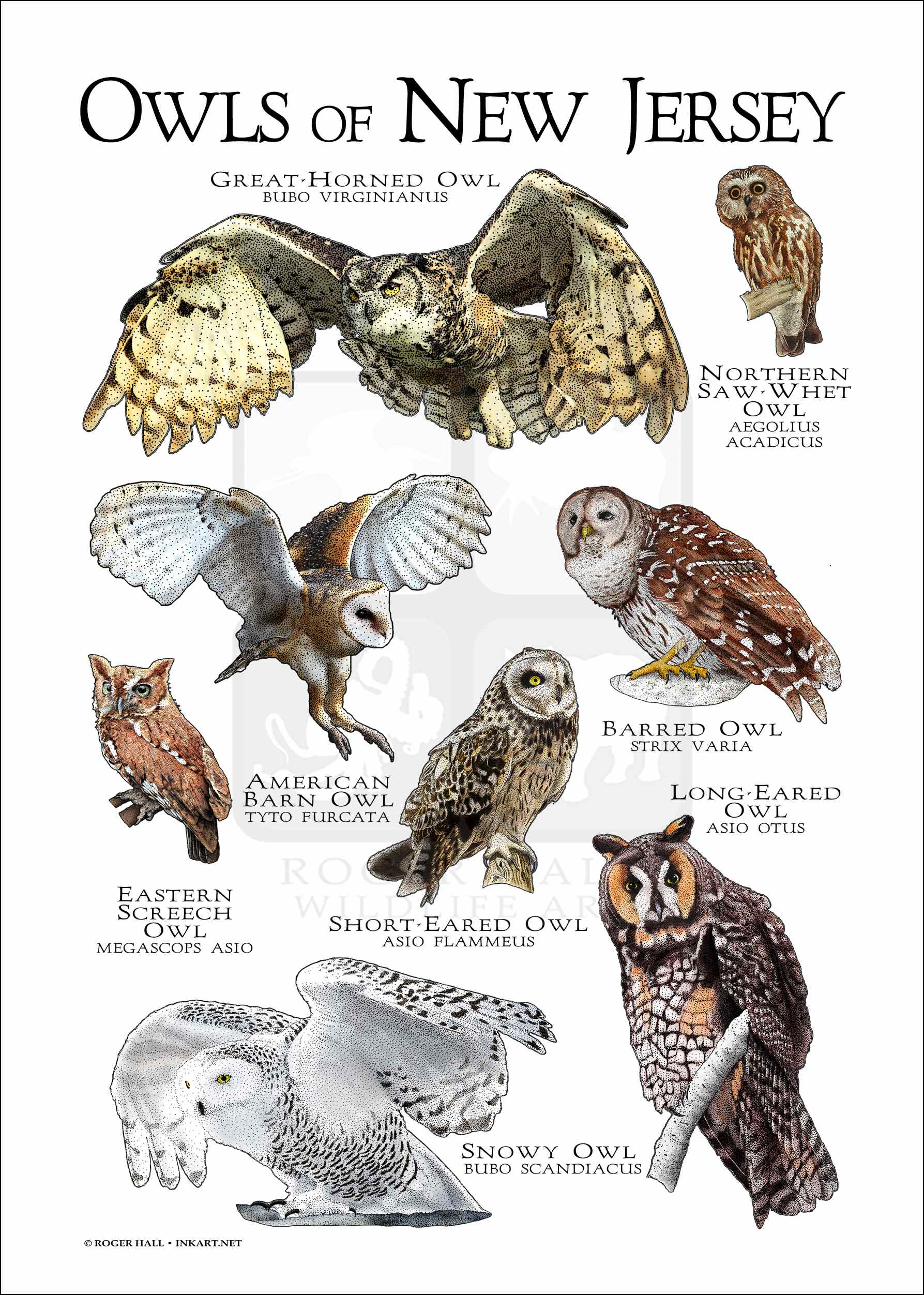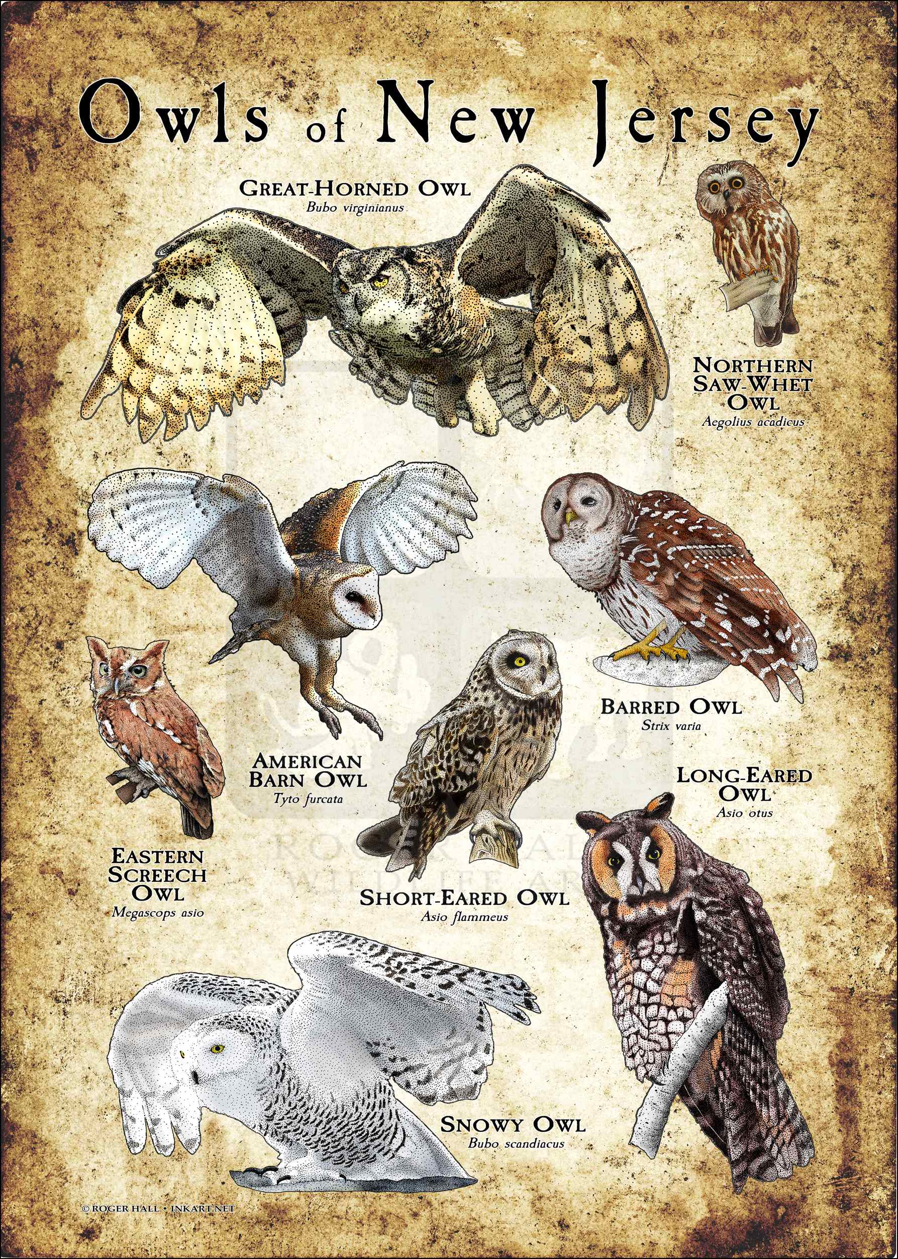The state of New Jersey in North America has eight native species of owl. They’re all here on this poster, drawn beautifully and with amazing scientific accuracy. The owl species included: