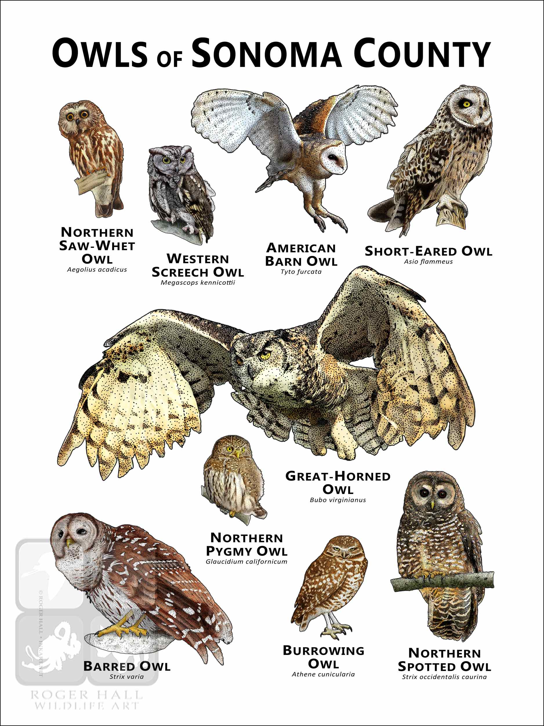 The California county of Sonoma is home to eight species of owls. They’re all here on this poster, drawn beautifully and with amazing scientific accuracy. The owl species included: