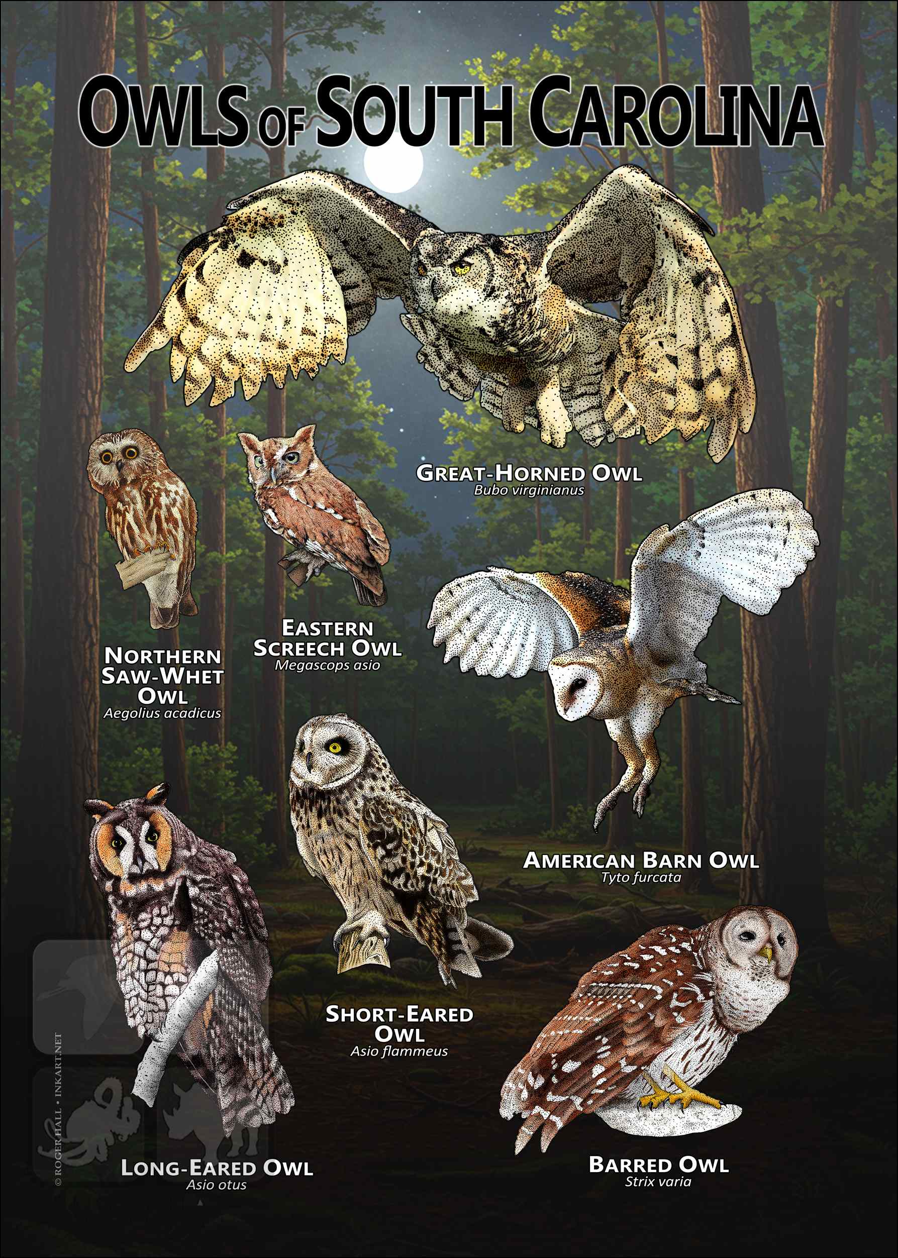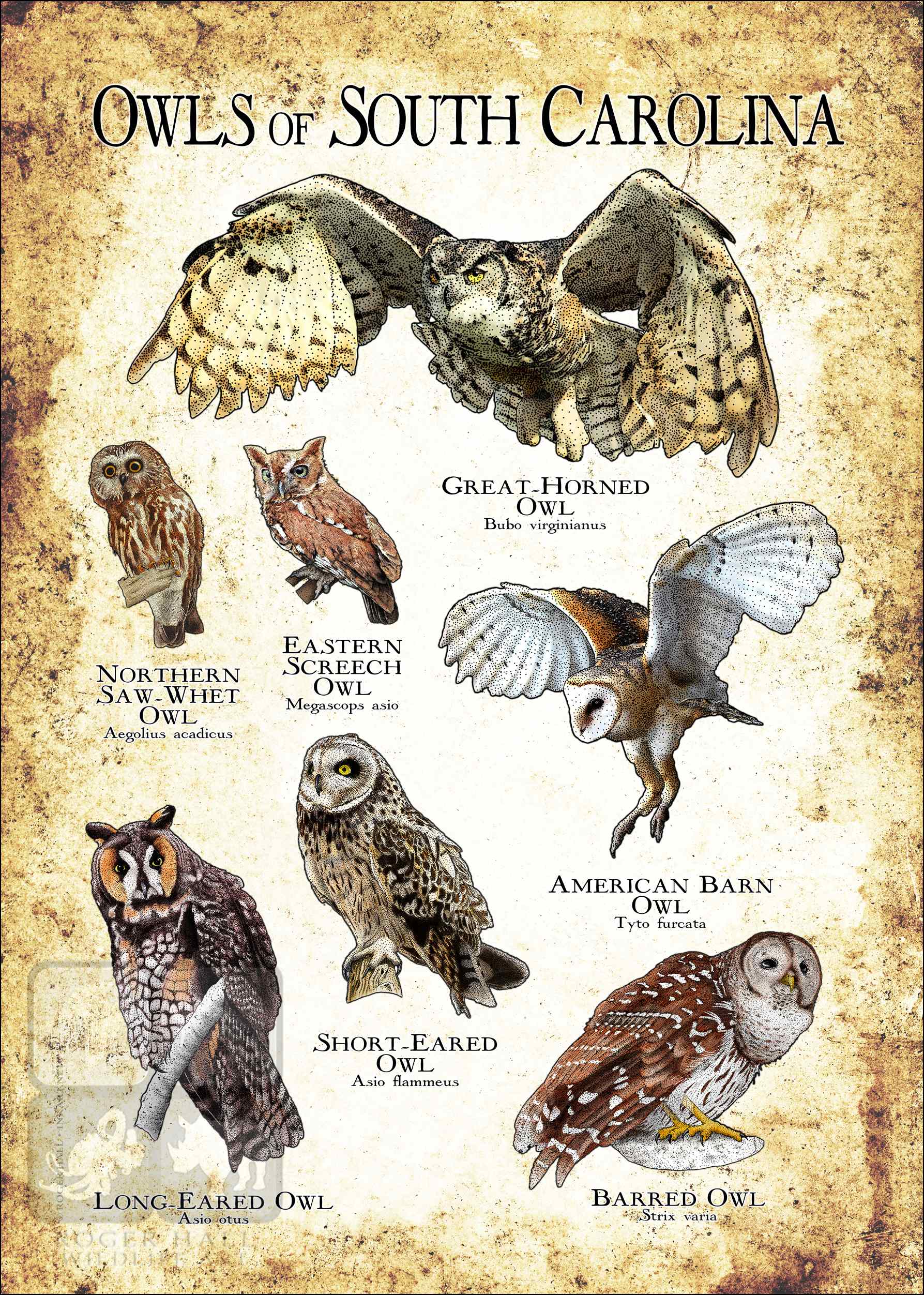 The state of South Carolina in North America has seven native species of owl. They’re all here on this poster, drawn beautifully and with amazing scientific accuracy. The owl species included: