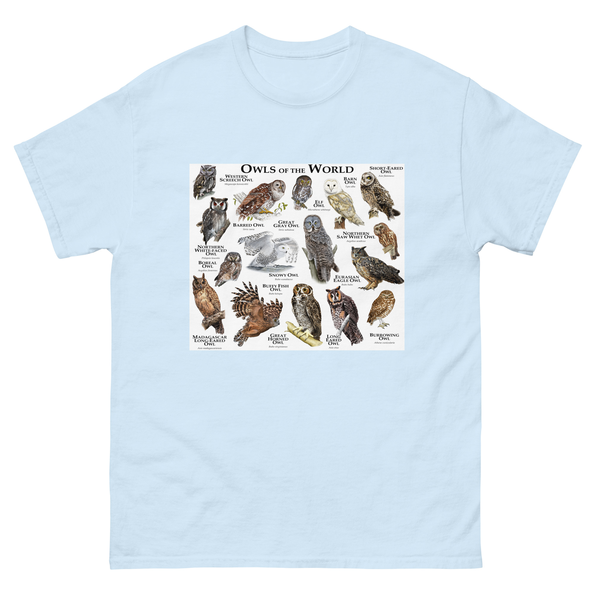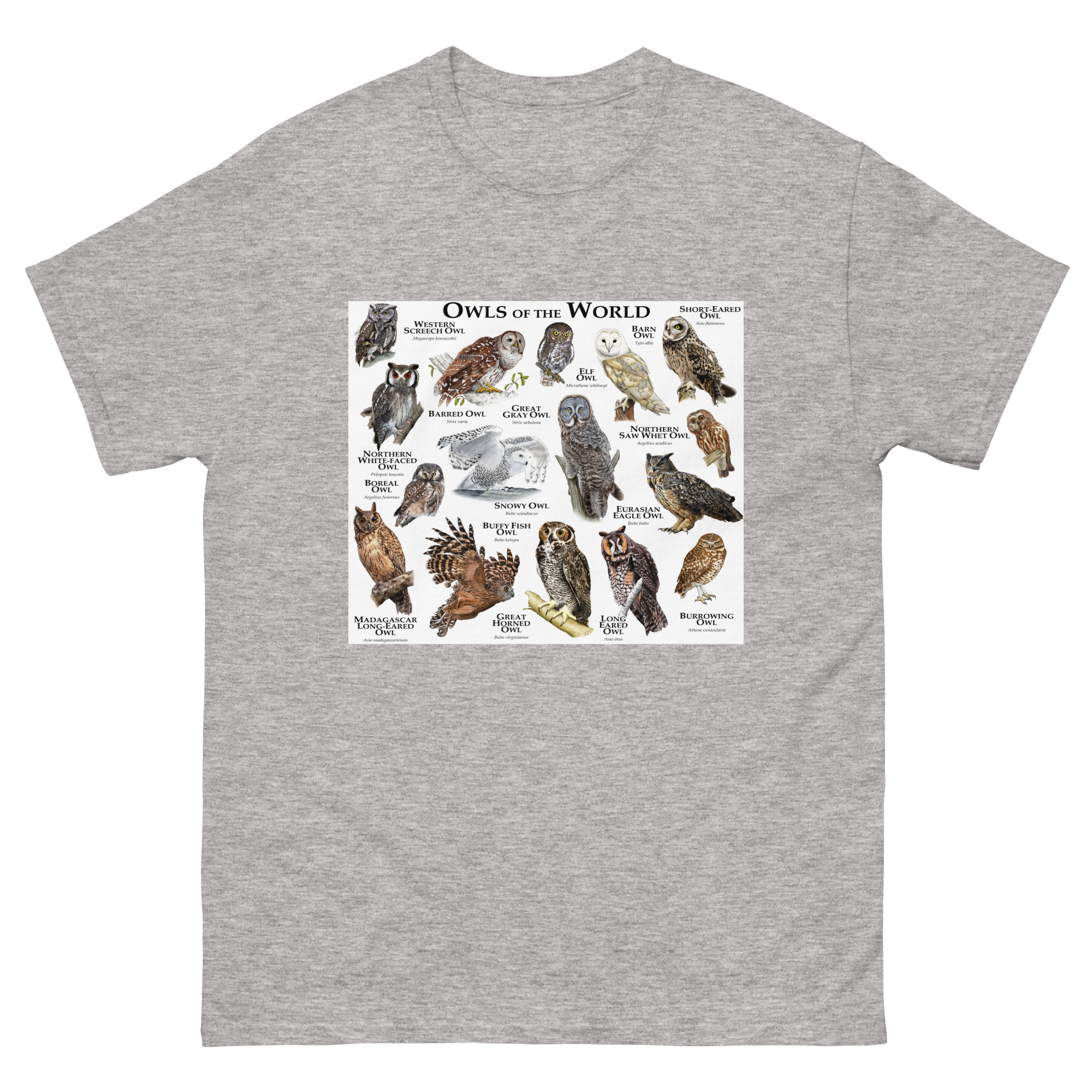 There are about 250 species of owls in the world. They live on every continent except icy Antarctica. Owls belong to a group of birds called Strigiformes. That group is divided into two smaller groups, known as families. This artwork features fine art illustrations of various species of owl (Strigiformes) printed on a high-quality men’s cotton t-shirt.