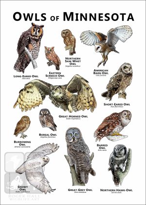 AMERICAN BARN OWL (Tyto furcata) • BARRED OWL (Strix varia) • BOREAL OWL (Aegolius funereus) • BURROWING OWL (Athene cunicularia) • FLAMMULATED OWL (Psiloscops flammeolus) • GREAT GRAY OWL (Strix nebulosa) • GREAT-HORNED OWL (Bubo virginianus) • LONG-EARED OWL (Asio otus) • NORTHERN SPOTTED OWL (Strix occidentalis caurina) • NORTHERN PYGMY OWL (Glaucidium californicum) • NORTHERN SAW WHET OWL (Aegolius acadicus) • SHORT-EARED OWL (Asio flammeus) • SNOWY OWL (Bubo scandiacus) • WESTERN SCREECH OWL (Megascops kennicottii)