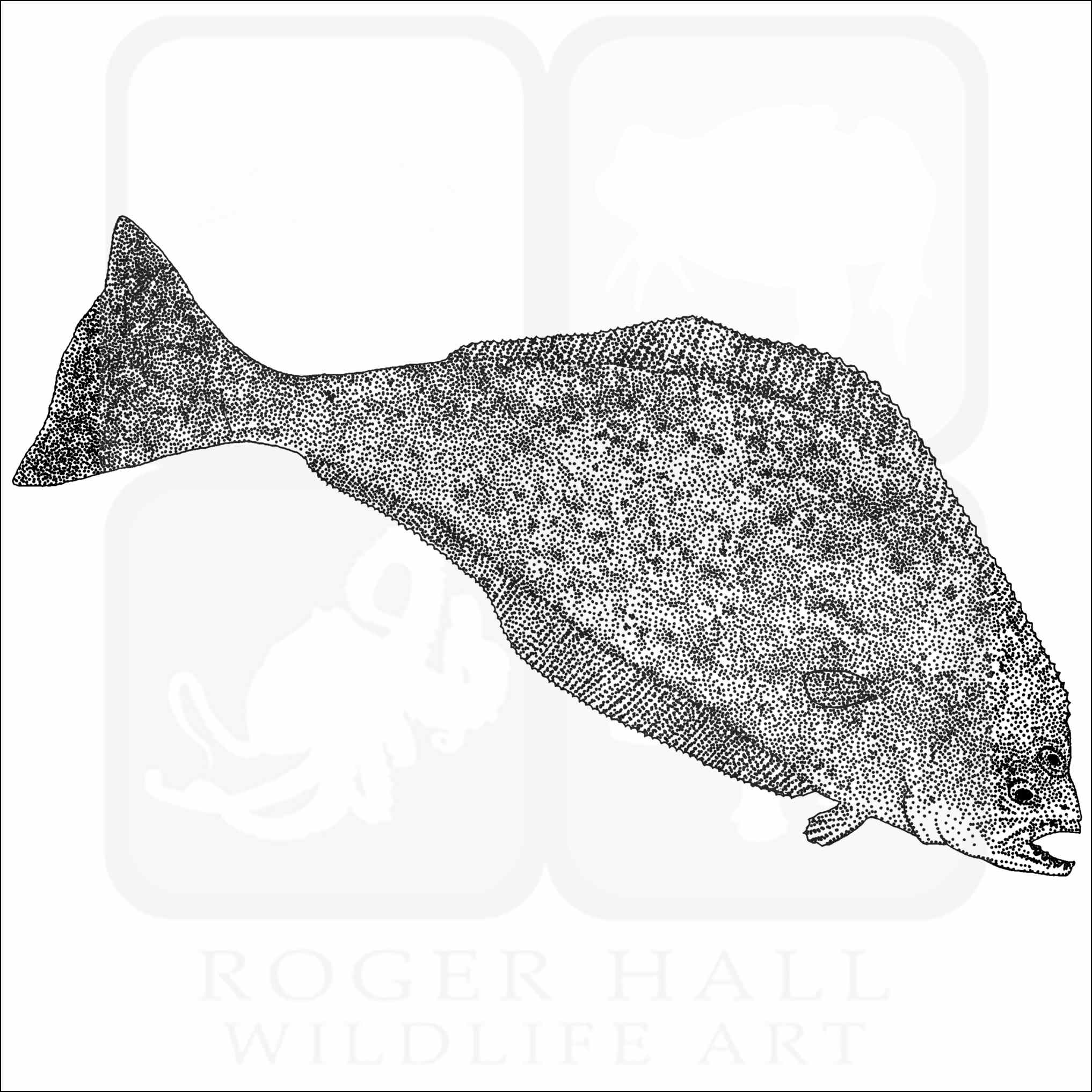 Fine art illustration of a Pacific Halibut (Hippoglossus stenolepis.) The illustration is available in black and white or color.