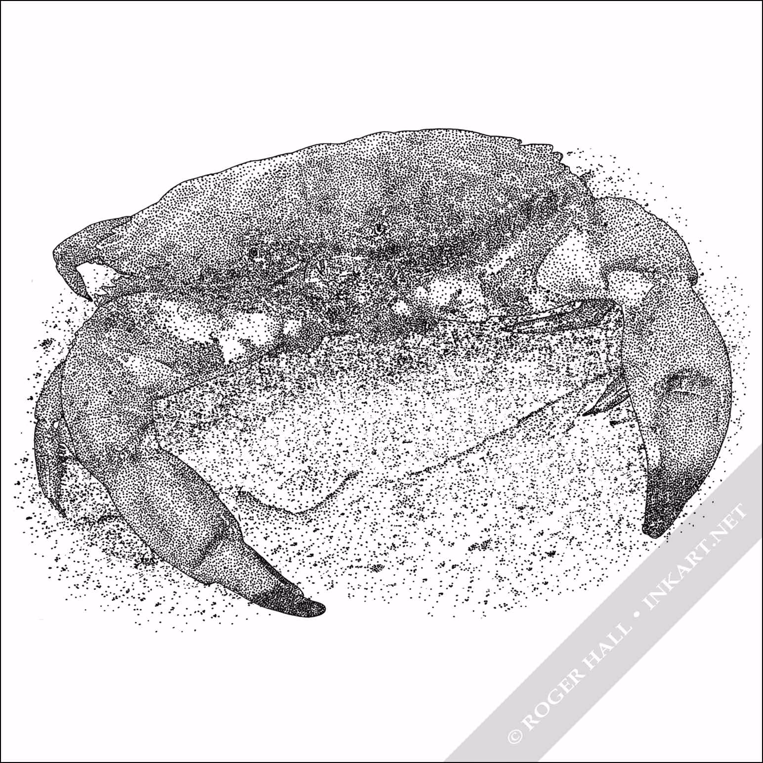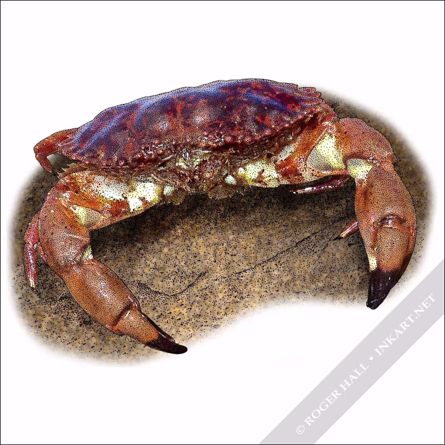 Fine art illustration of a Pacific Rock Crab (Romaleon antennarium.) The illustration is available in black and white or color.