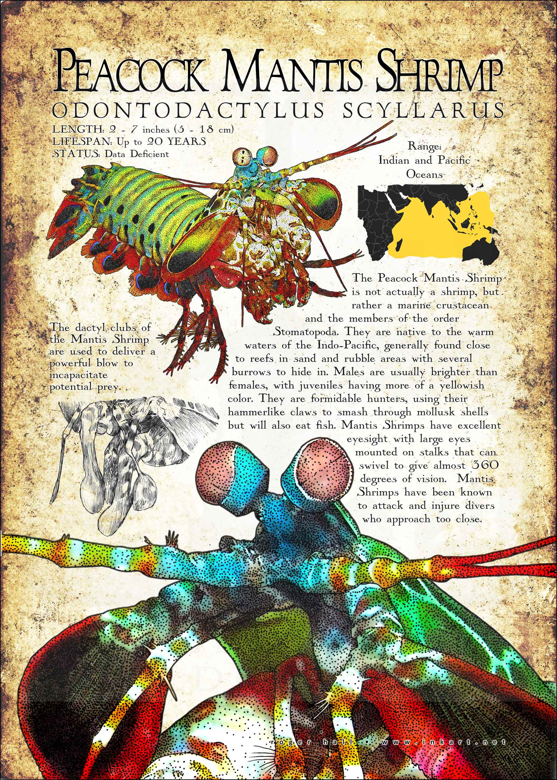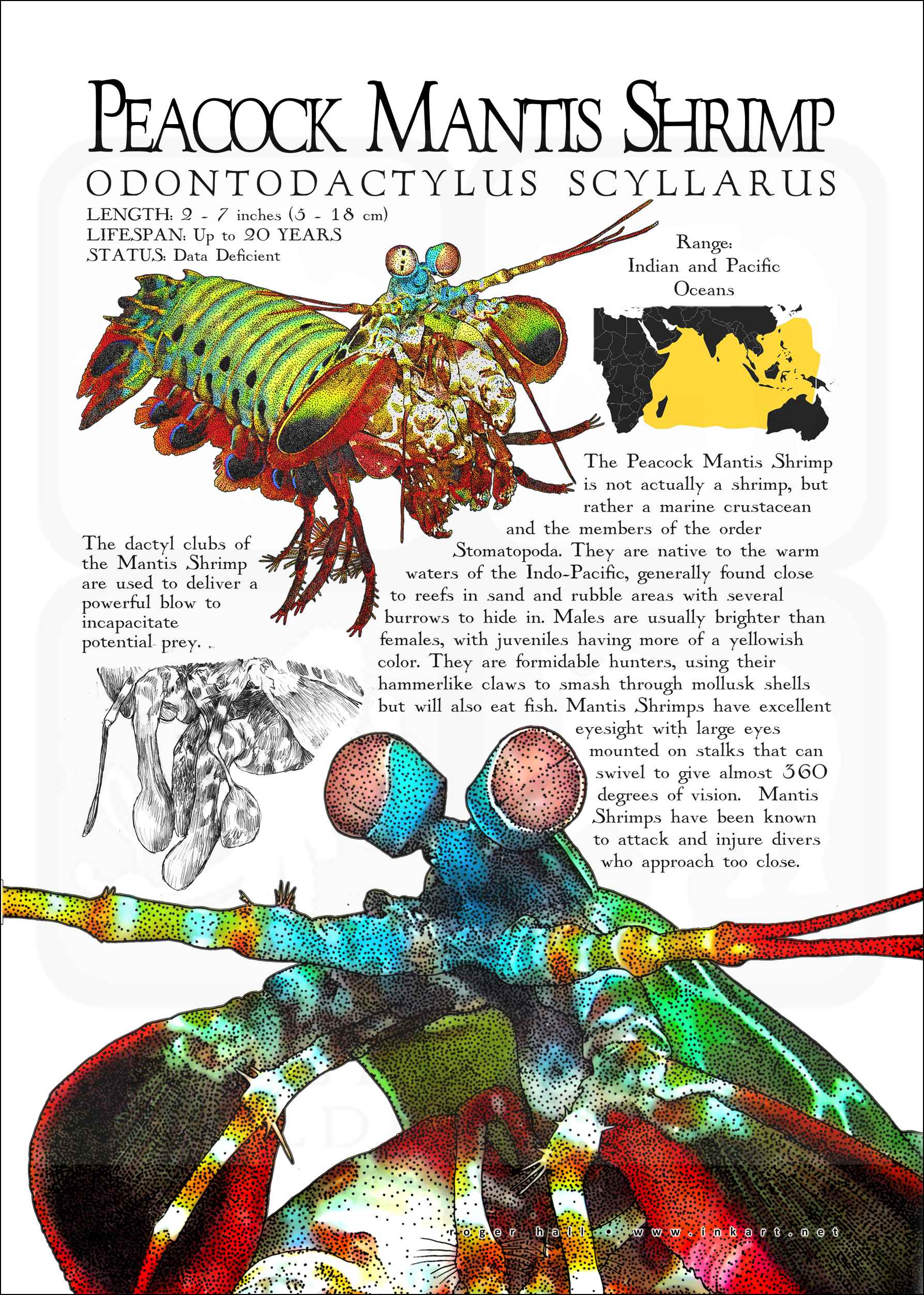 This poster features an informational graphic of the Peacock Mantis Shrimp (Odontodactylus scyllarus). It includes a map of the crustacean’s range, along with three illustrations and a small paragraph with information about animal.