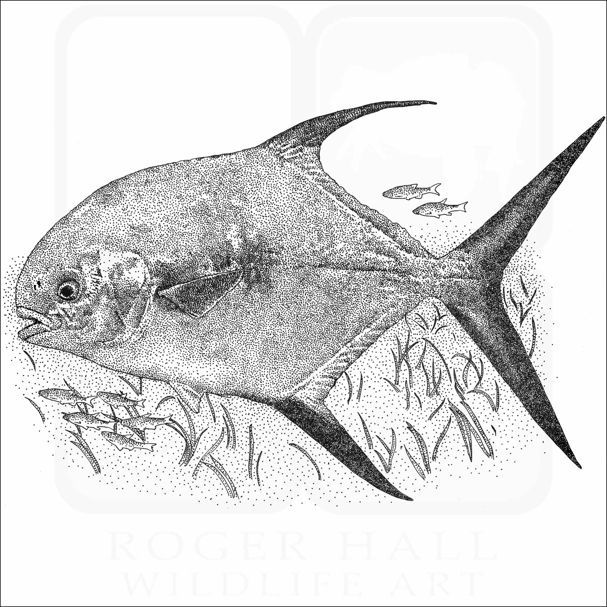Fine art illustration of a Permit (Trachinotus falcatus.) The illustration is available in black and white or color.