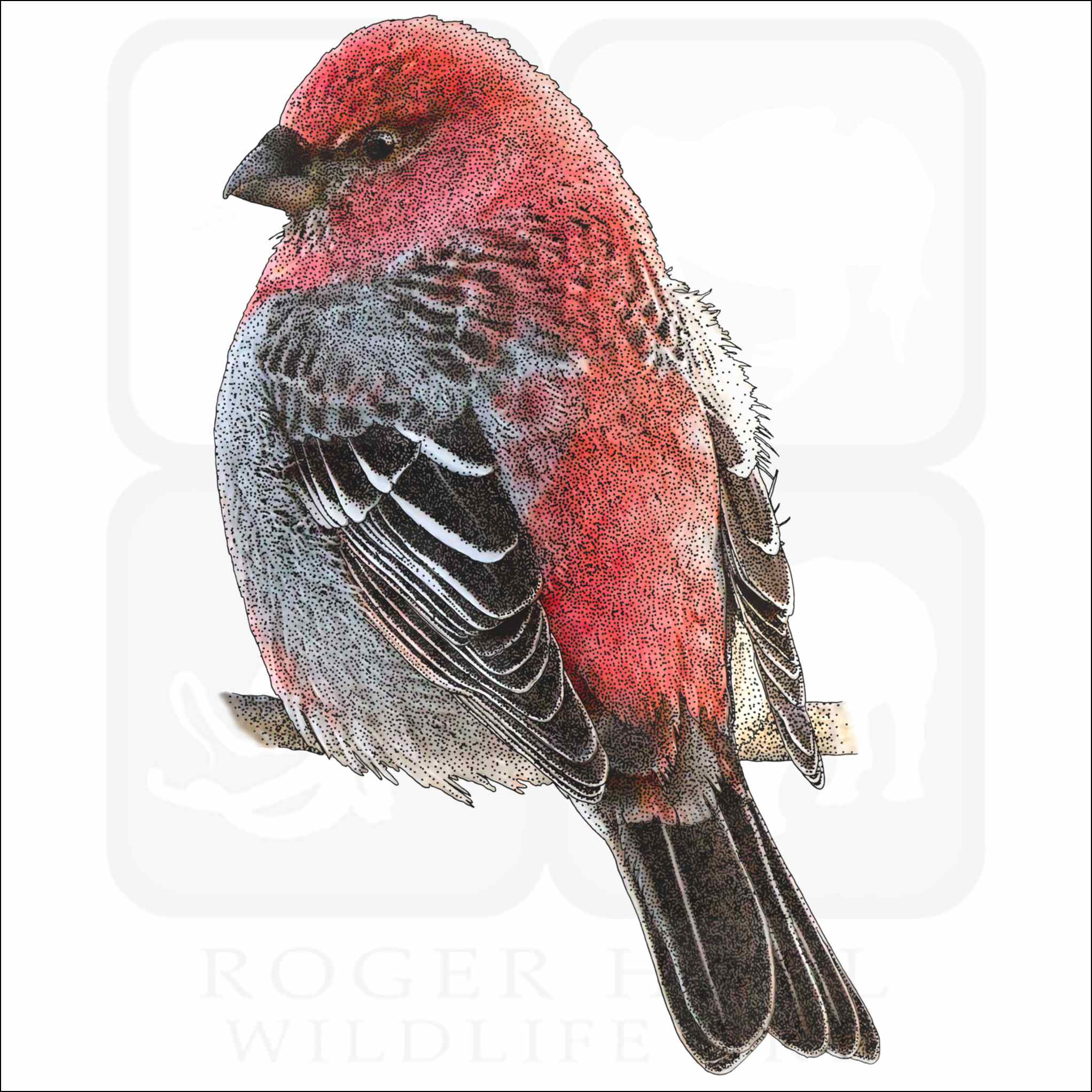 Fine art illustration of a Pine Grosbeak (Pinicola enucleator.)