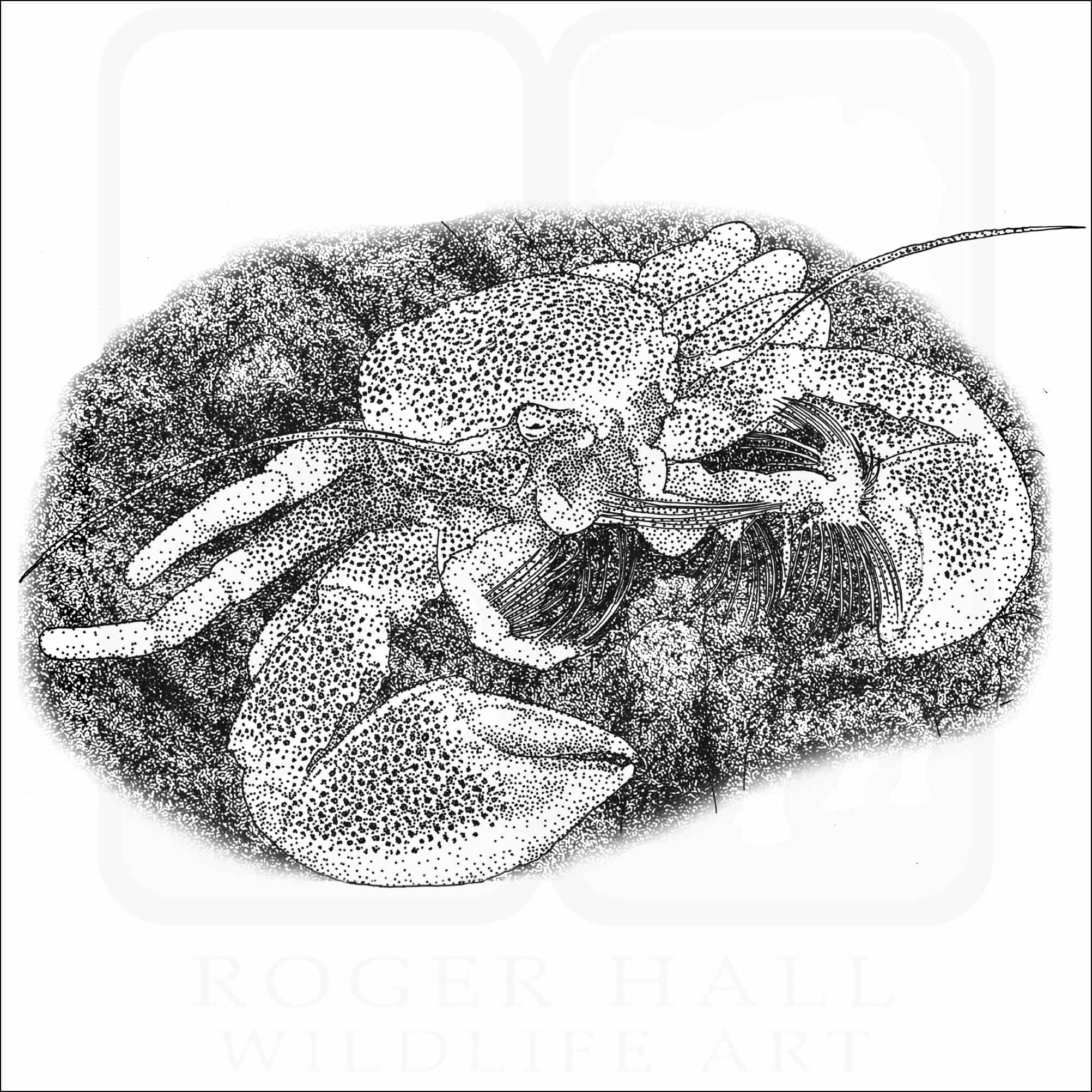 Fine art illustration of a Porcelain Anemone Crab (Neopetrolisthes ohshimai.) The illustration is available in black and white or color.