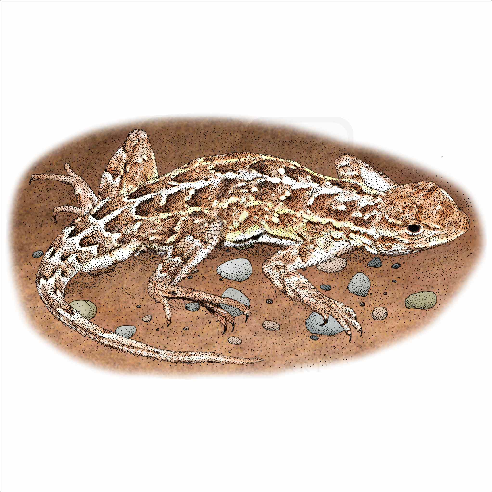 Fine art illustration of a Prairie or Eastern Earless Lizard (Holbrookia maculata perspicua.)Â The illustration is available in black and white or color.