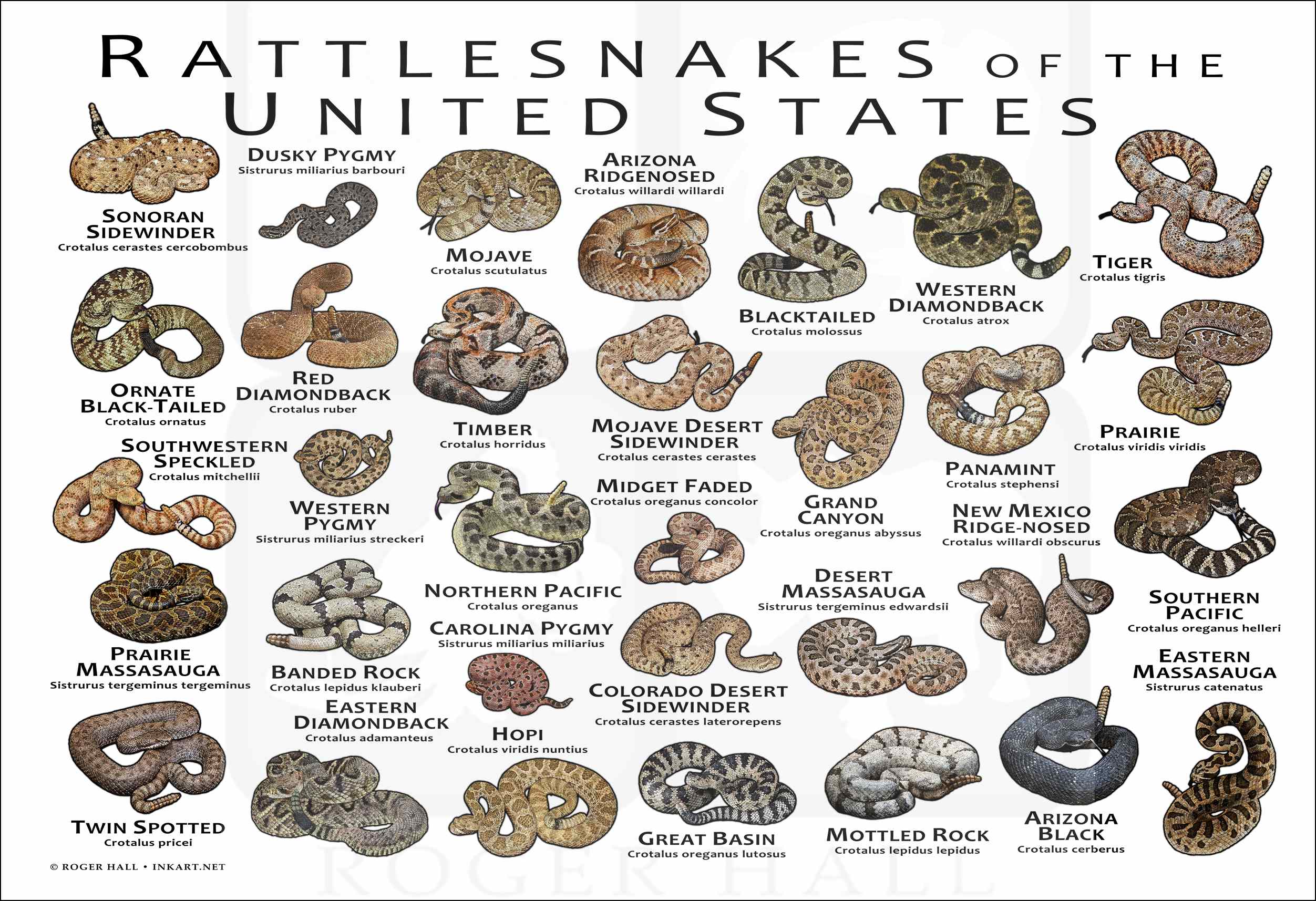 The United States of America is home to many amazing species of rattlesnakes. On this poster-print are images of all species and subspecies native to the lower 48 states of the US.