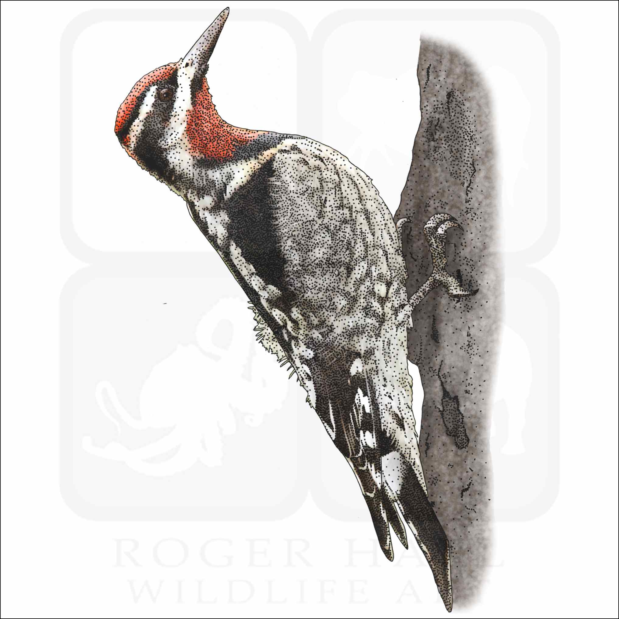 Fine art illustration of a Red-Naped Sapsucker (Sphyrapicus nuchalis.) The illustration is available in black and white or color.